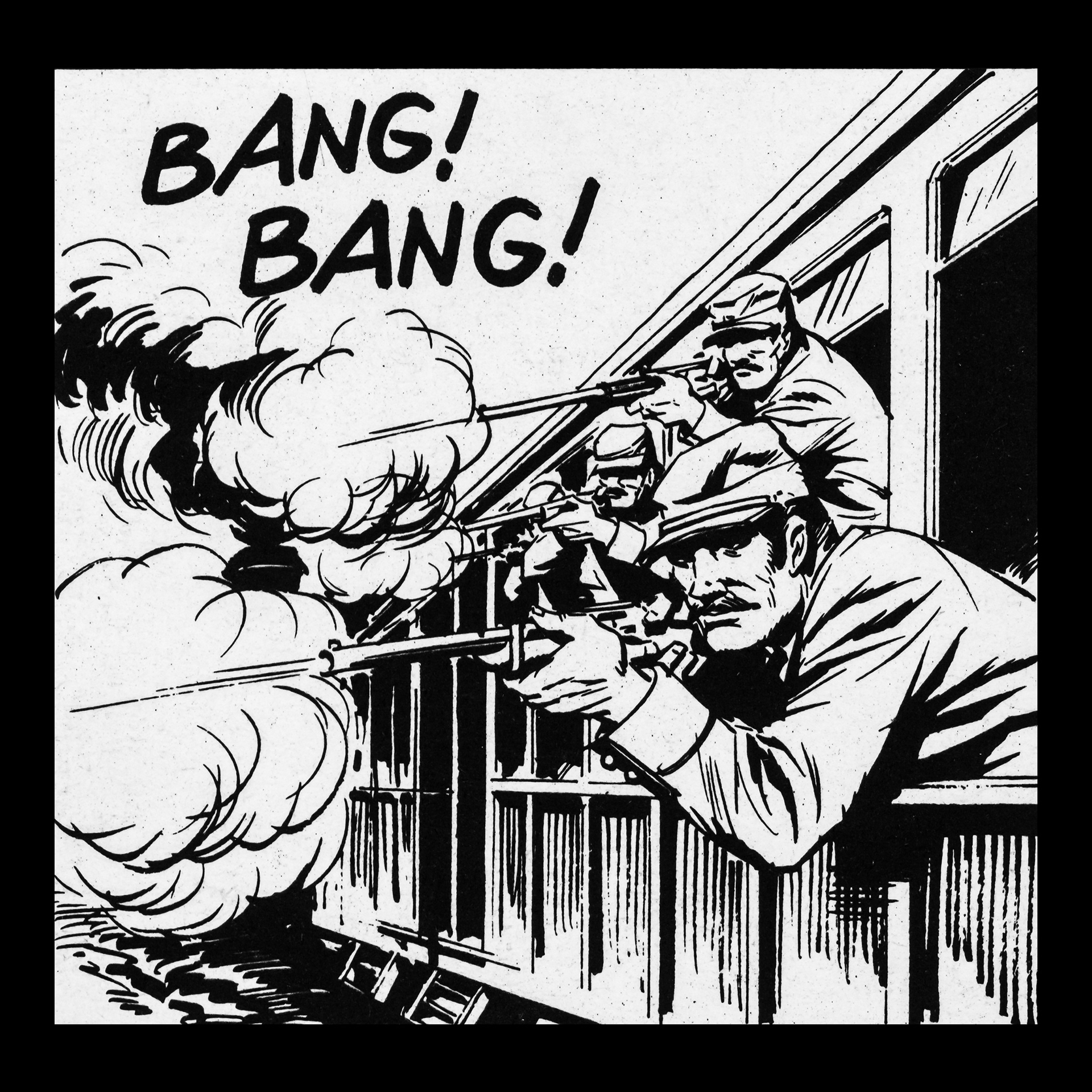 Repetition does not intensify the gesture, but empties it: the gunshot loses its exceptional nature and dramatic weight, conflict and death are reduced to minimal units of information, and "Bang" is no longer a sound, but evidence of how the seriality of images can turn violence into a pattern of forms, rhythm, and contrasts.
