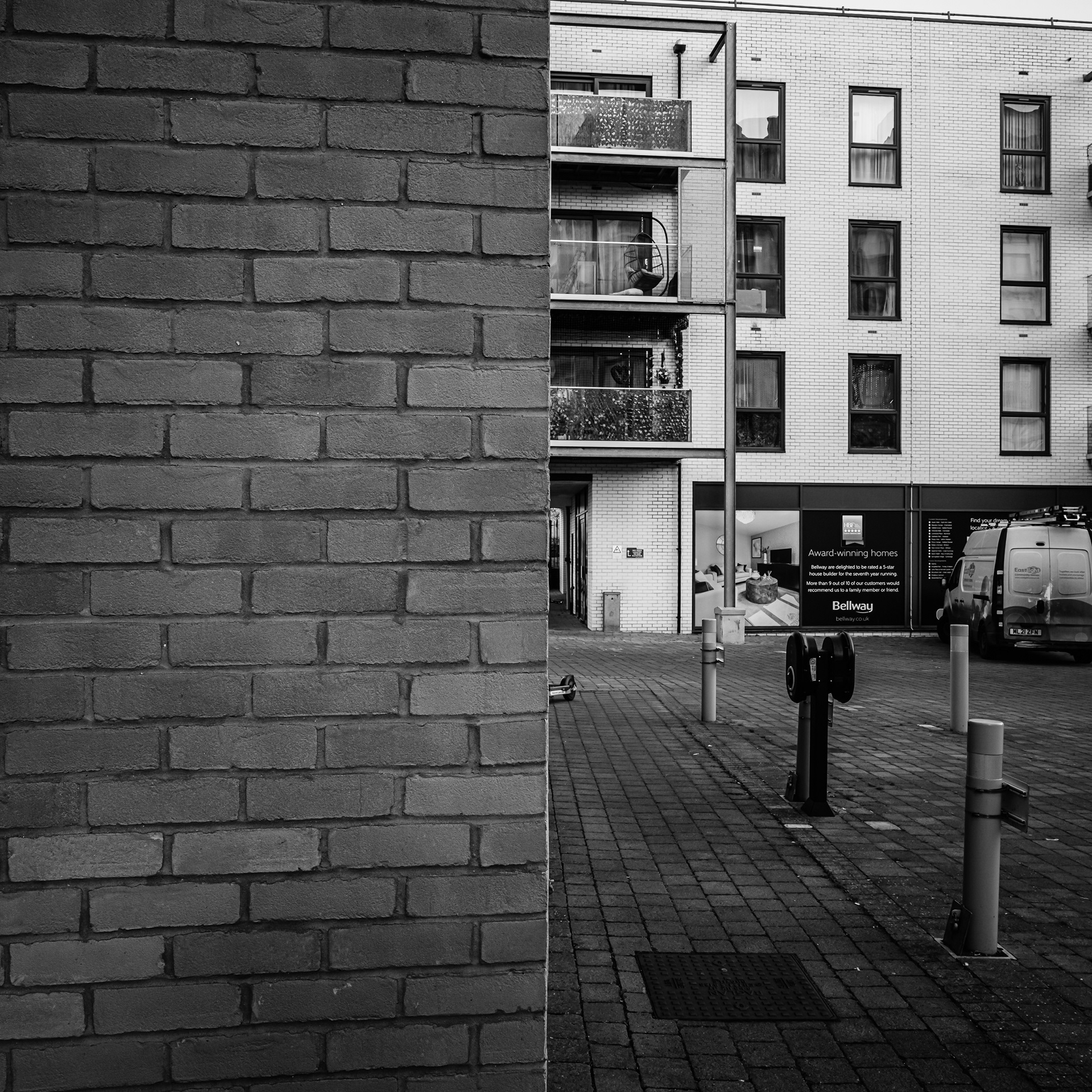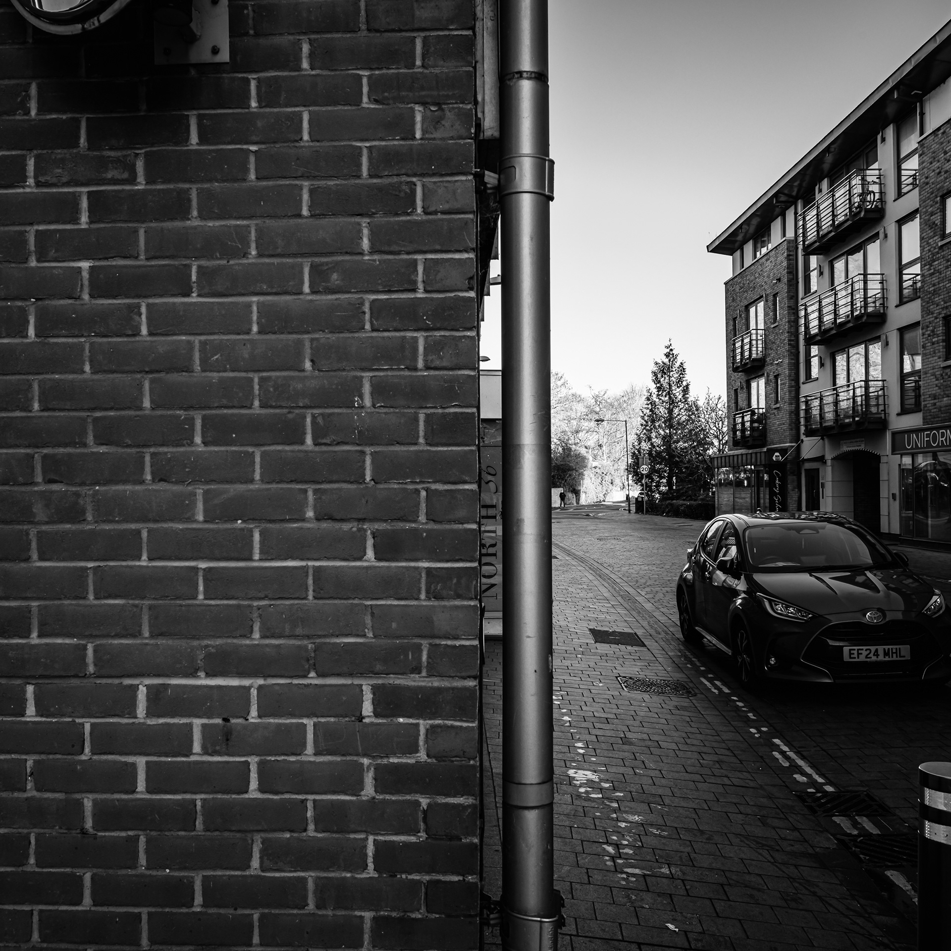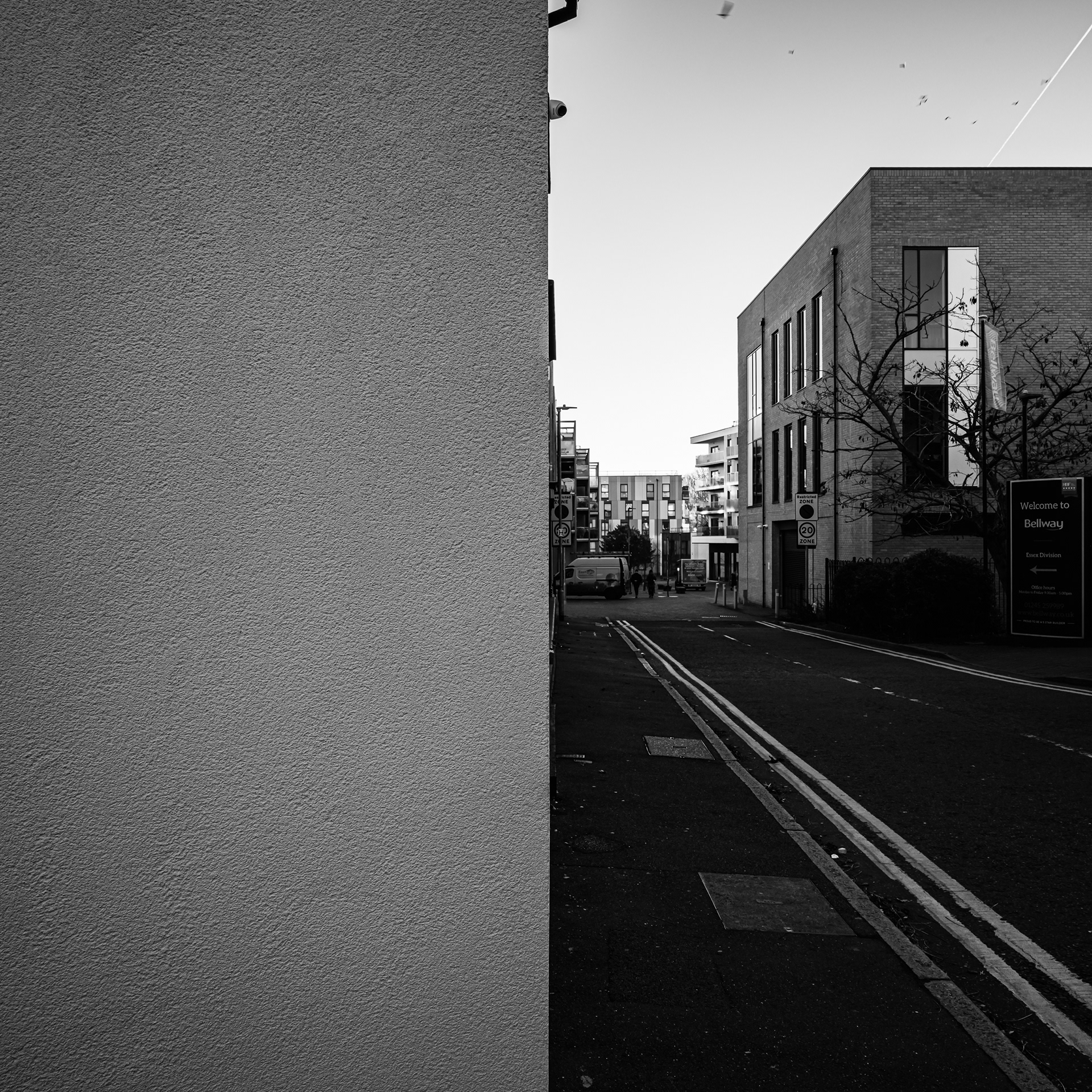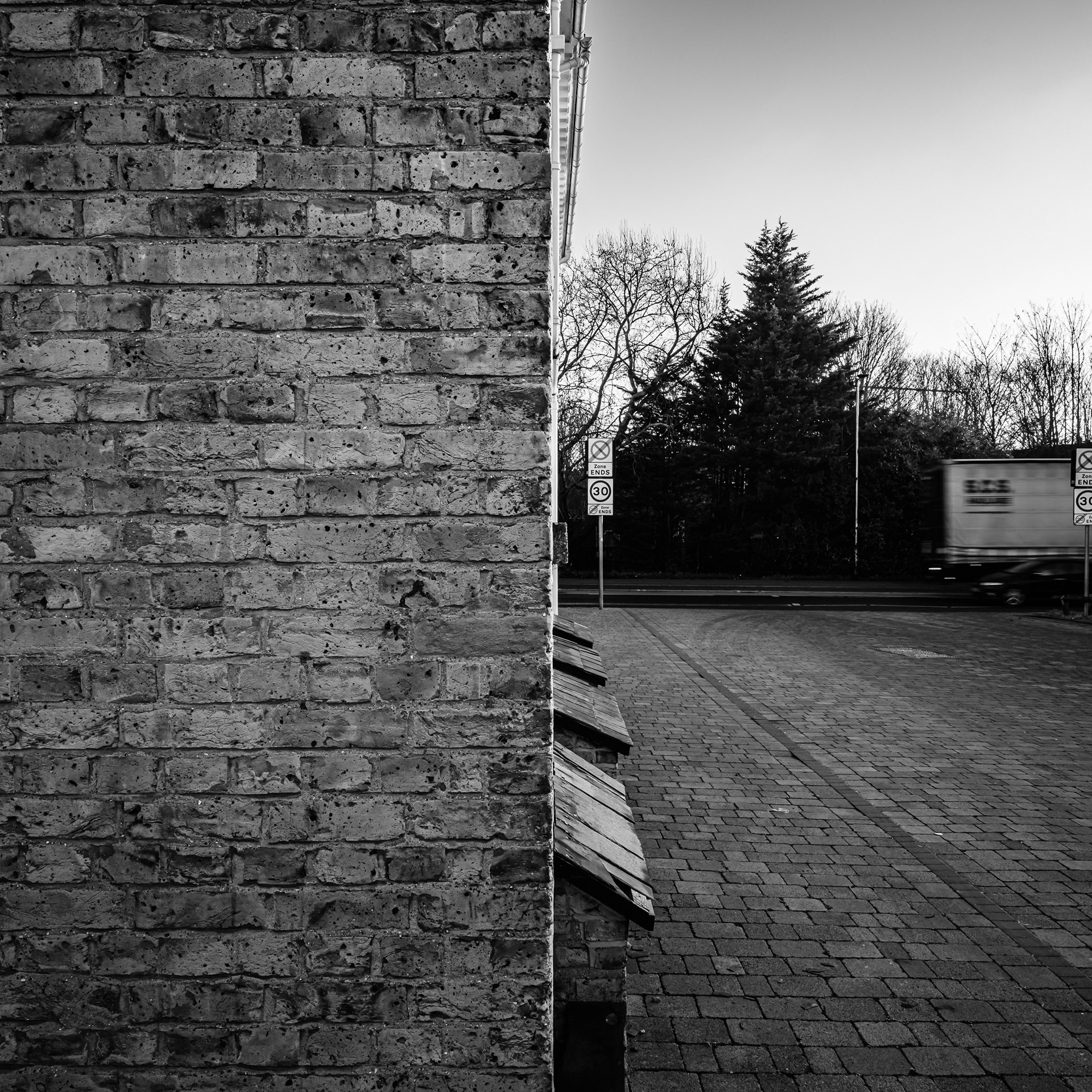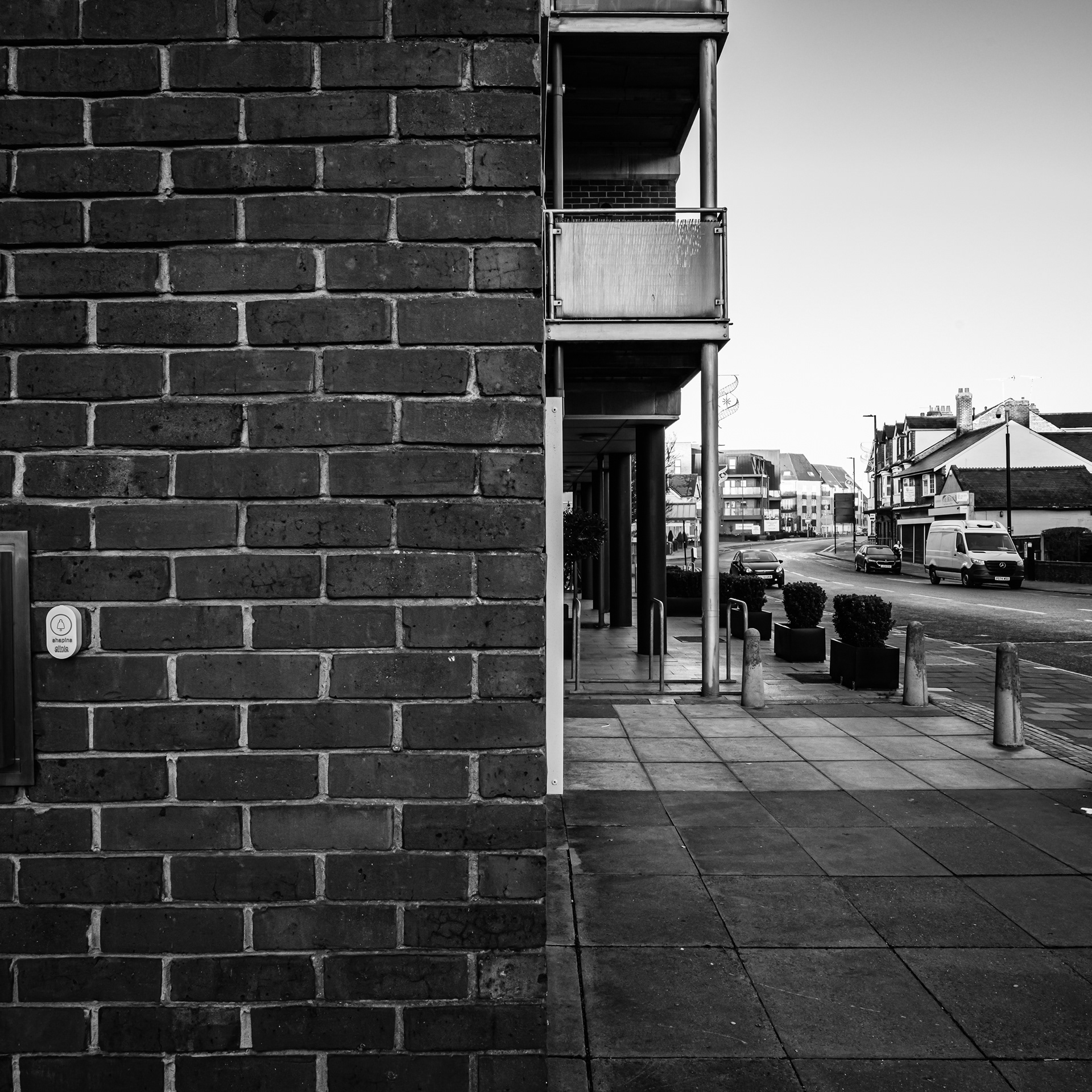 In this series of pictures I divided the frame into two sharp zones using architectural elements as screens: an opaque mass occupying half of the surface and a sliver of urban reality persisting in the other half. The act of photographing becomes a practice of systematic subtraction, where the building ceases to be a volume and is transformed into a visual obstacle that denies depth and forces the eye to focus on an isolated fragment.