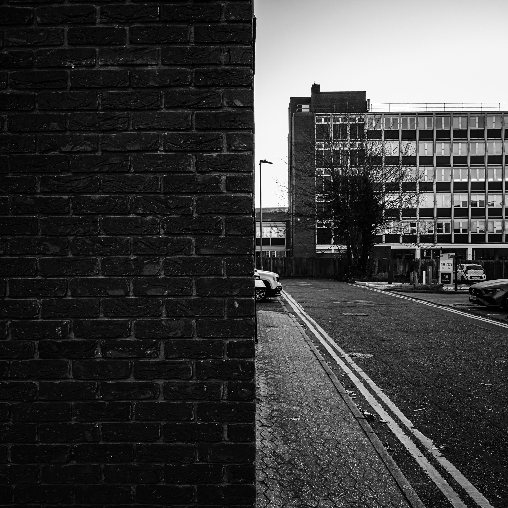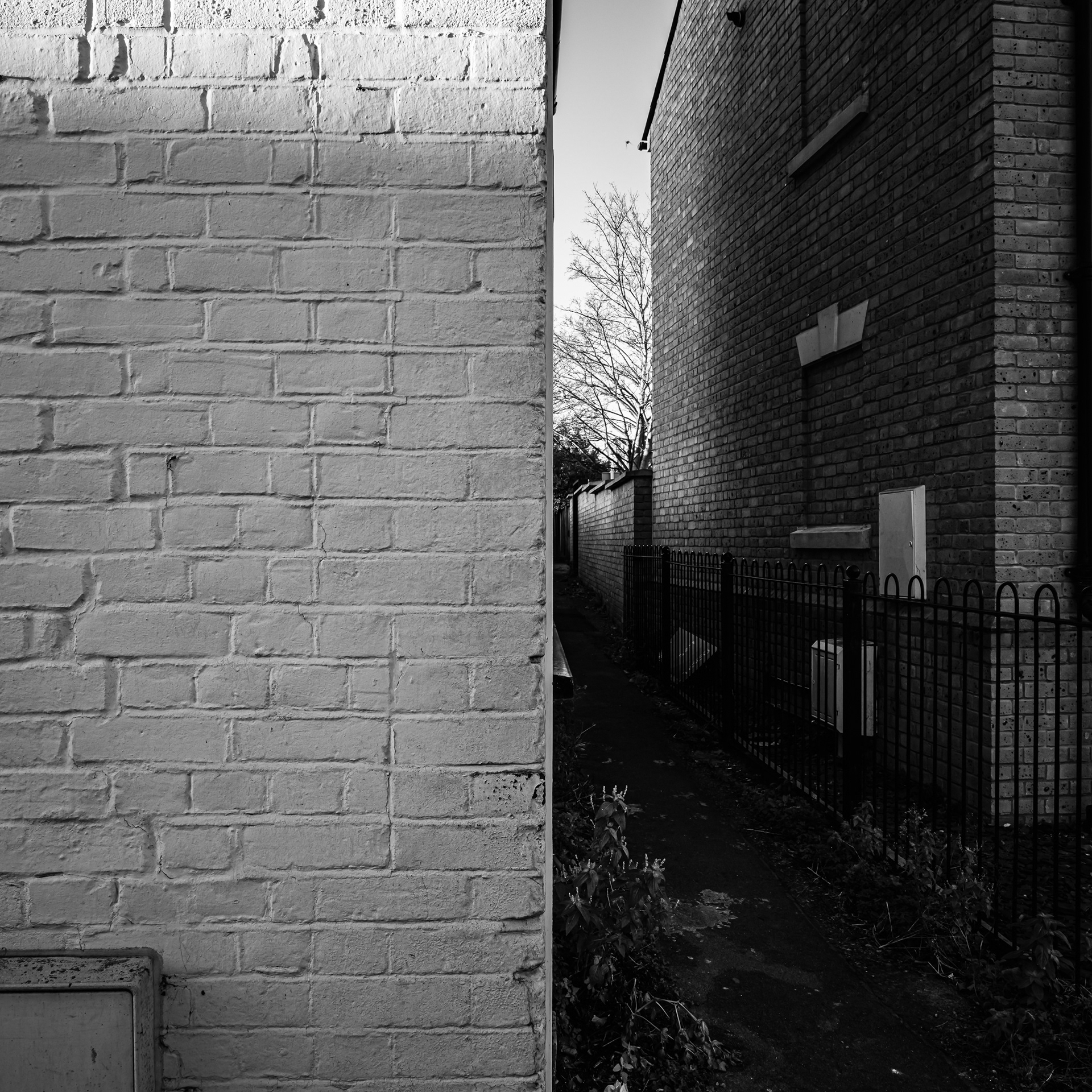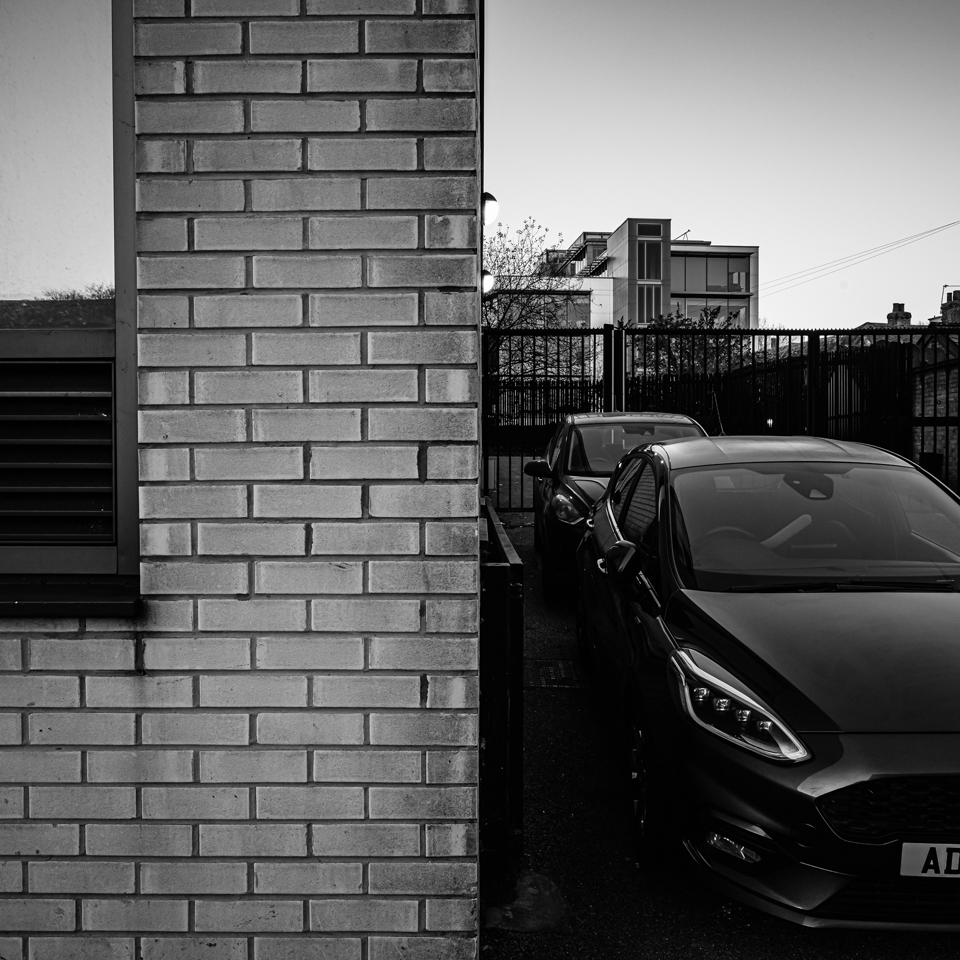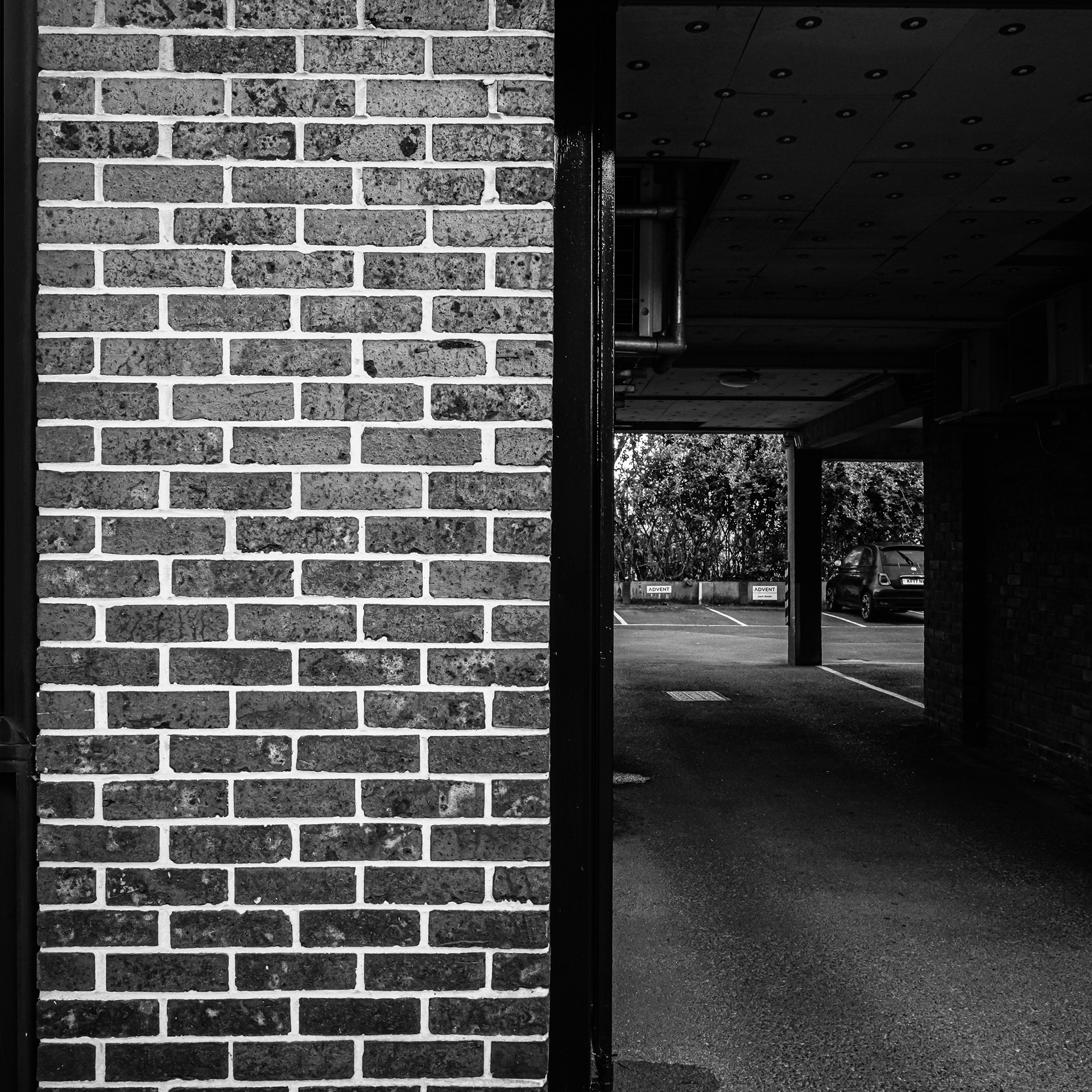 In this series of pictures I divided the frame into two sharp zones using architectural elements as screens: an opaque mass occupying half of the surface and a sliver of urban reality persisting in the other half. The act of photographing becomes a practice of systematic subtraction, where the building ceases to be a volume and is transformed into a visual obstacle that denies depth and forces the eye to focus on an isolated fragment.