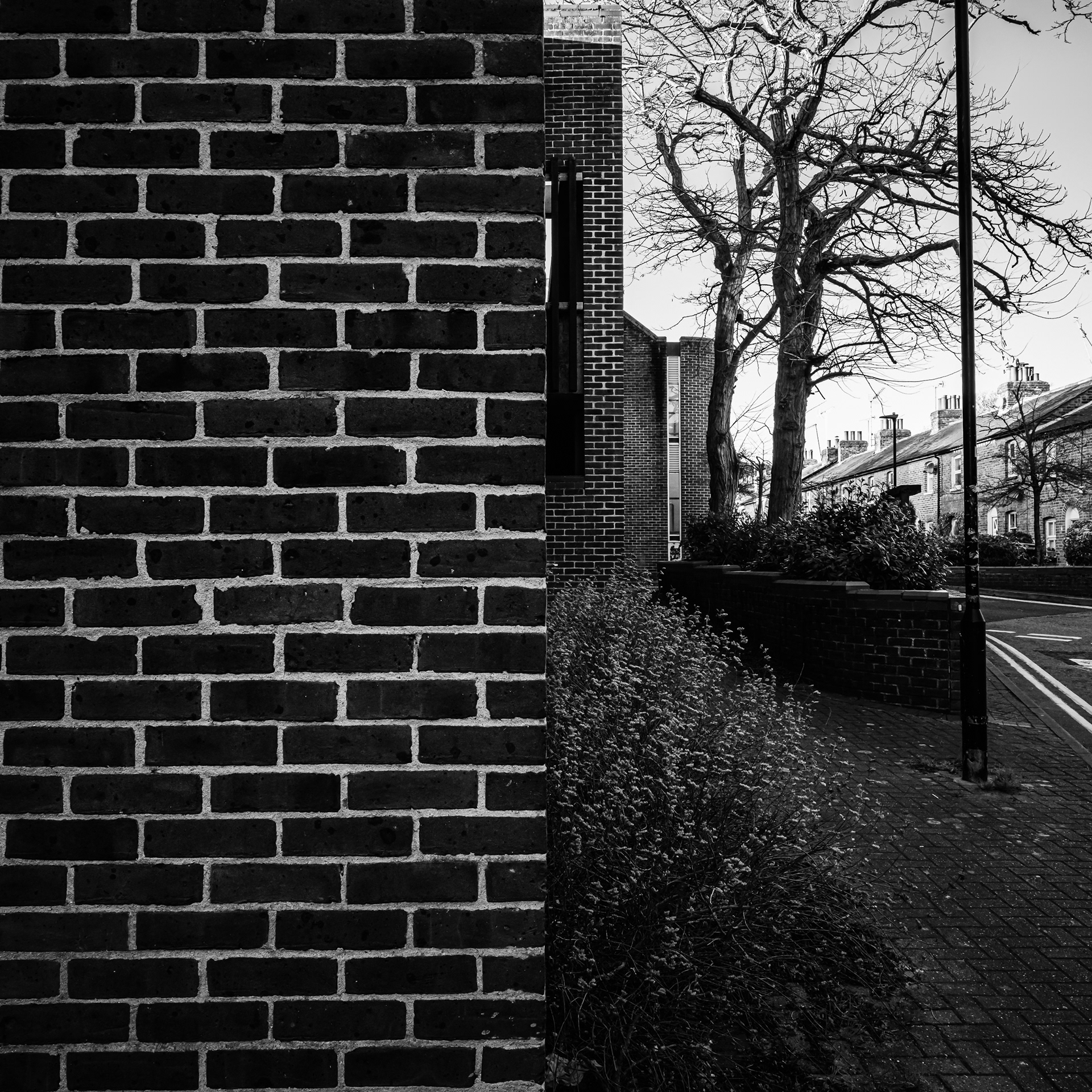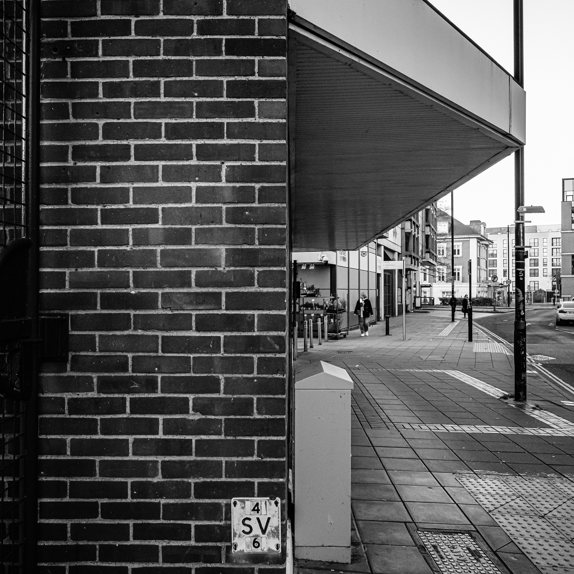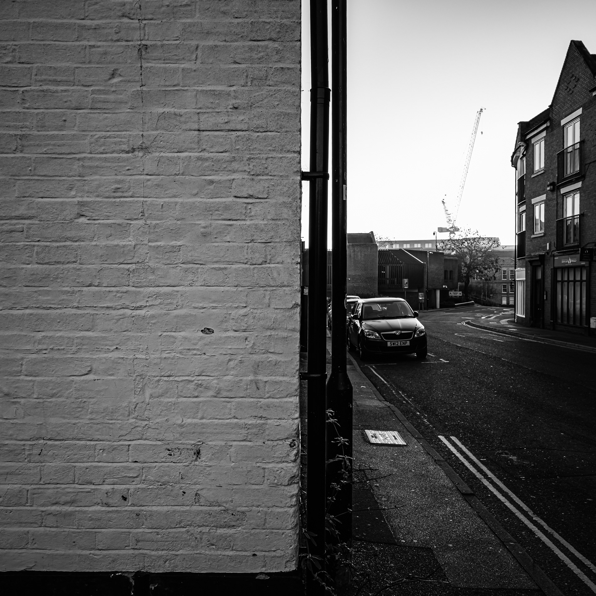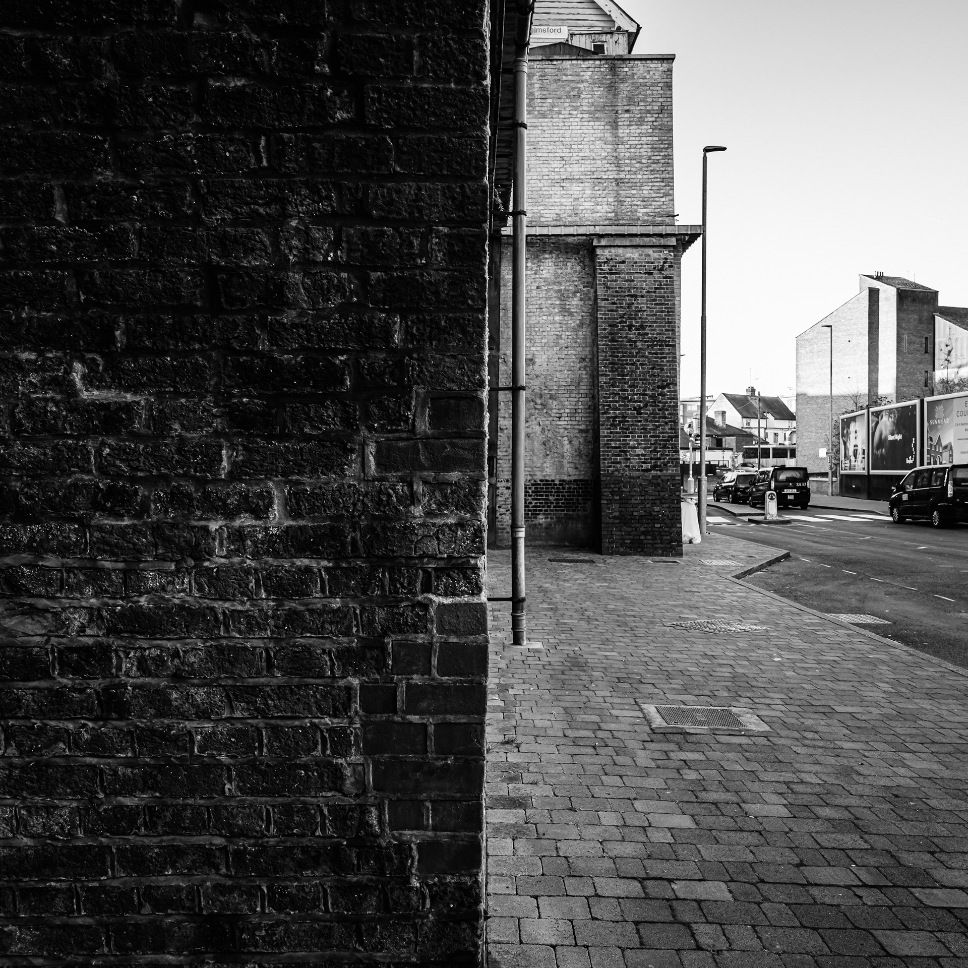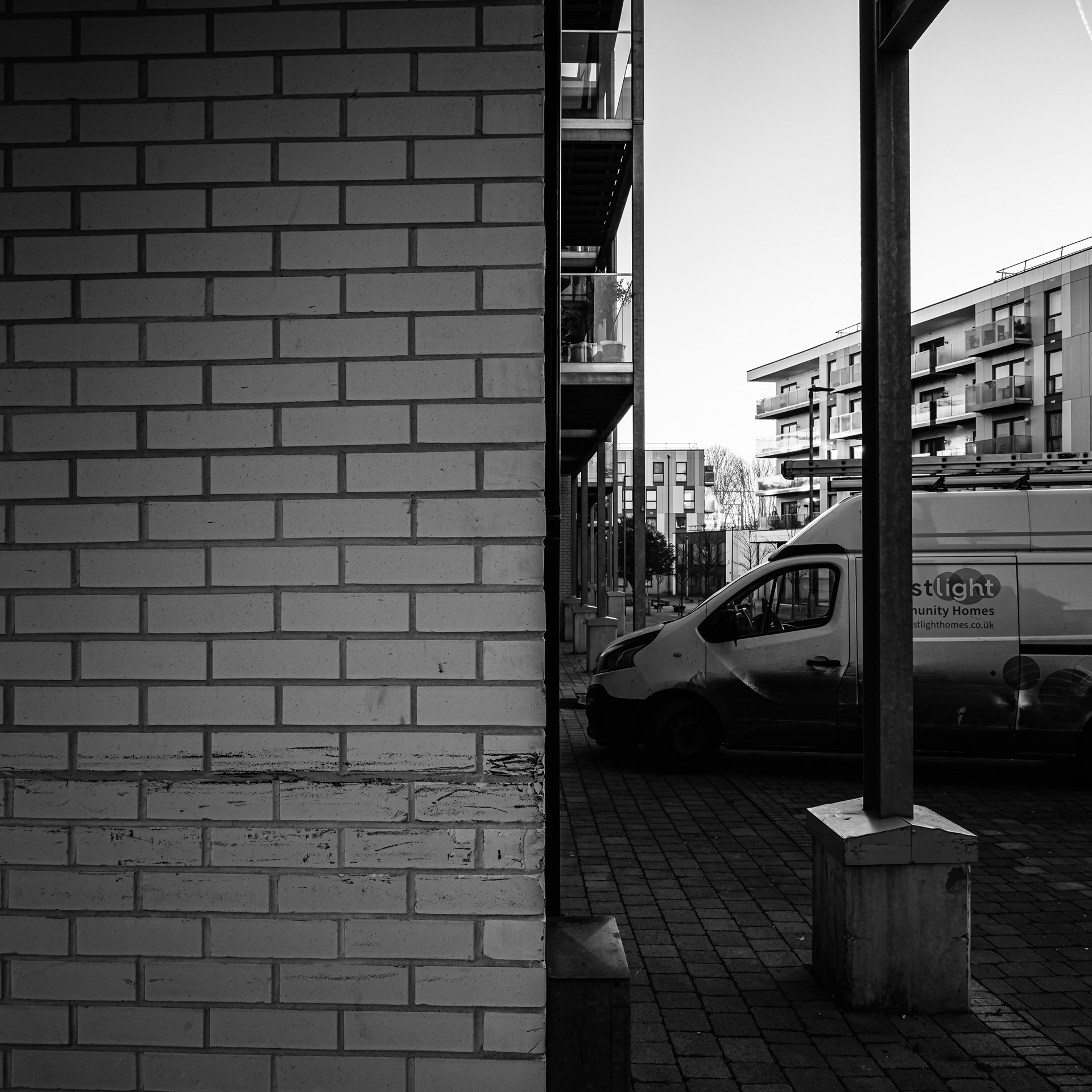 In this series of pictures I divided the frame into two sharp zones using architectural elements as screens: an opaque mass occupying half of the surface and a sliver of urban reality persisting in the other half. The act of photographing becomes a practice of systematic subtraction, where the building ceases to be a volume and is transformed into a visual obstacle that denies depth and forces the eye to focus on an isolated fragment.