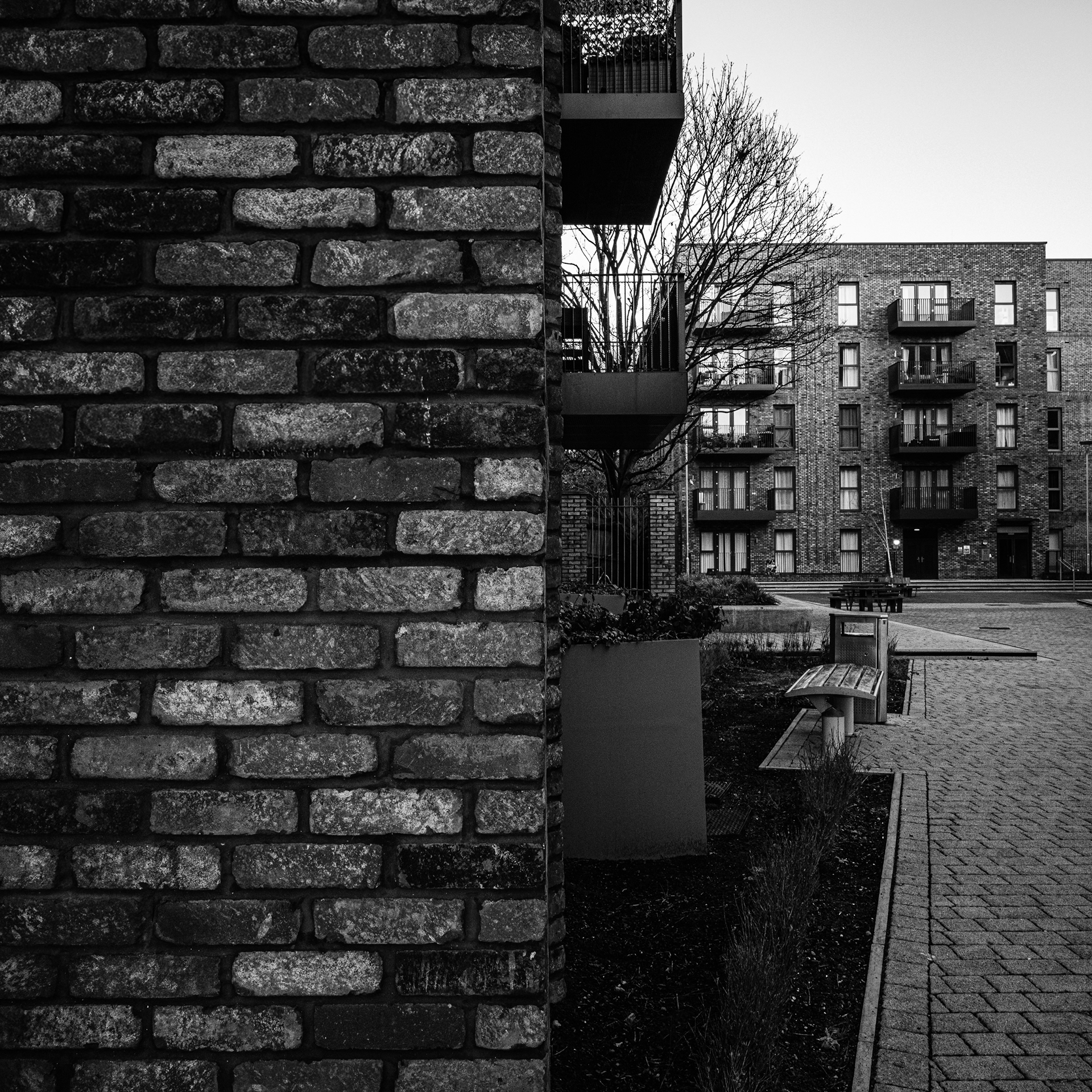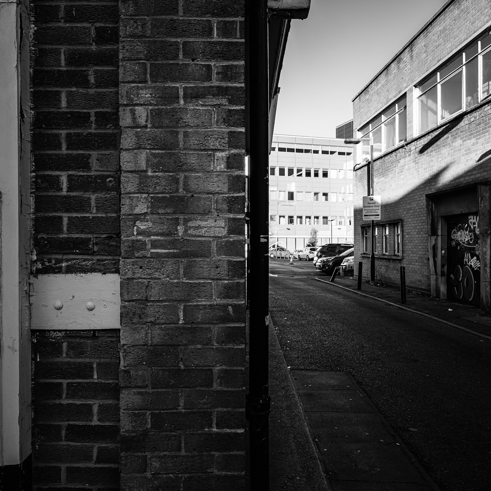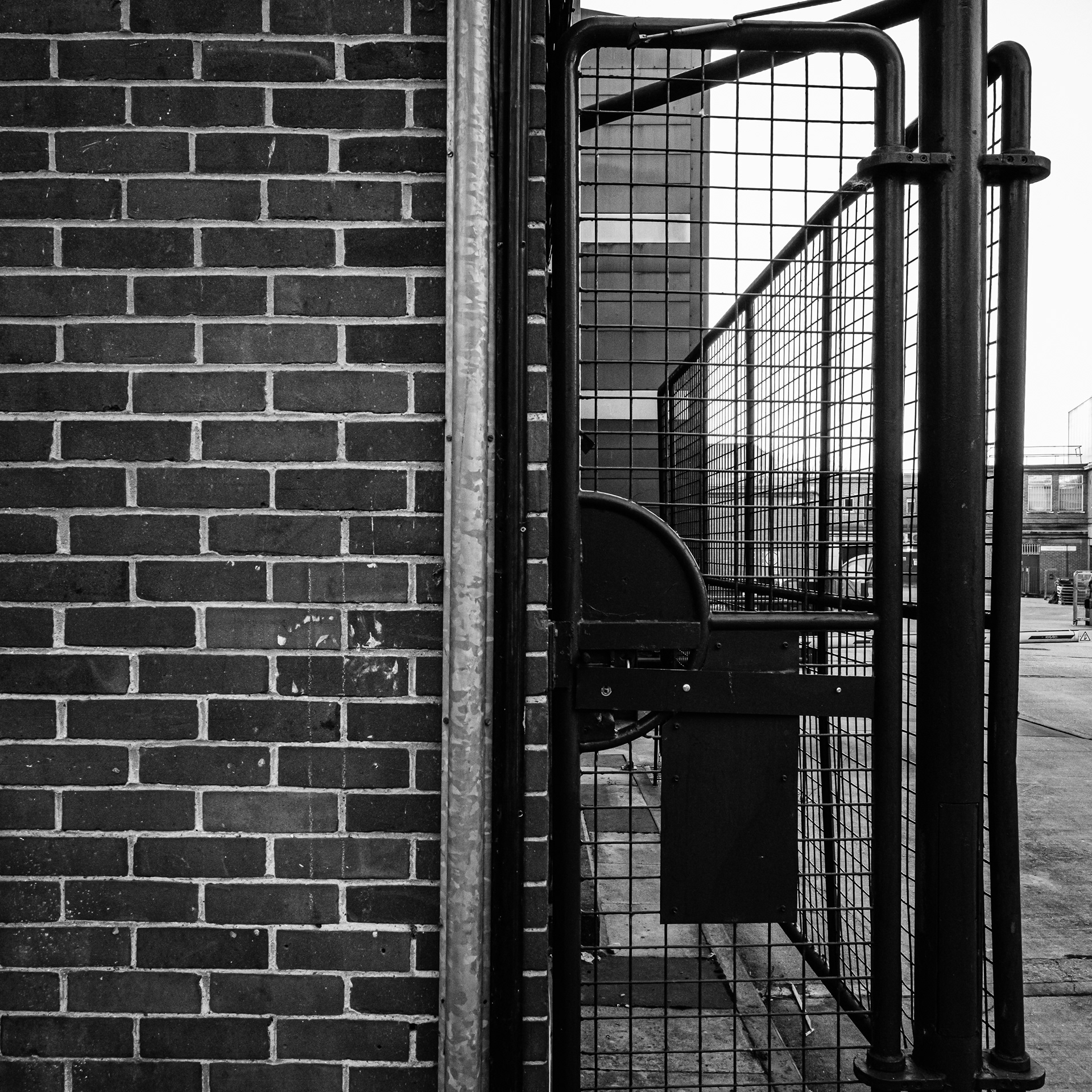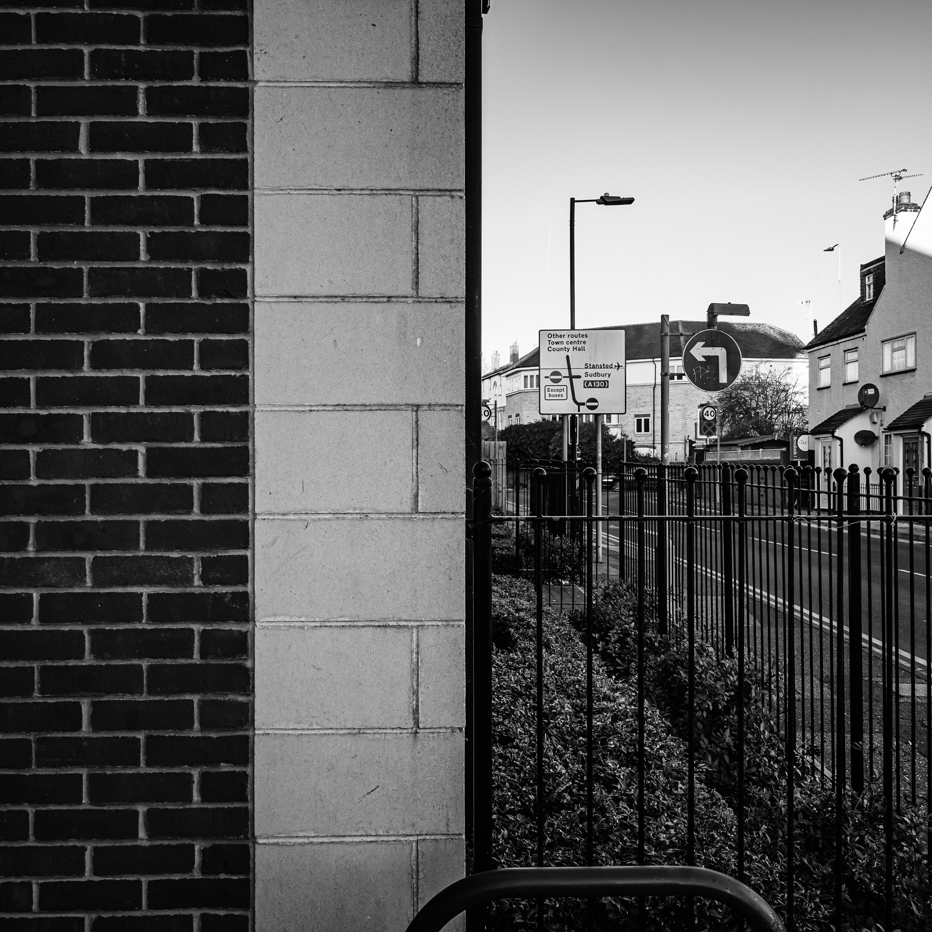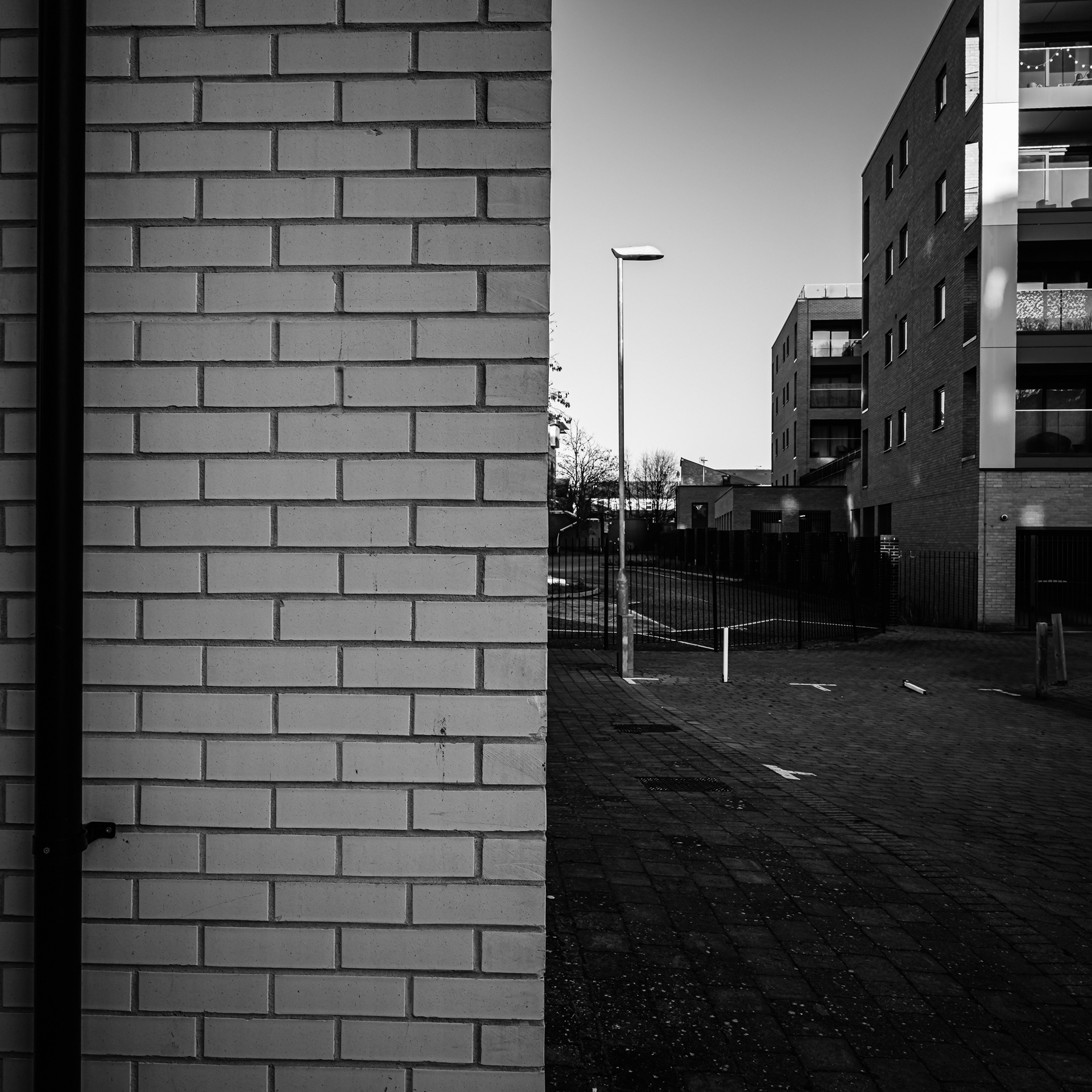In this series of pictures I divided the frame into two sharp zones using architectural elements as screens: an opaque mass occupying half of the surface and a sliver of urban reality persisting in the other half. The act of photographing becomes a practice of systematic subtraction, where the building ceases to be a volume and is transformed into a visual obstacle that denies depth and forces the eye to focus on an isolated fragment.