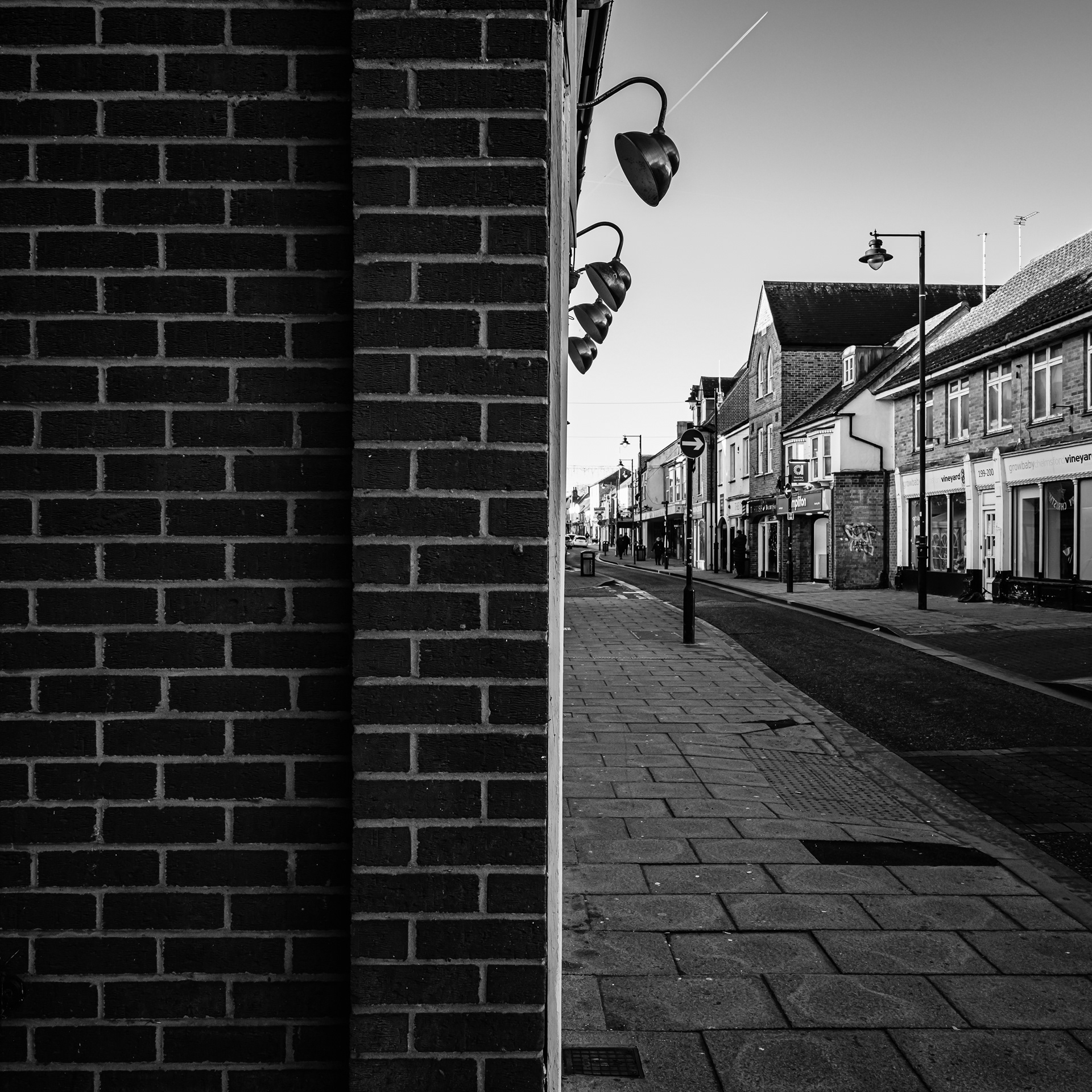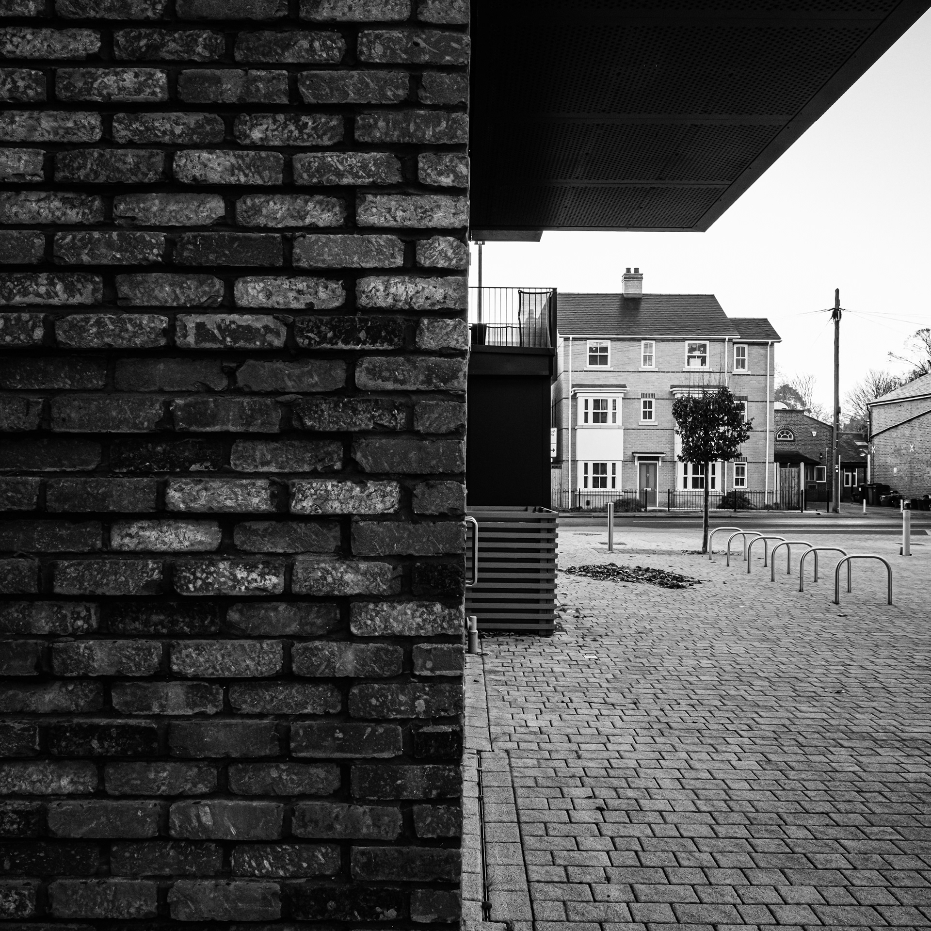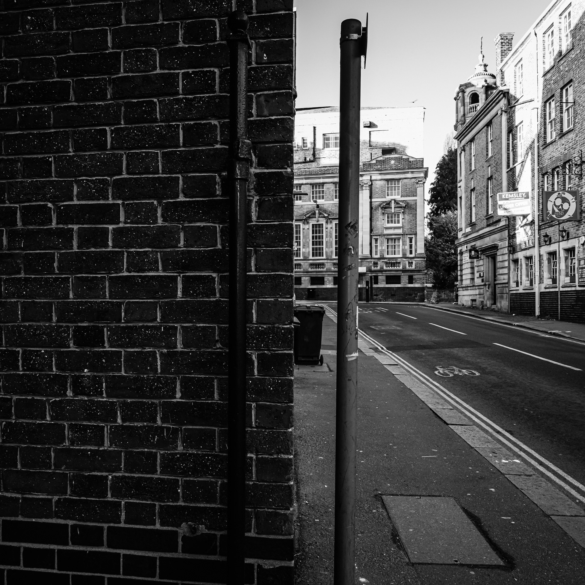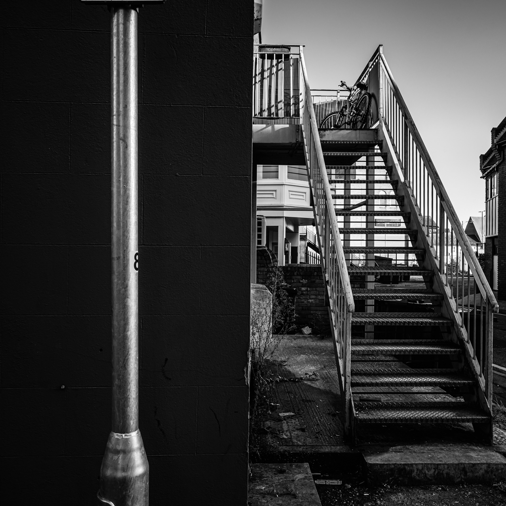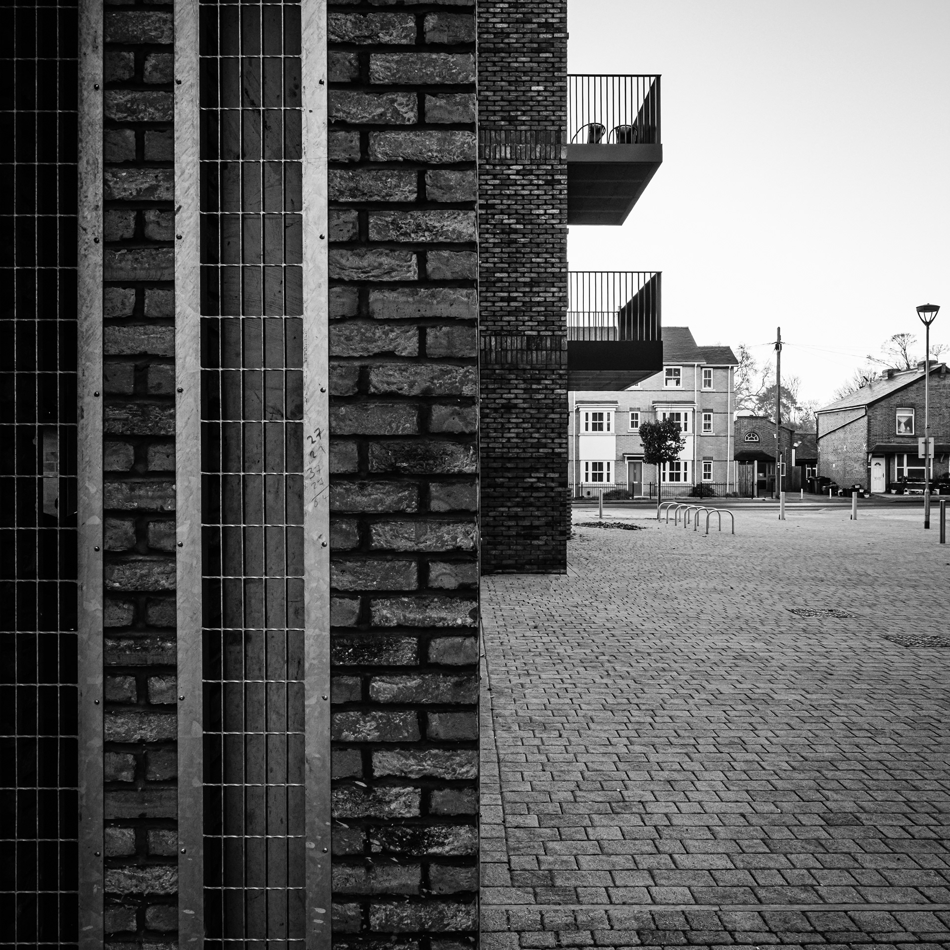 In this series of pictures I divided the frame into two sharp zones using architectural elements as screens: an opaque mass occupying half of the surface and a sliver of urban reality persisting in the other half. The act of photographing becomes a practice of systematic subtraction, where the building ceases to be a volume and is transformed into a visual obstacle that denies depth and forces the eye to focus on an isolated fragment.