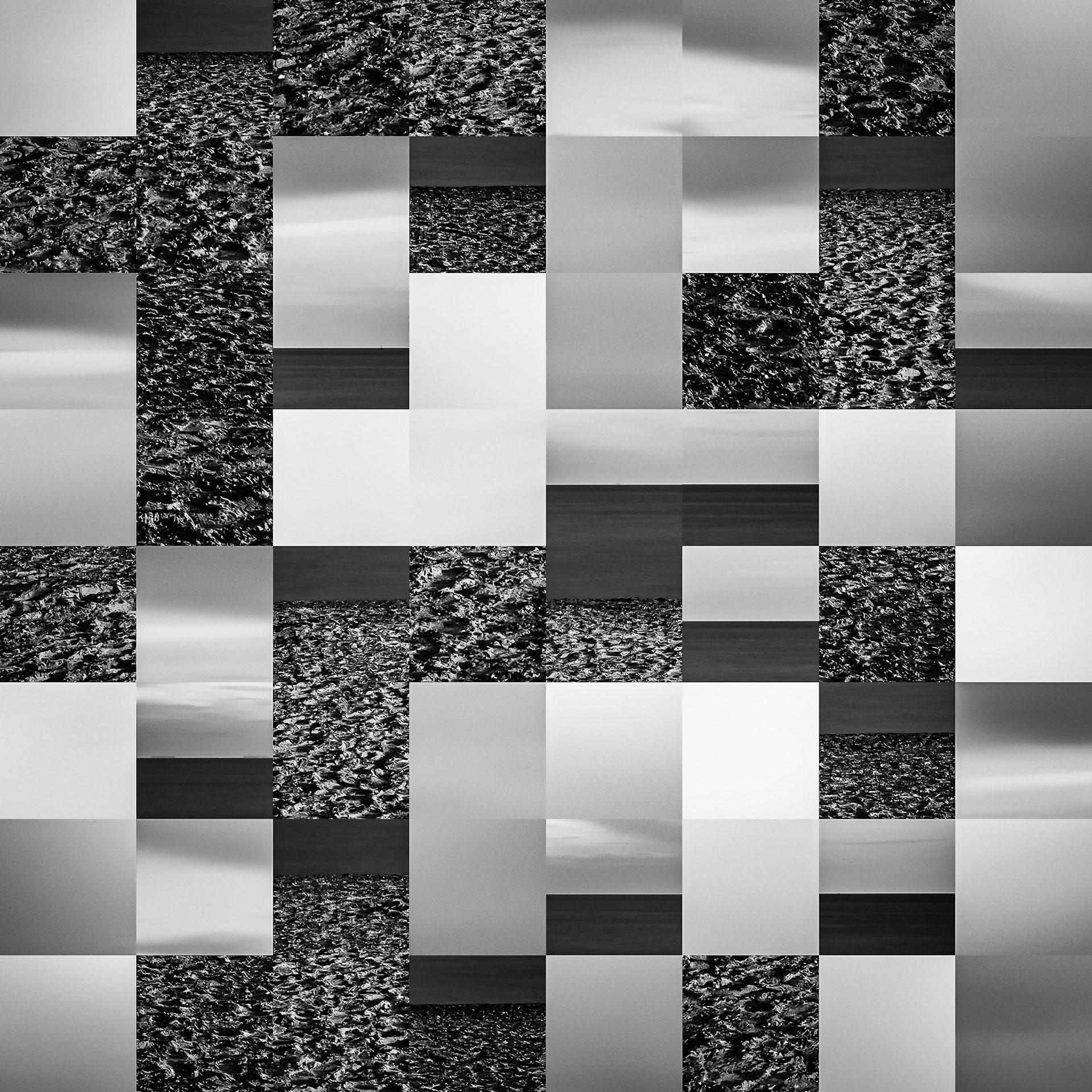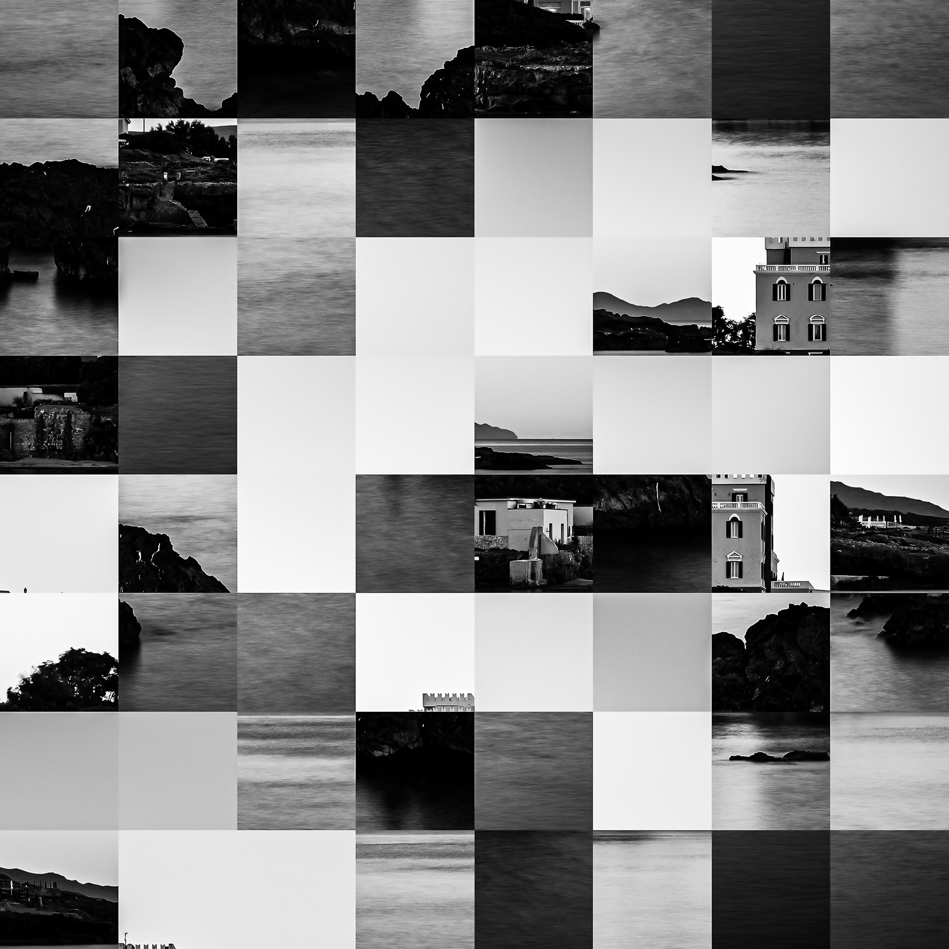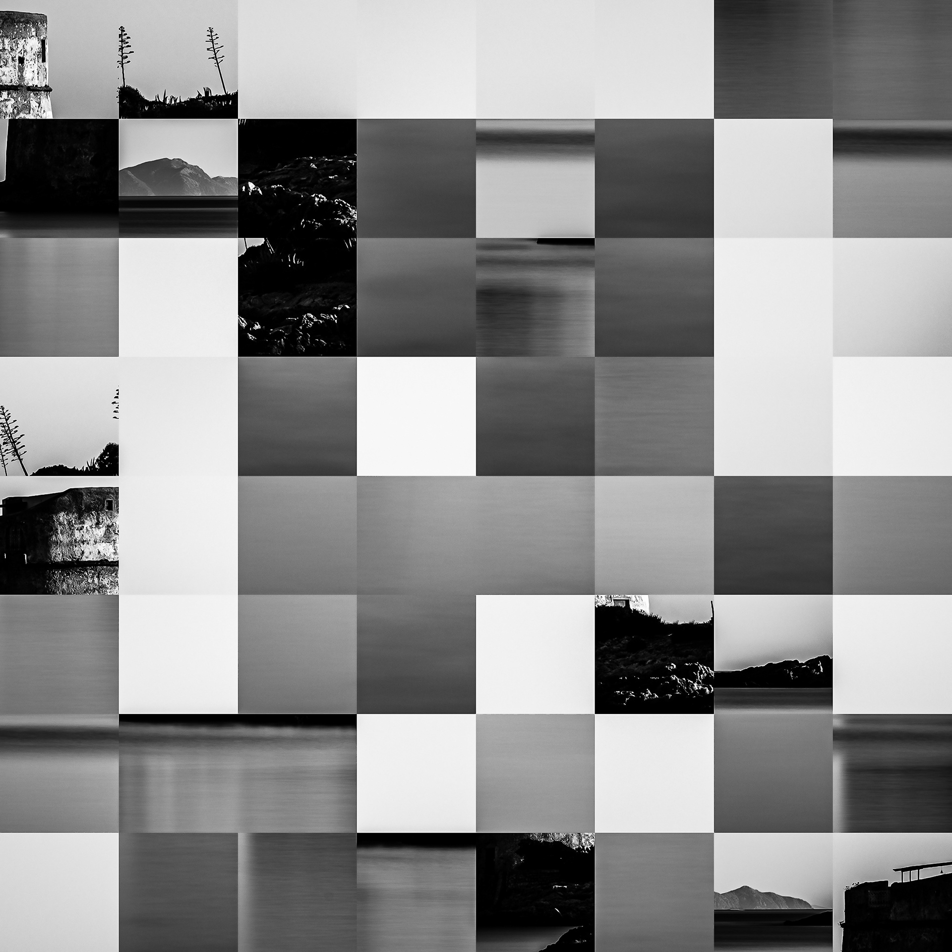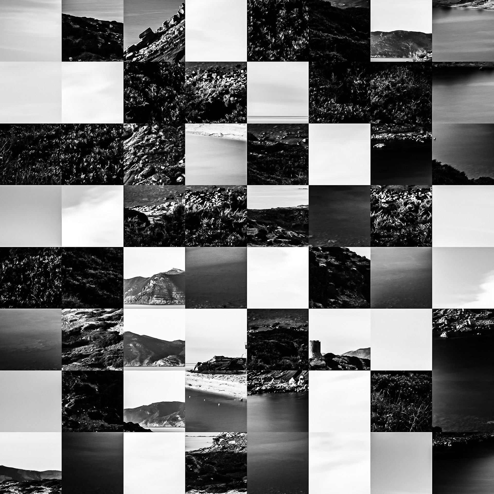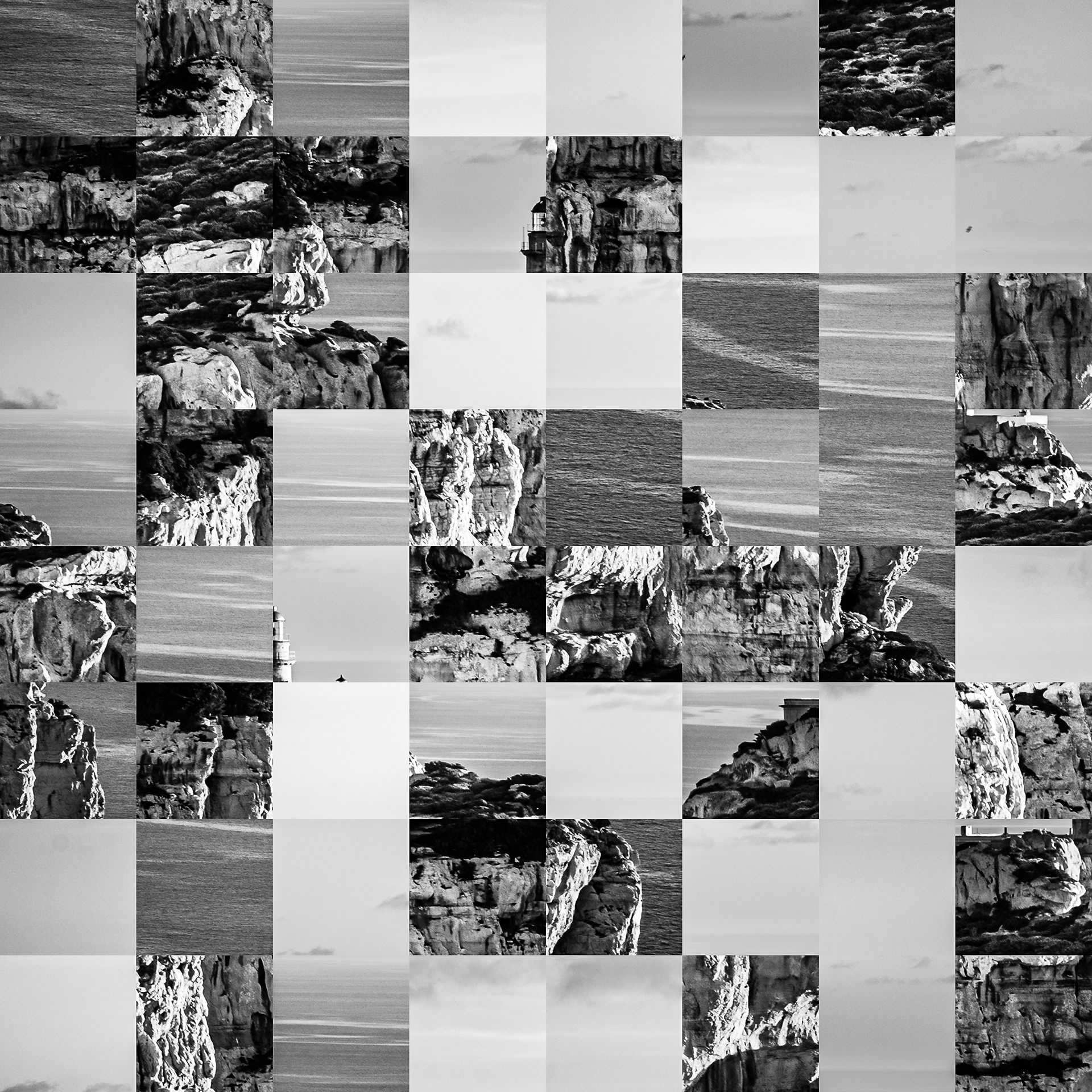 By working on the systematic deconstruction of these views, I reduced the territory to a sequence of fragments. Within this grid, the sea, the rocks, or the sky lose their names, becoming simple variations of tone, contrast, and geometric shapes. I am interested in that moment of uncertainty where the eye tries to reassemble the entire image, only to collide with the rigor of modularity.