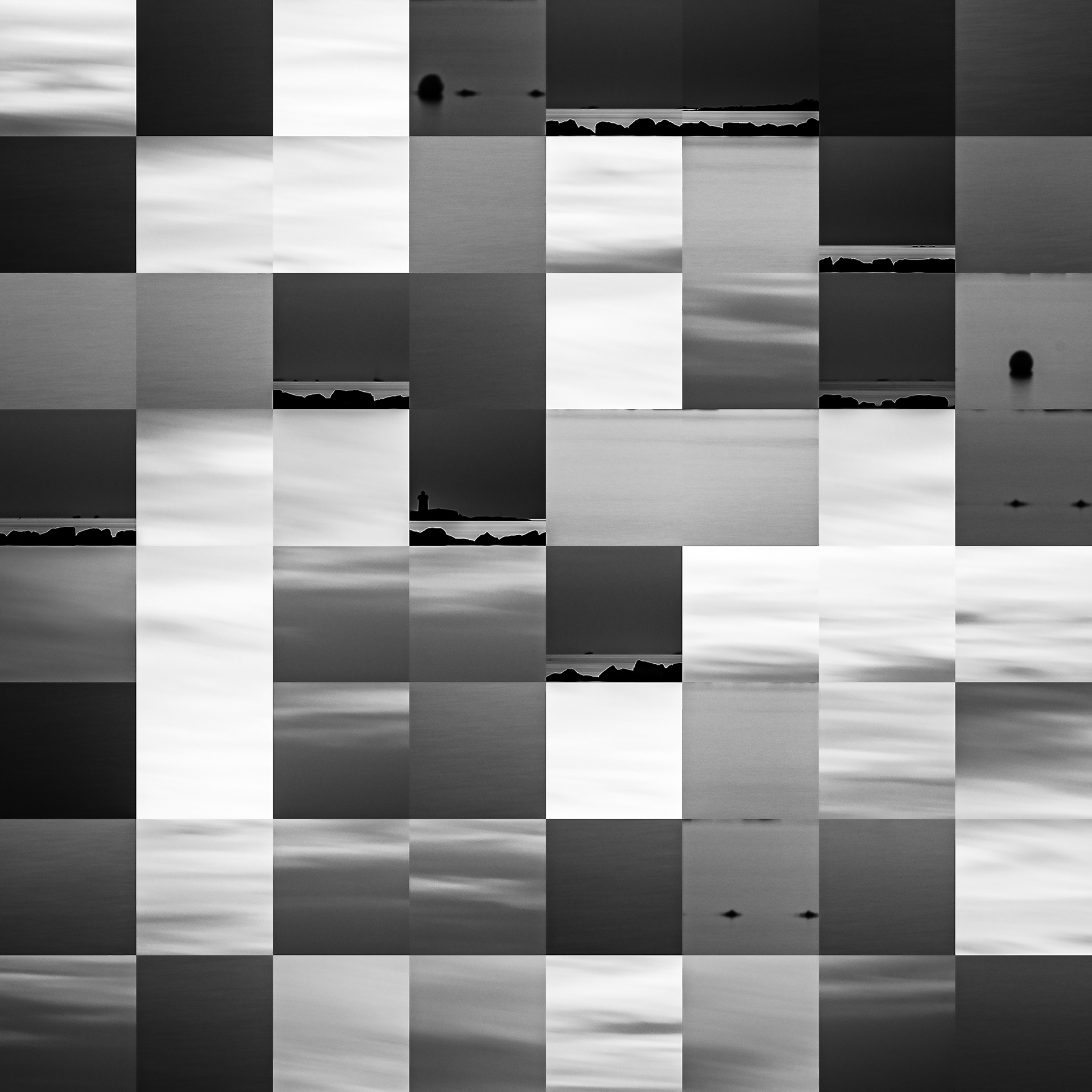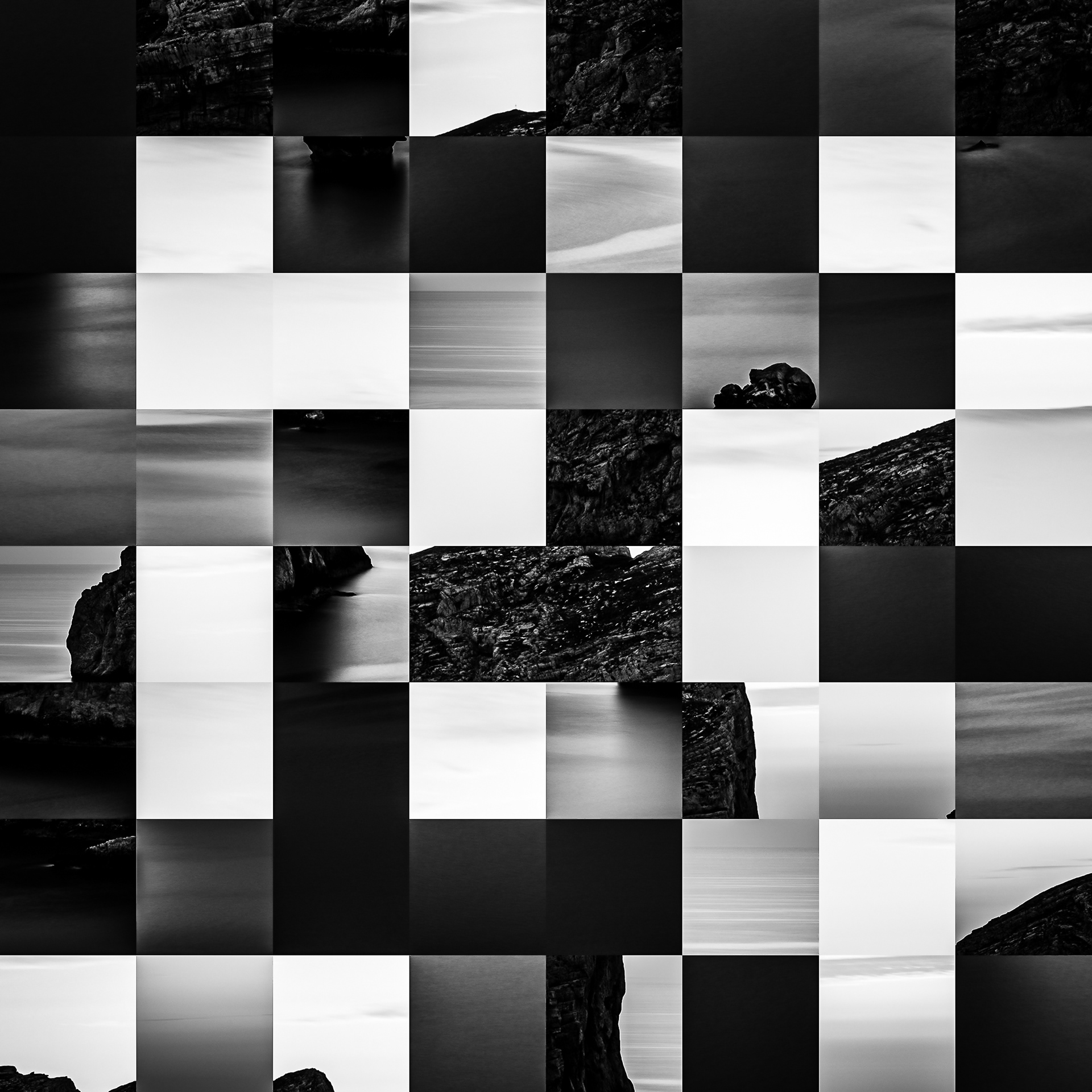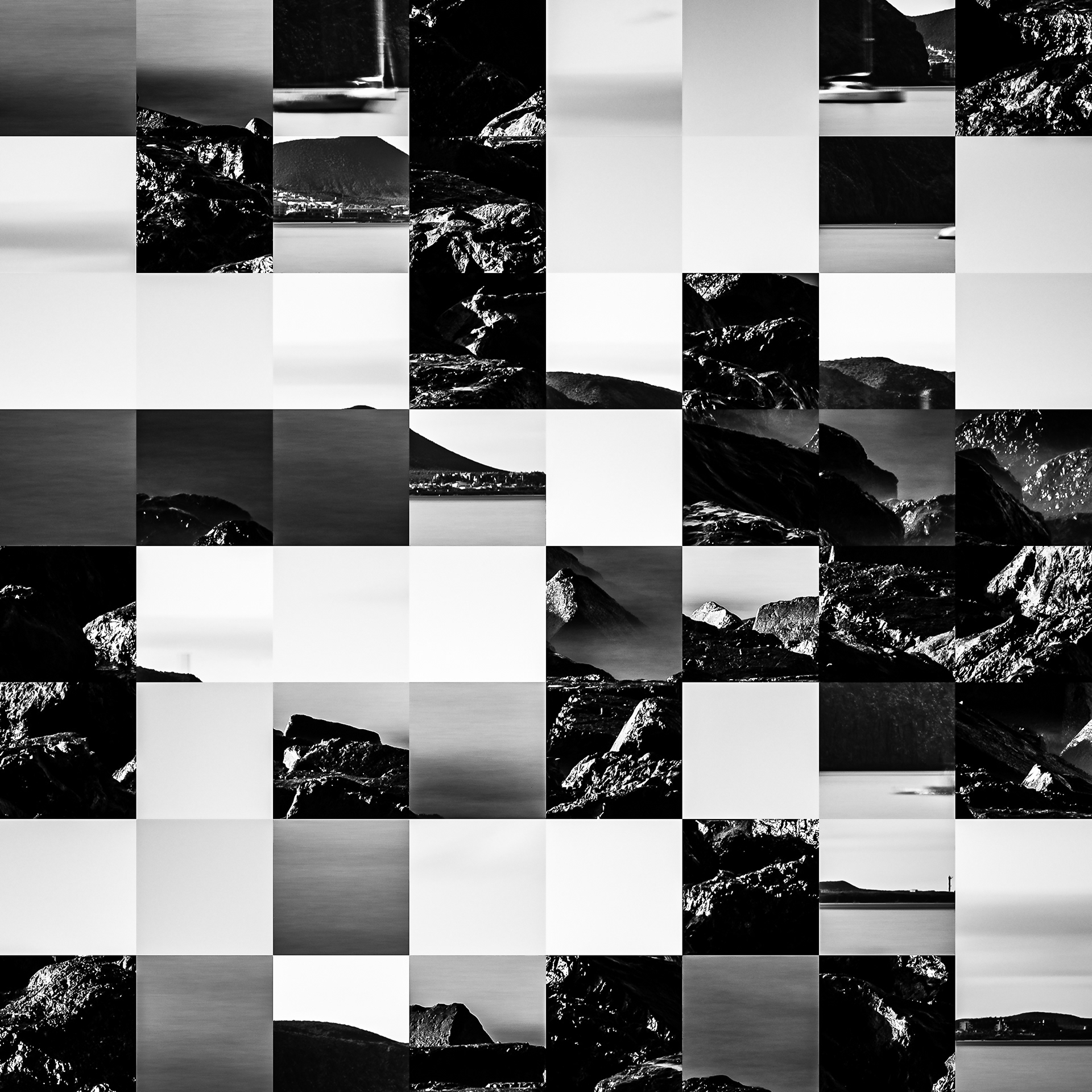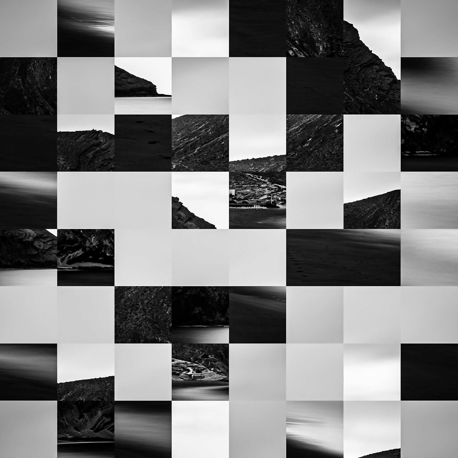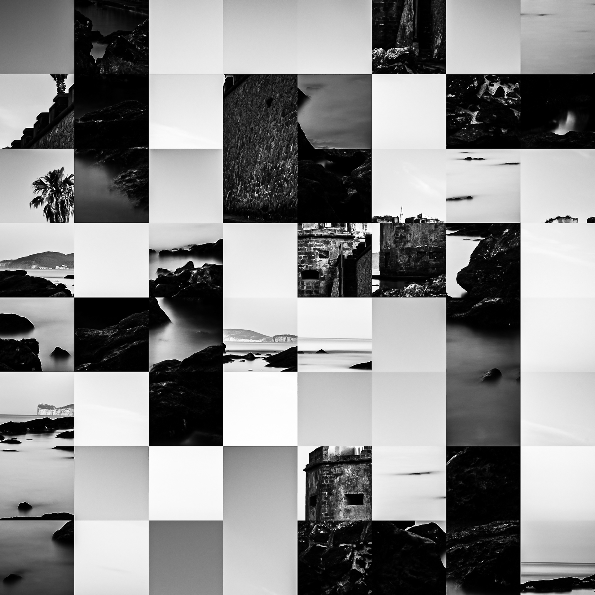 By working on the systematic deconstruction of these views, I reduced the territory to a sequence of fragments. Within this grid, the sea, the rocks, or the sky lose their names, becoming simple variations of tone, contrast, and geometric shapes. I am interested in that moment of uncertainty where the eye tries to reassemble the entire image, only to collide with the rigor of modularity.