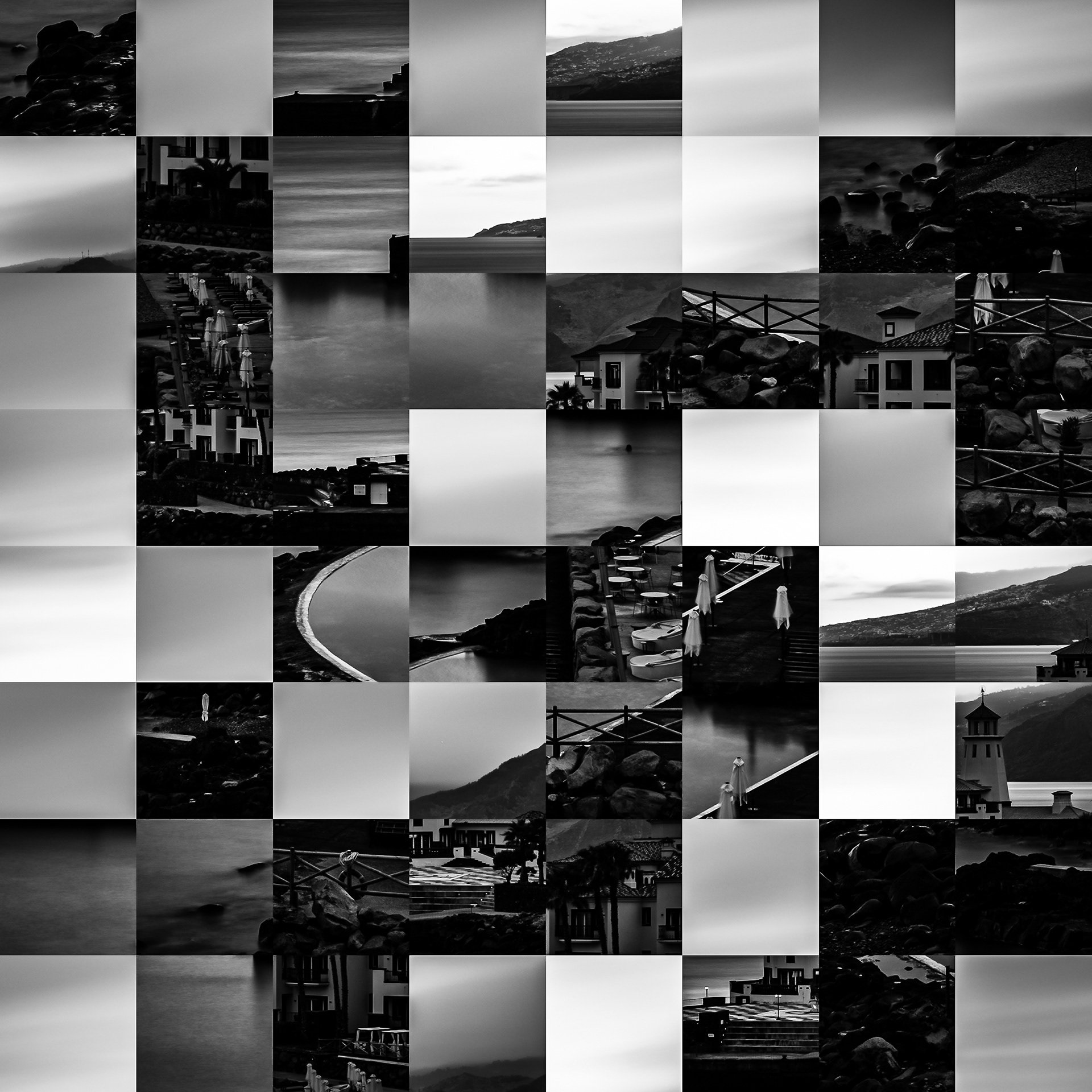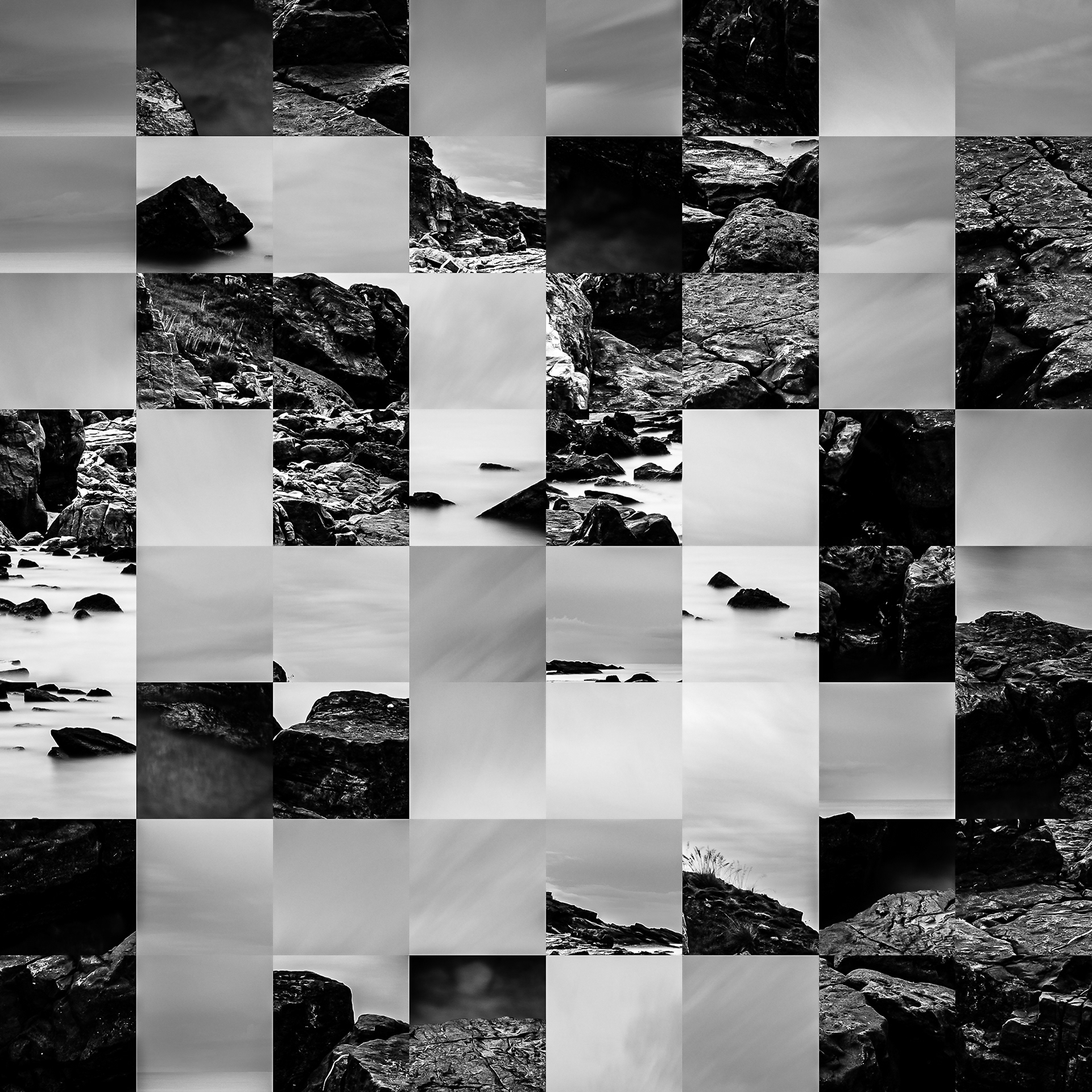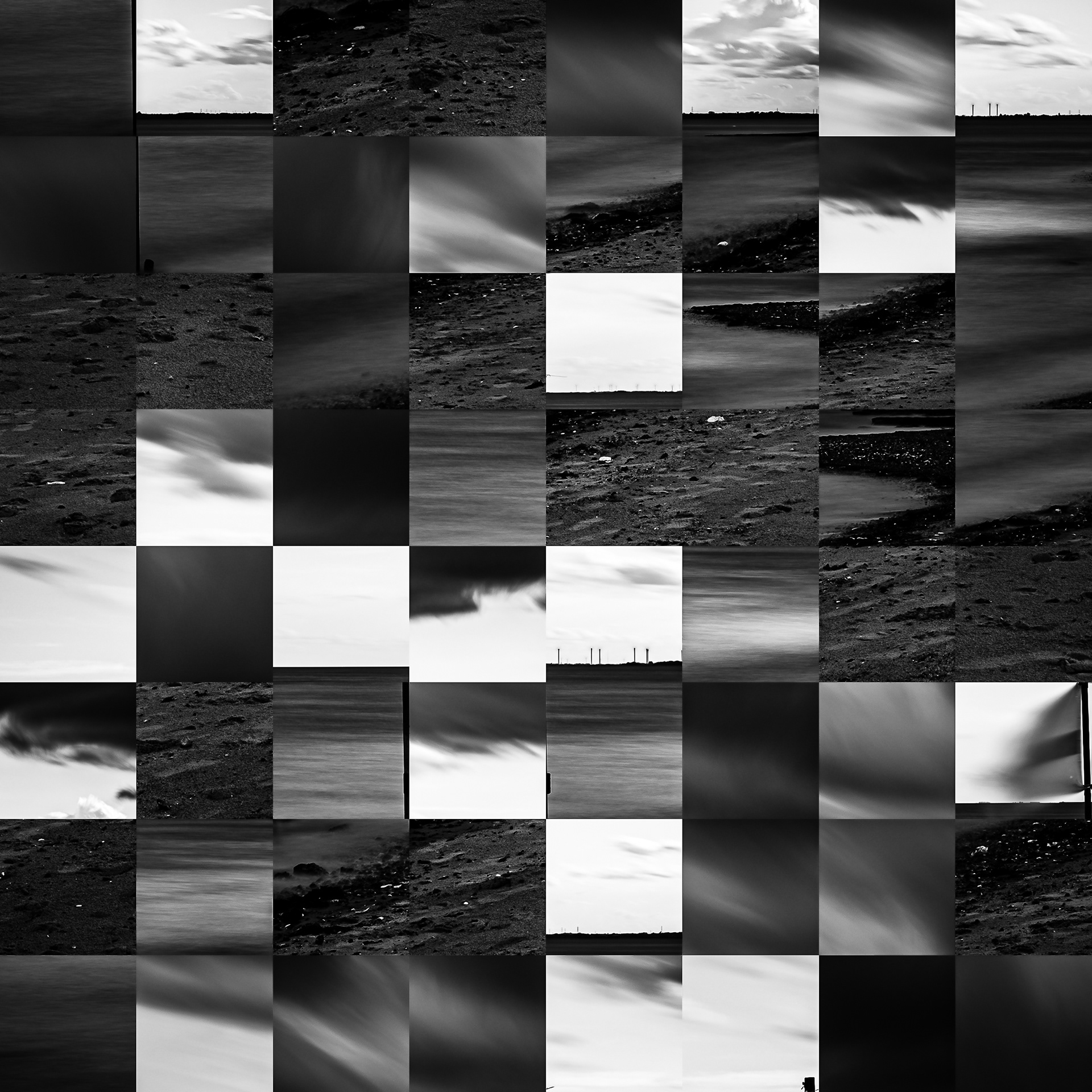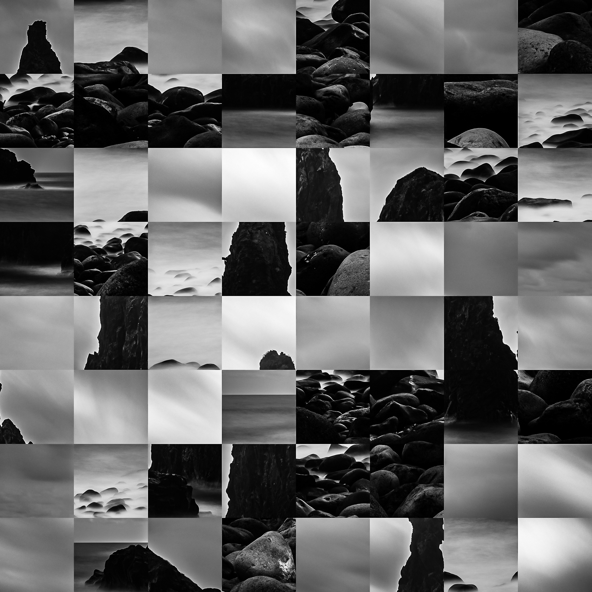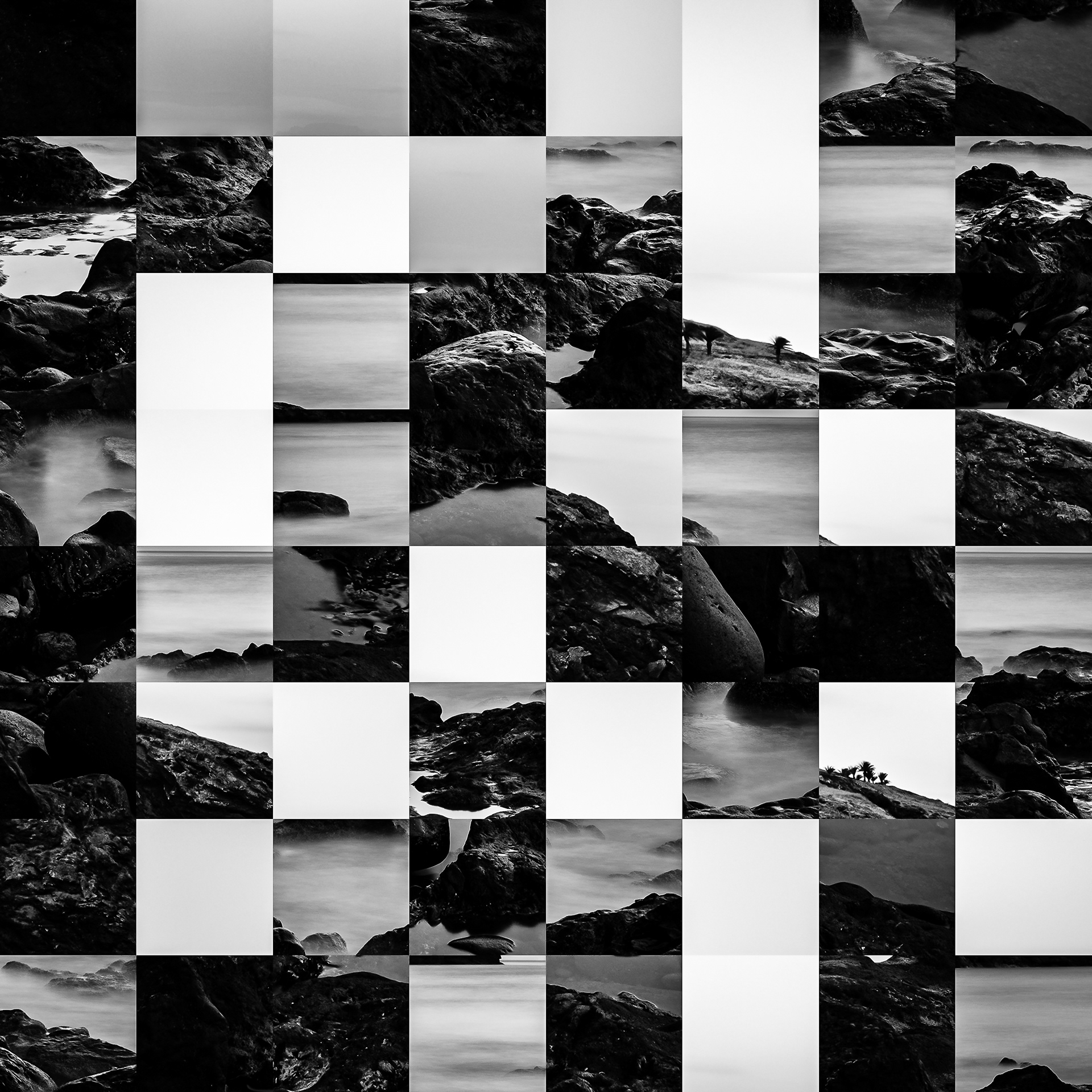 By working on the systematic deconstruction of these views, I reduced the territory to a sequence of fragments. Within this grid, the sea, the rocks, or the sky lose their names, becoming simple variations of tone, contrast, and geometric shapes. I am interested in that moment of uncertainty where the eye tries to reassemble the entire image, only to collide with the rigor of modularity.