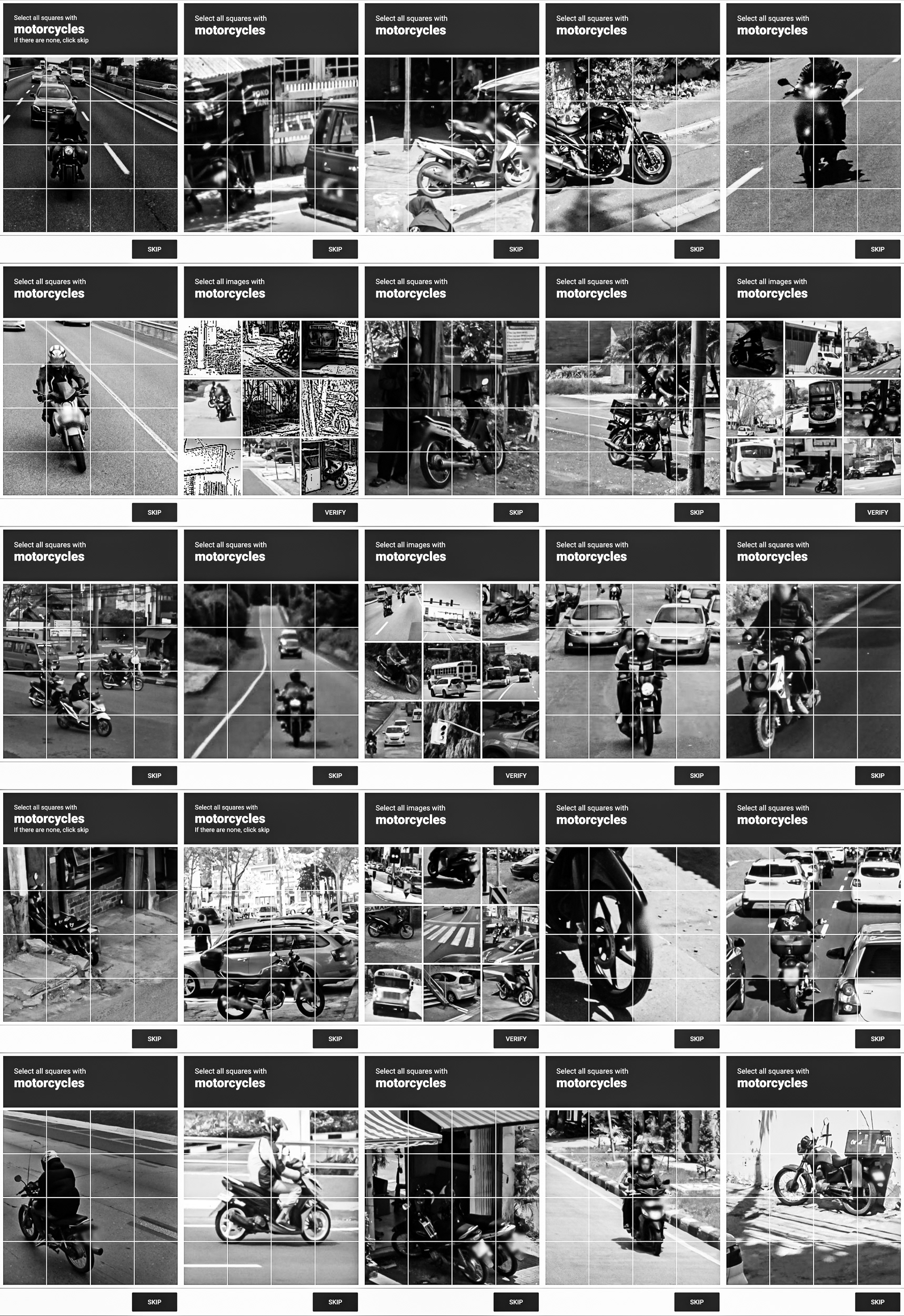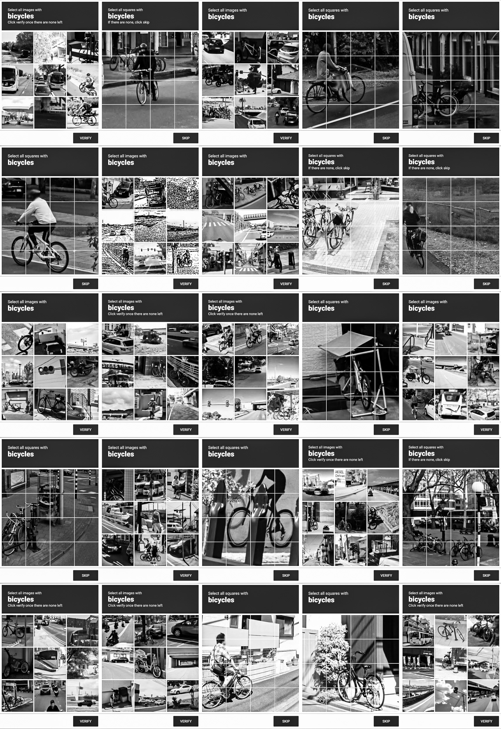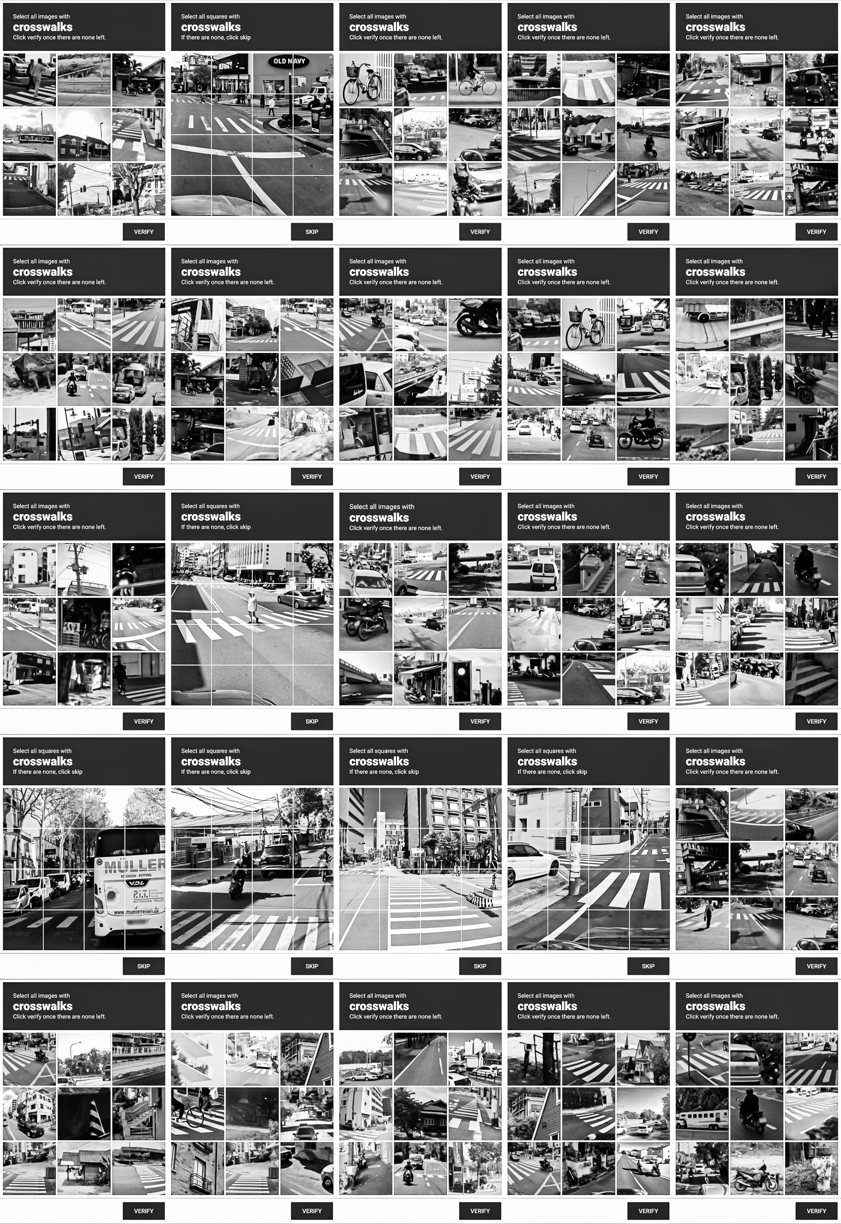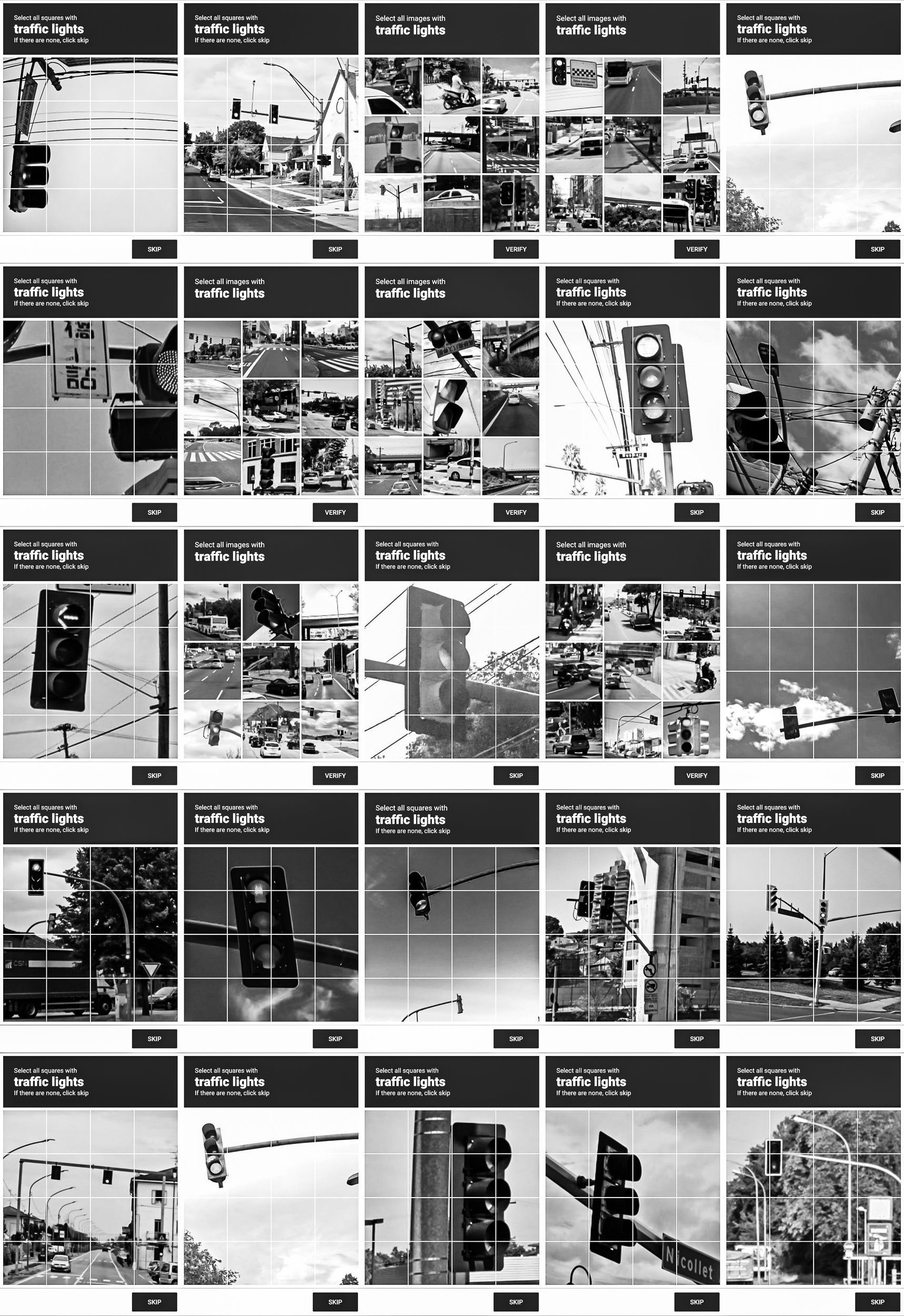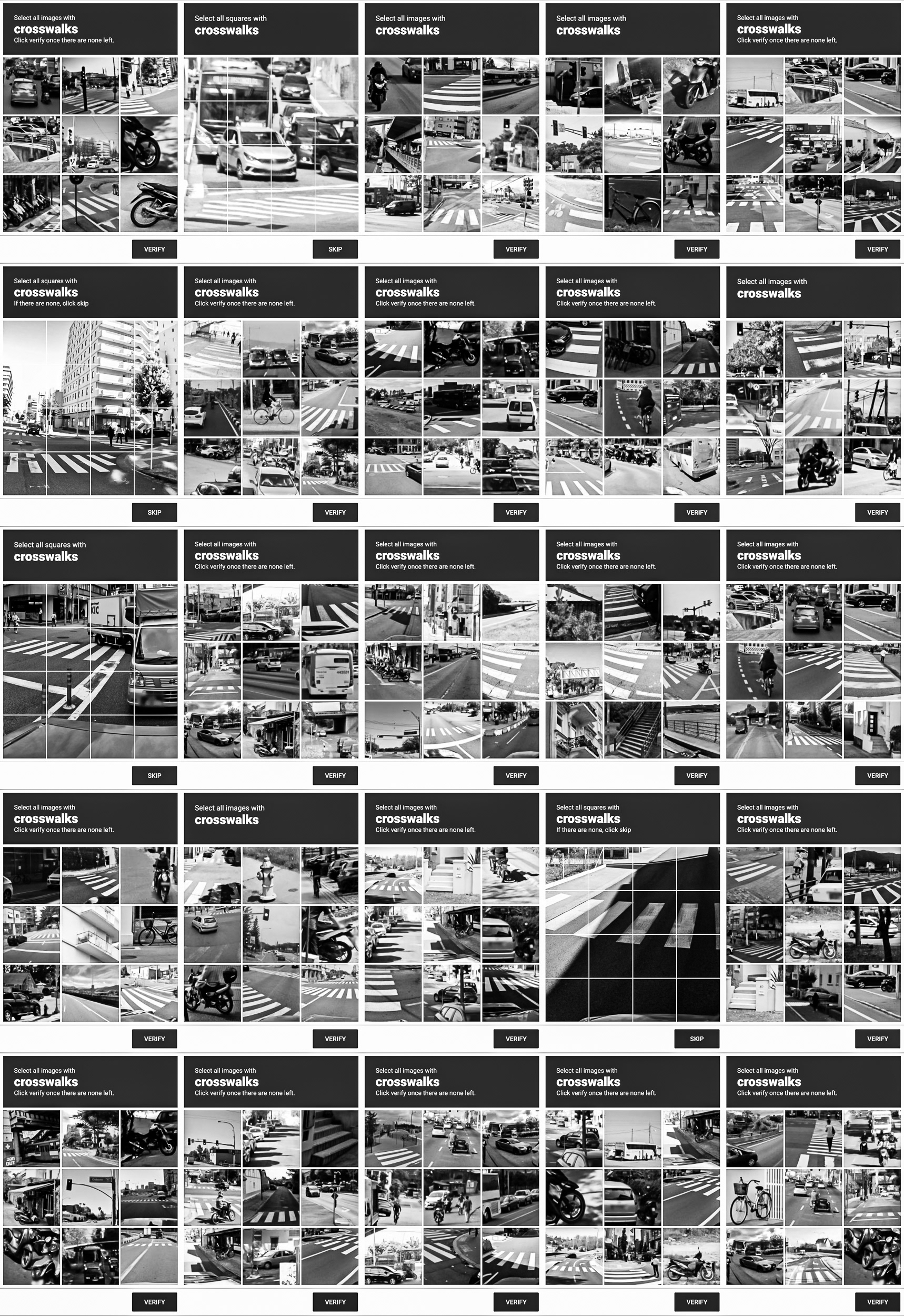 Through this process, photographic indexicality is neutralized. Urban topographies, vehicles, and everyday objects are stripped of their narrative context, reduced to a purely functional, low-resolution visual vocabulary. The grid archives the blind infrastructure through which human biology is temporarily integrated to teach machines how to decode the world.