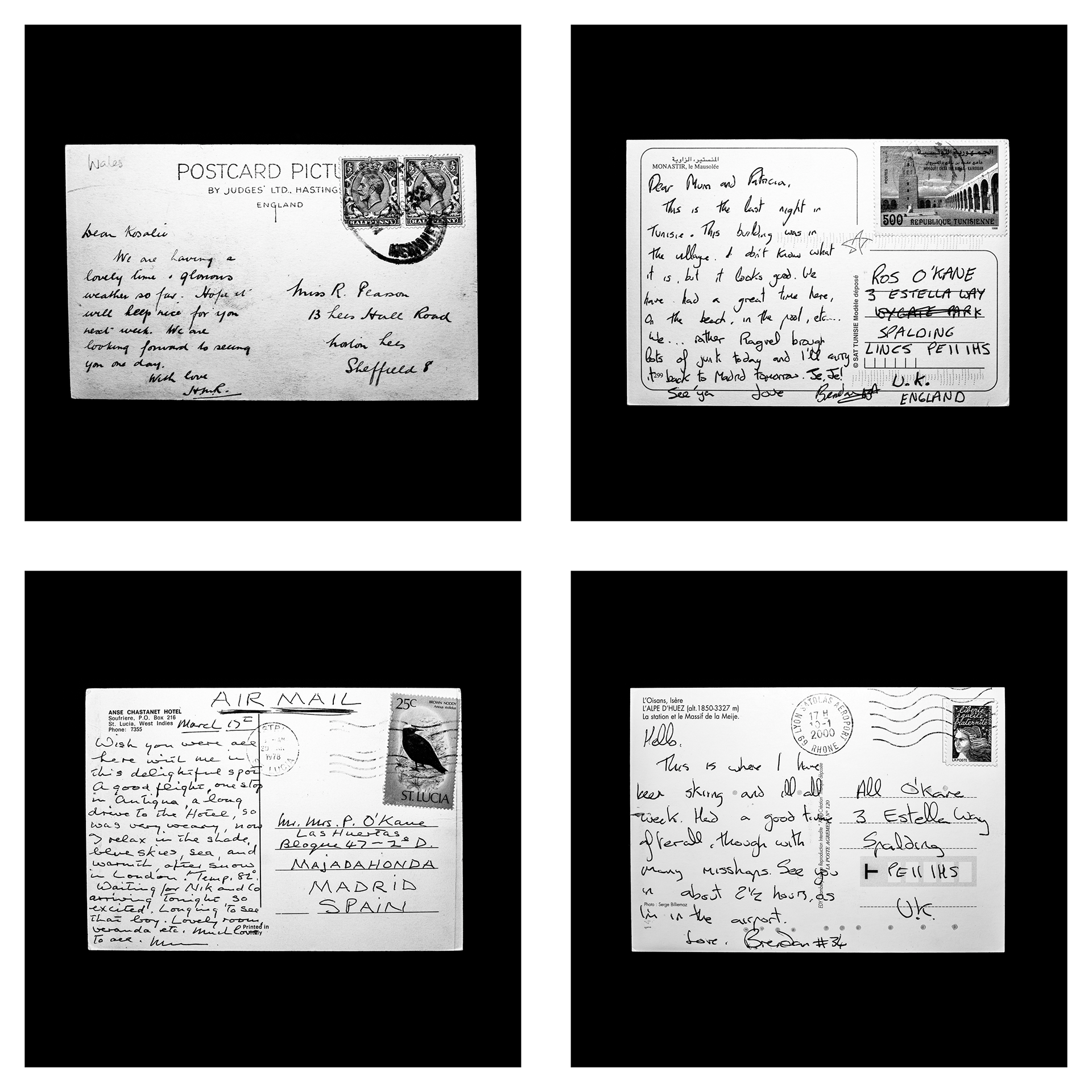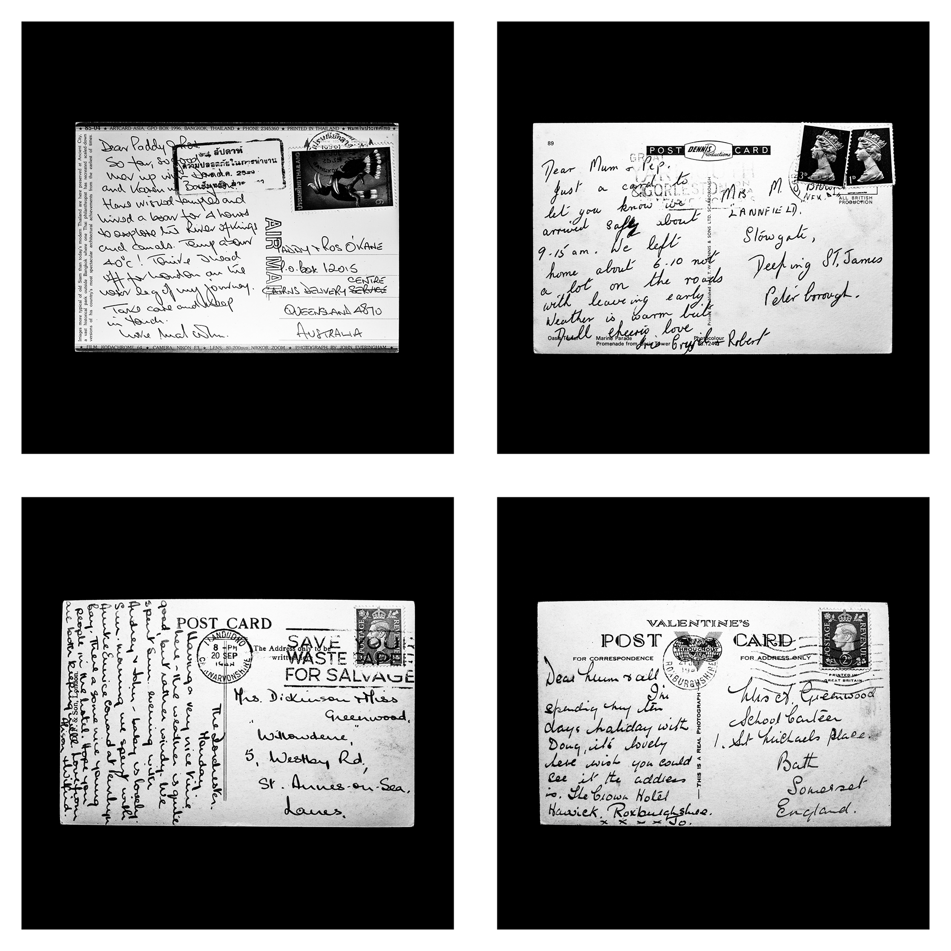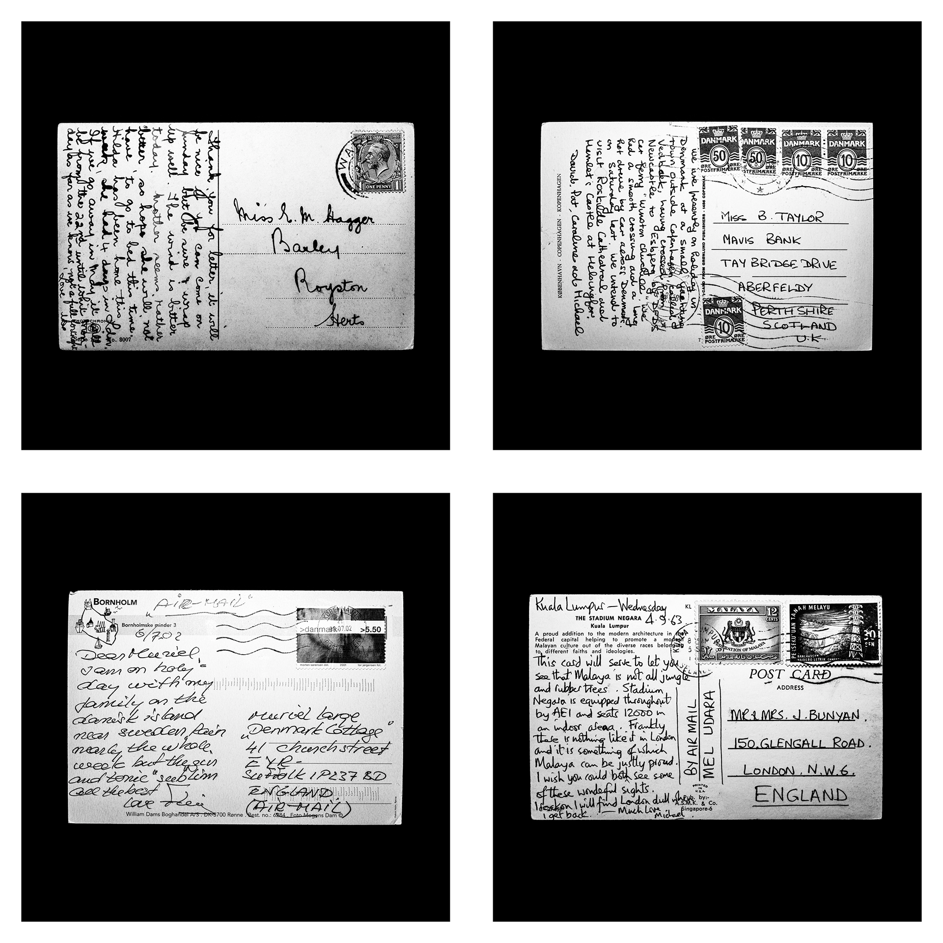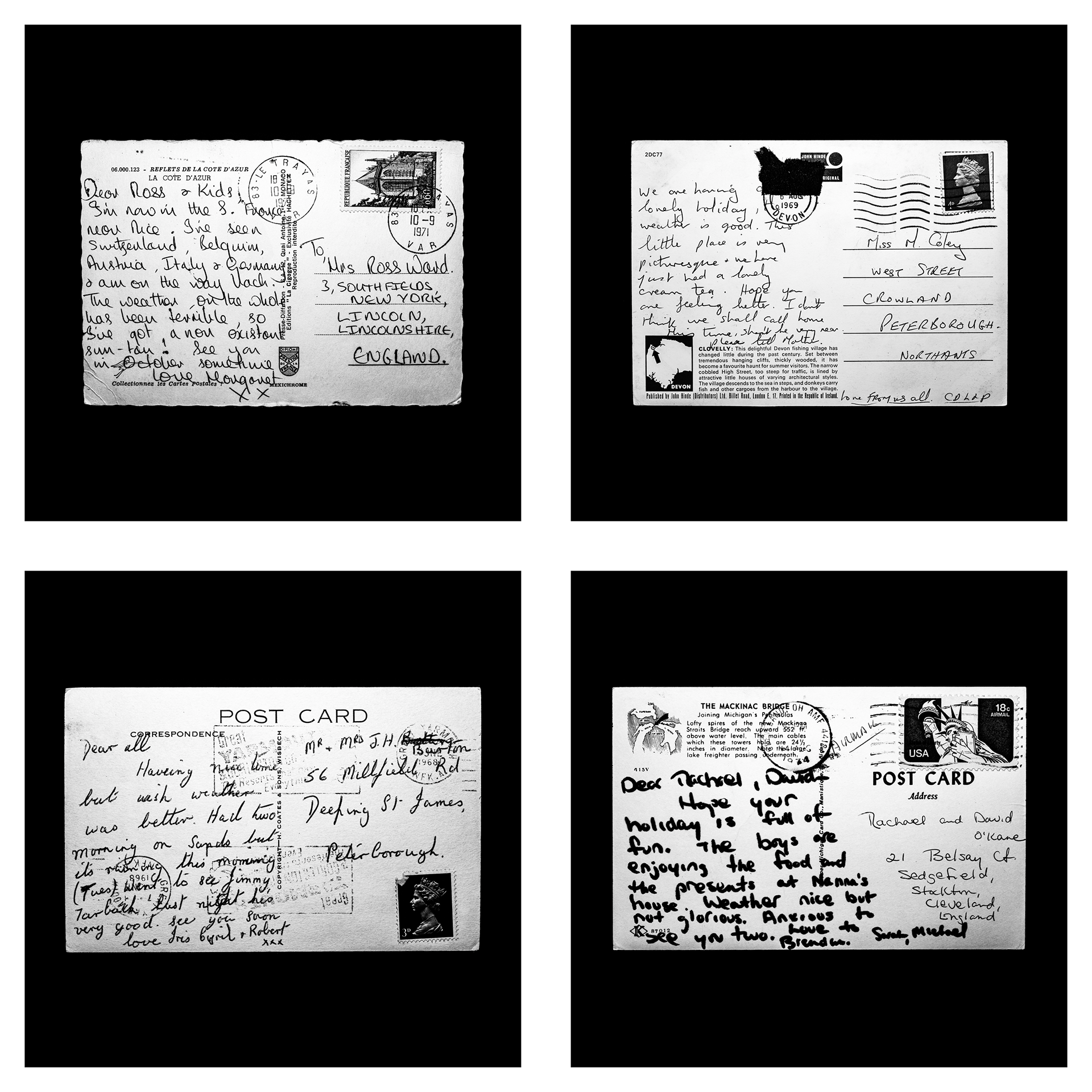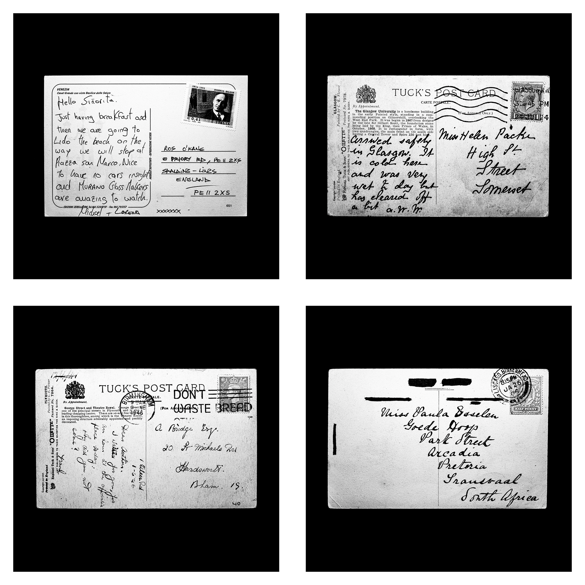 The serial nature of the presentation erases the specificity of the sender, turning handwriting and greetings into fossilized traces of an interaction bureaucratized by the postal service. Intimacy is turned into an archive, and the system of communication prevails over the content of the message.