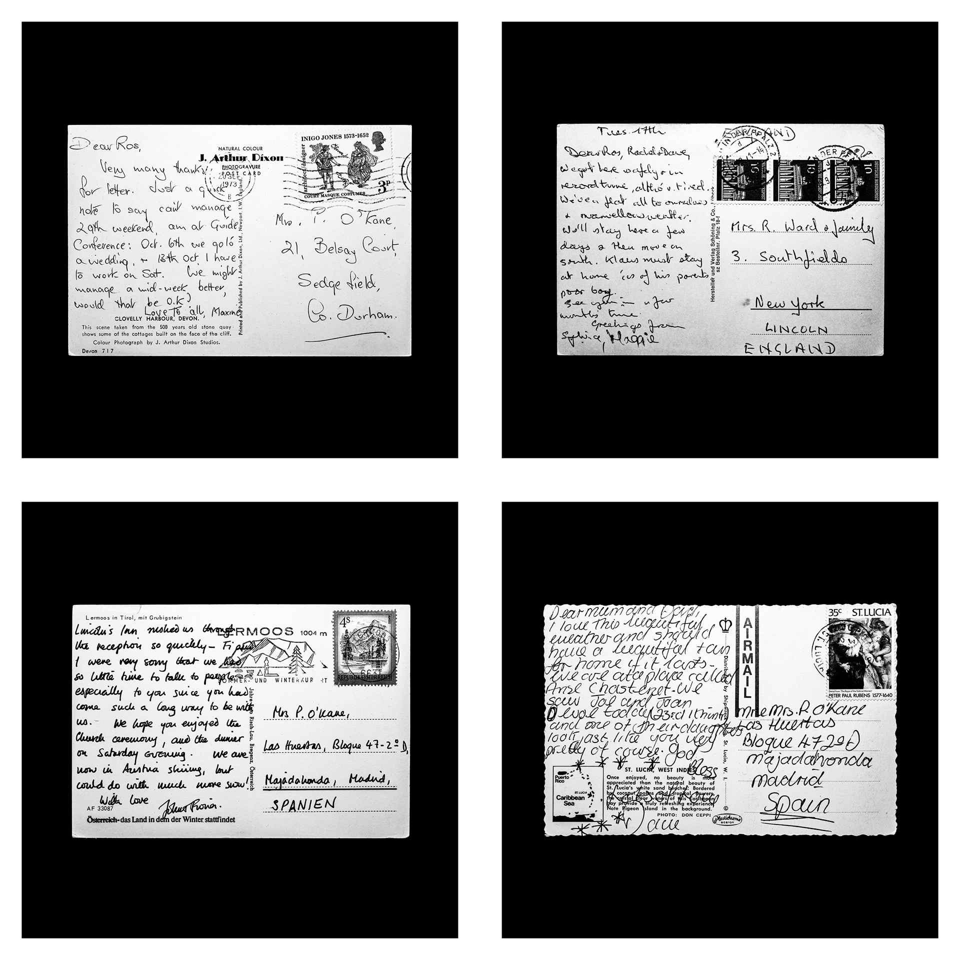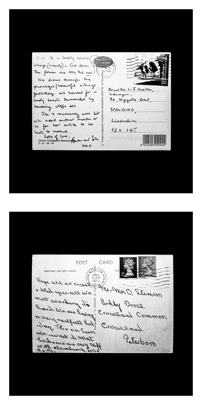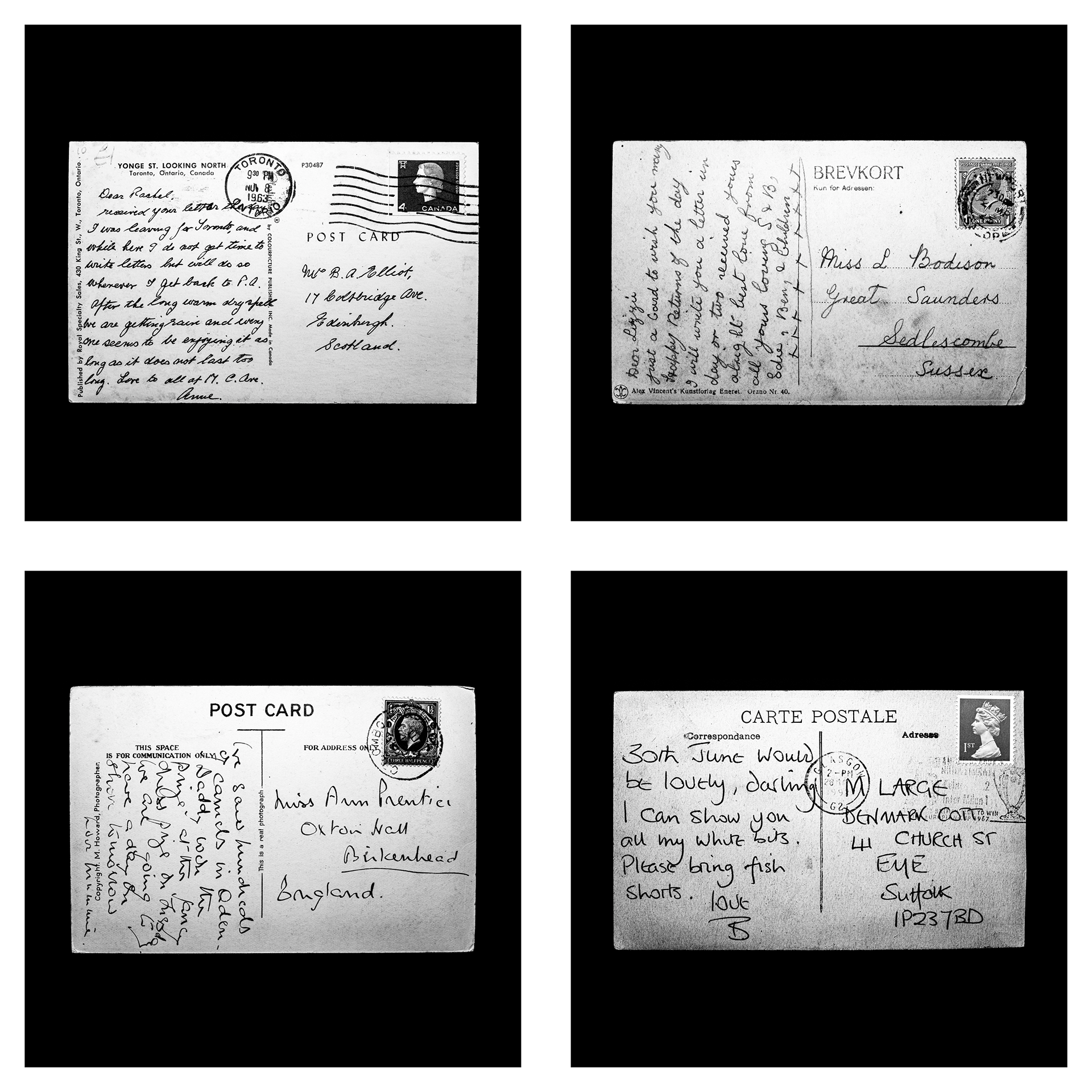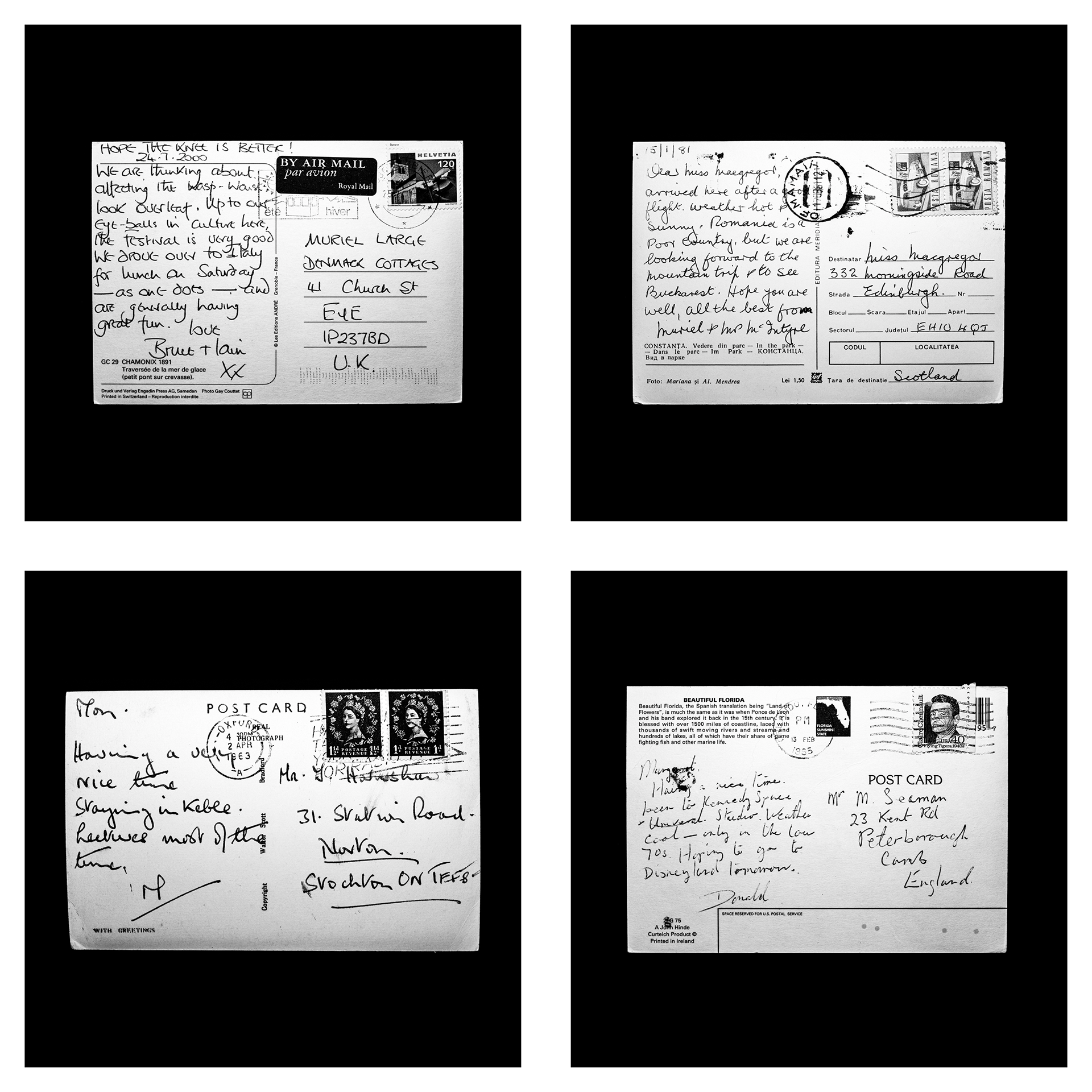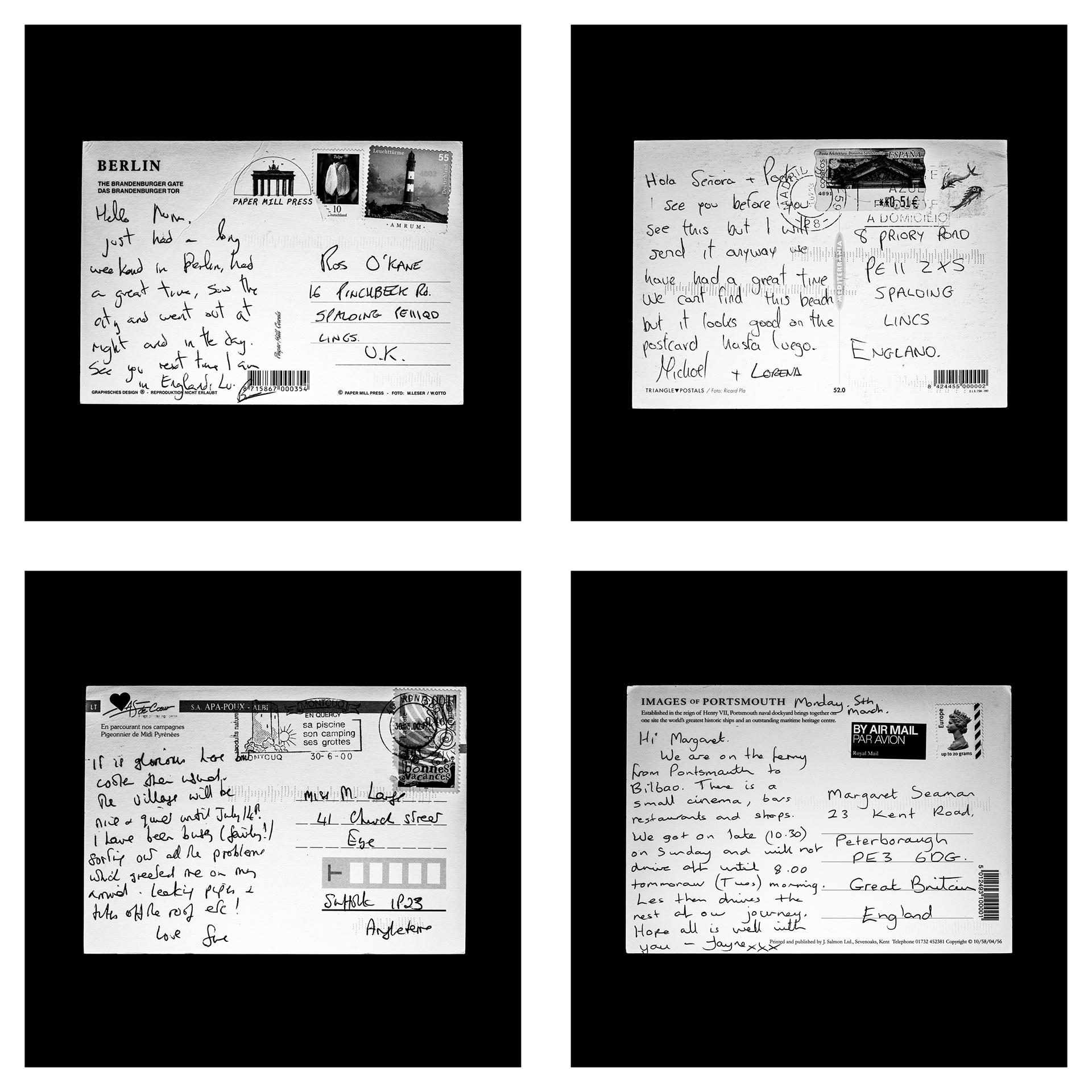 The serial nature of the presentation erases the specificity of the sender, turning handwriting and greetings into fossilized traces of an interaction bureaucratized by the postal service. Intimacy is turned into an archive, and the system of communication prevails over the content of the message.