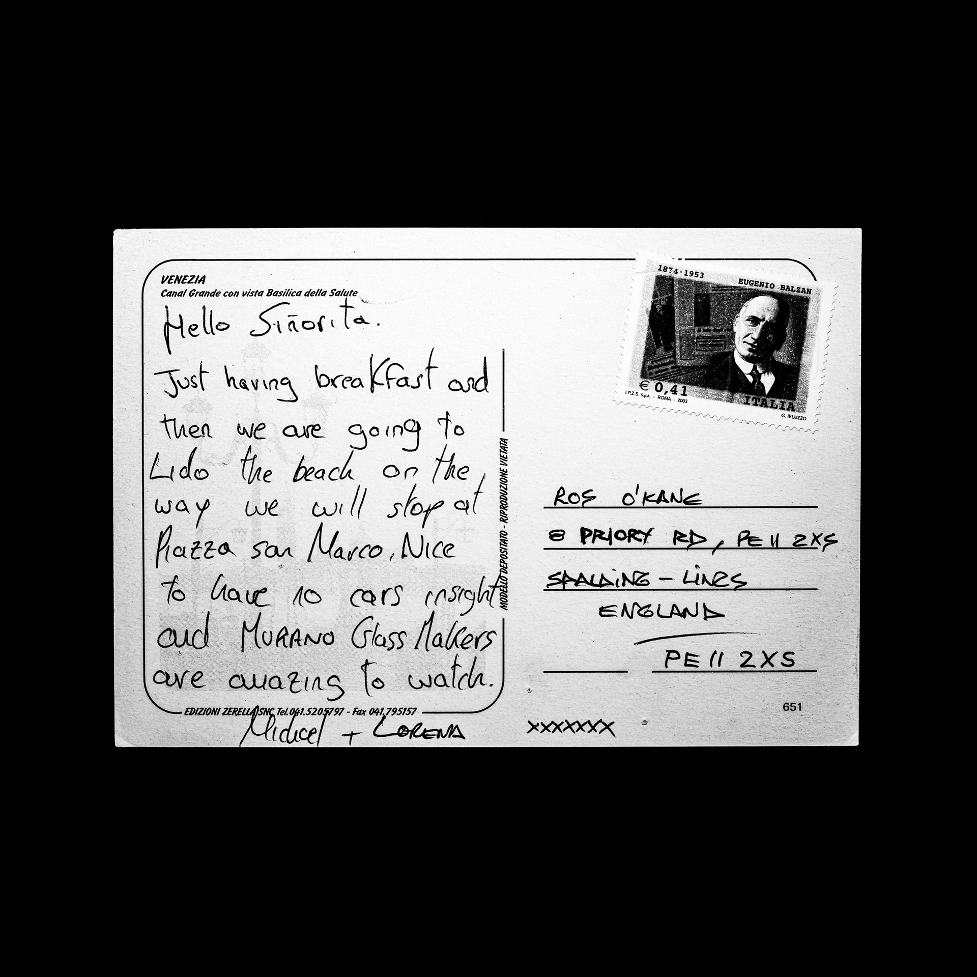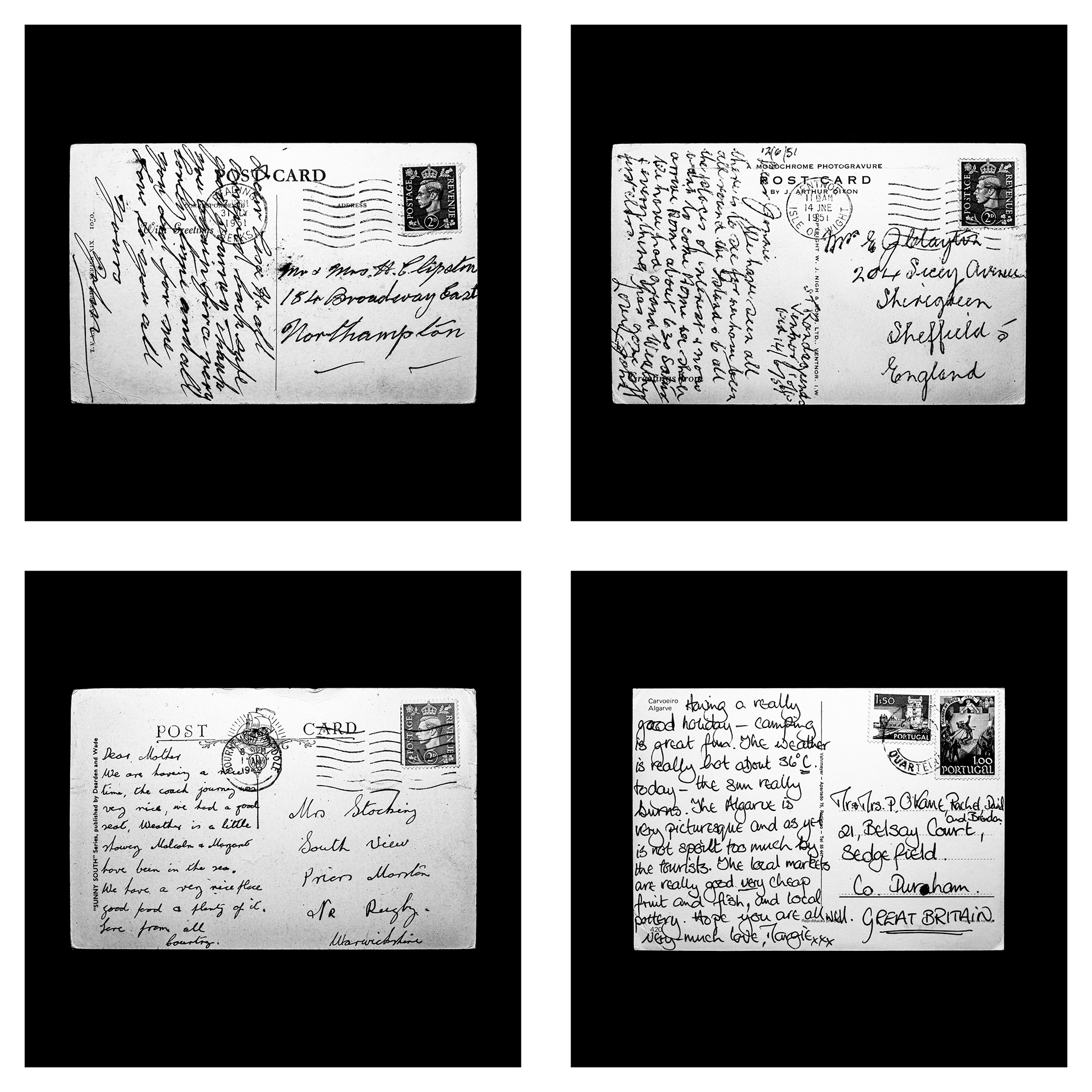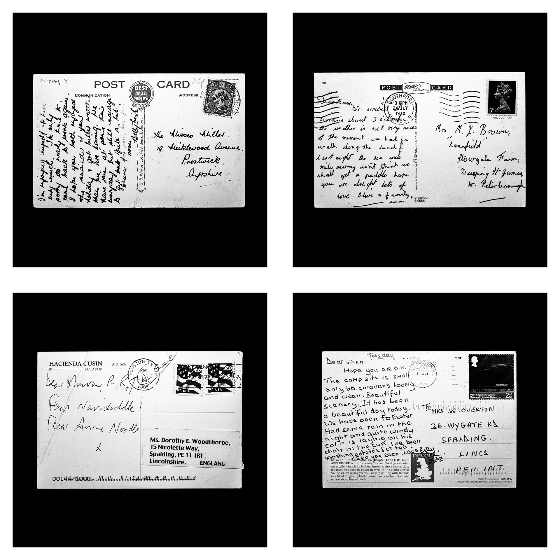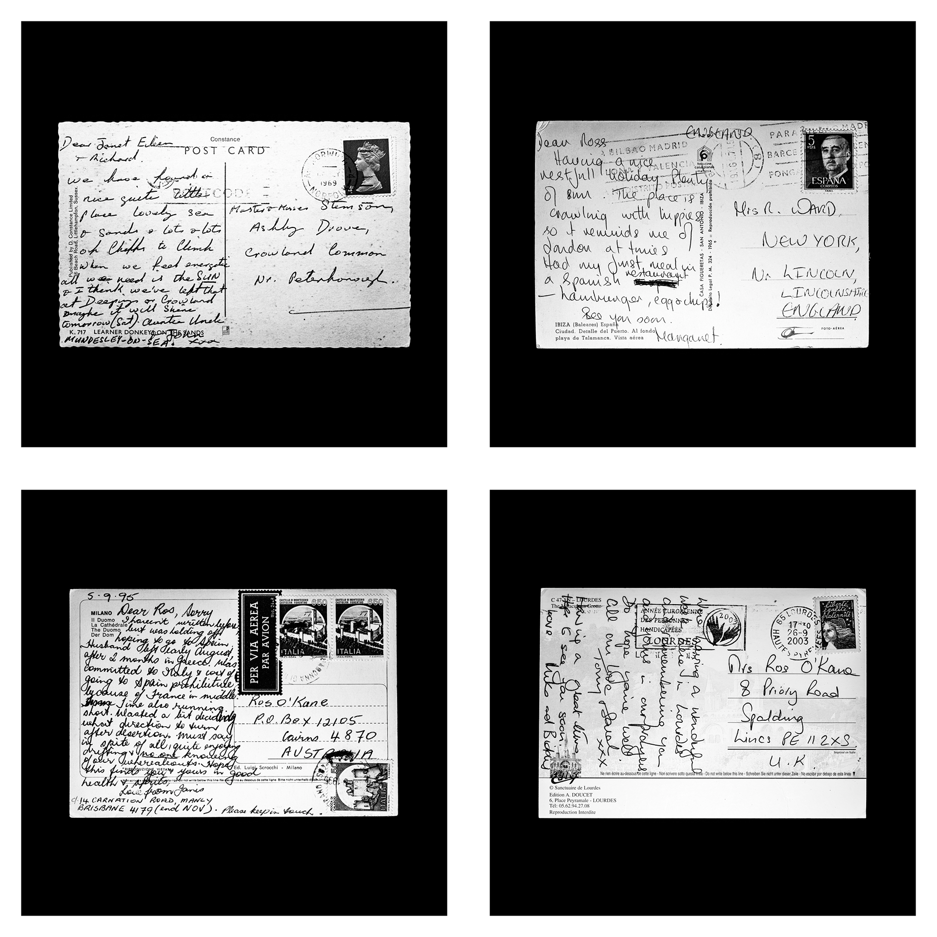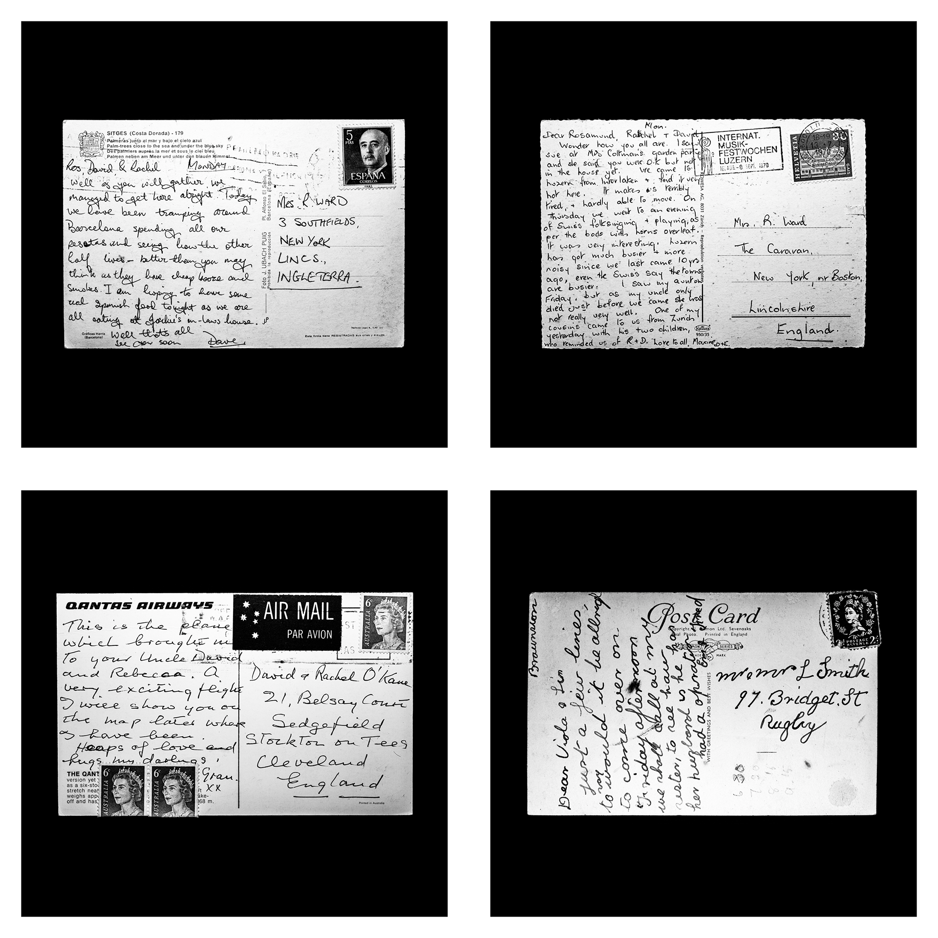 The serial nature of the presentation erases the specificity of the sender, turning handwriting and greetings into fossilized traces of an interaction bureaucratized by the postal service. Intimacy is turned into an archive, and the system of communication prevails over the content of the message.