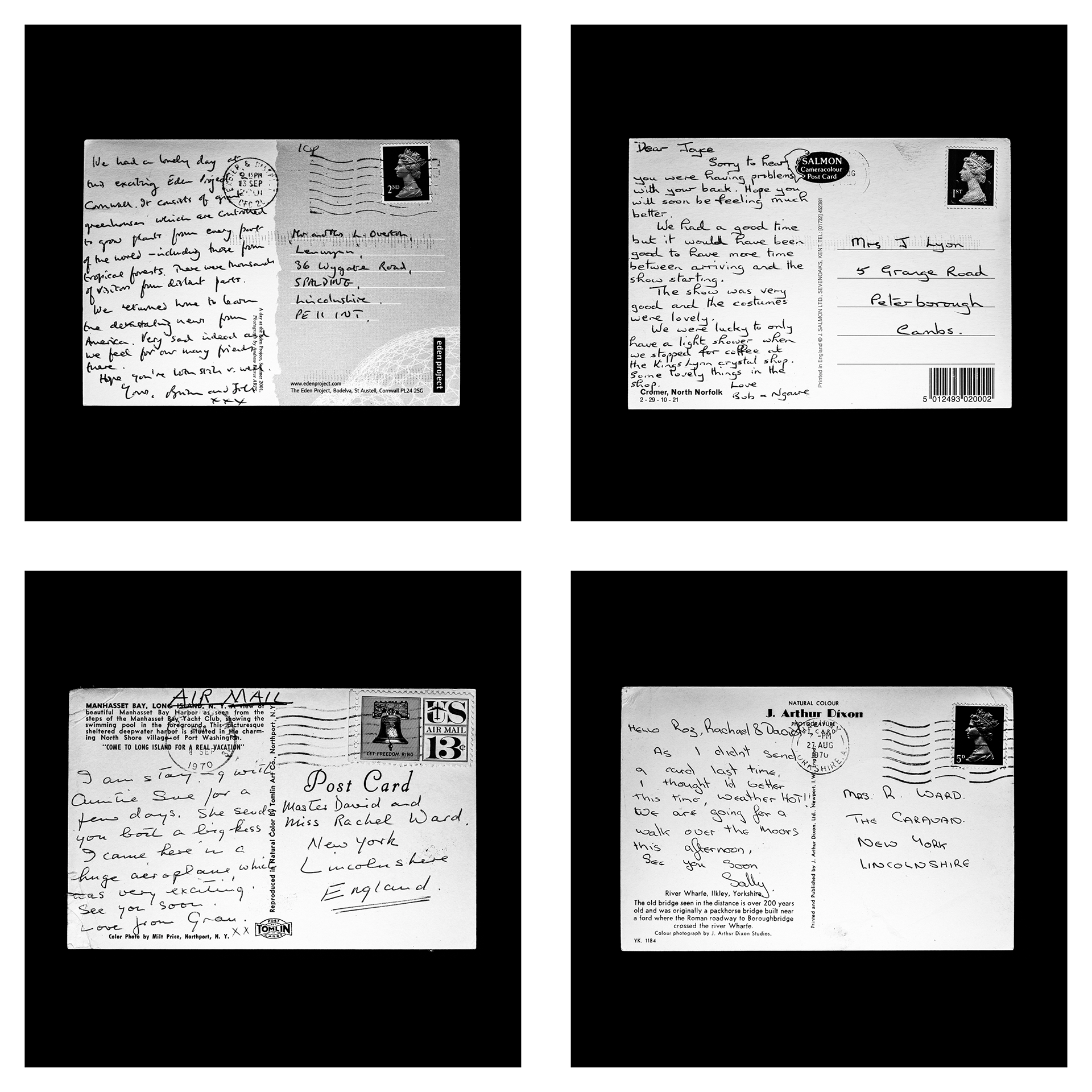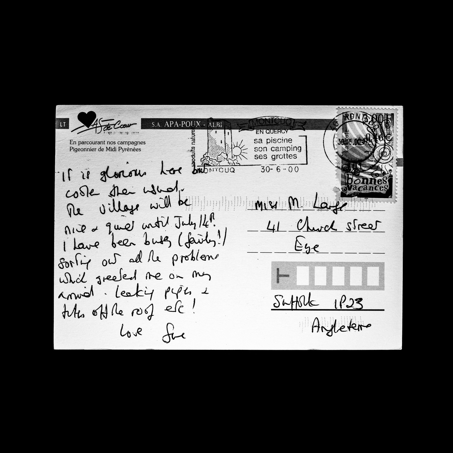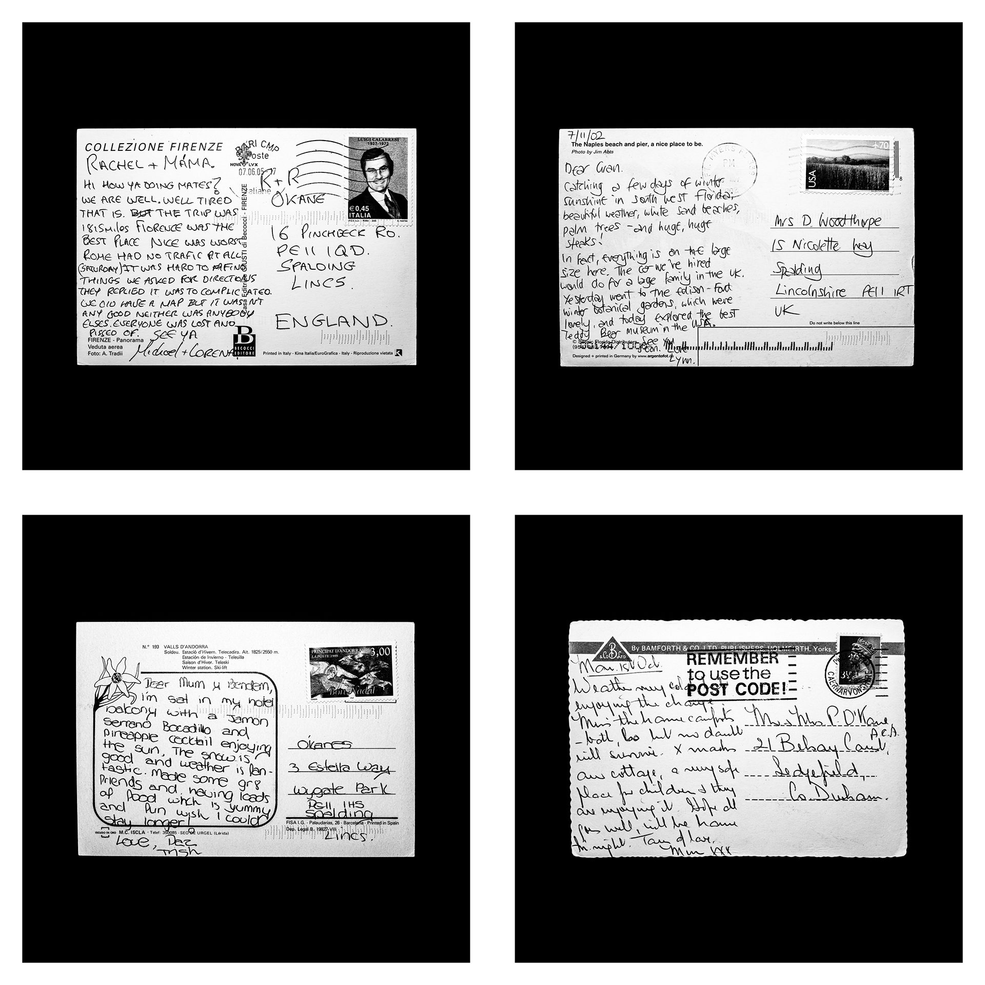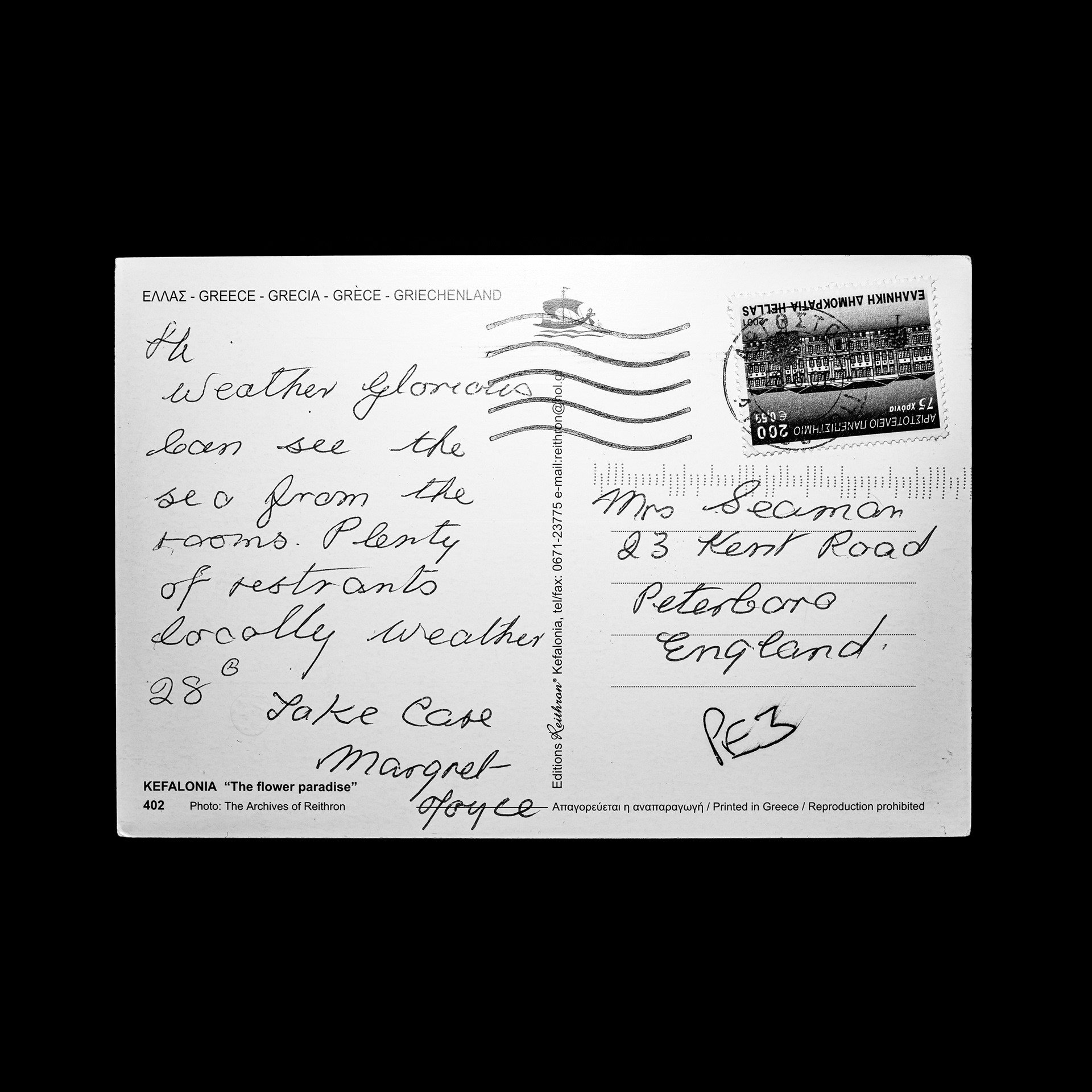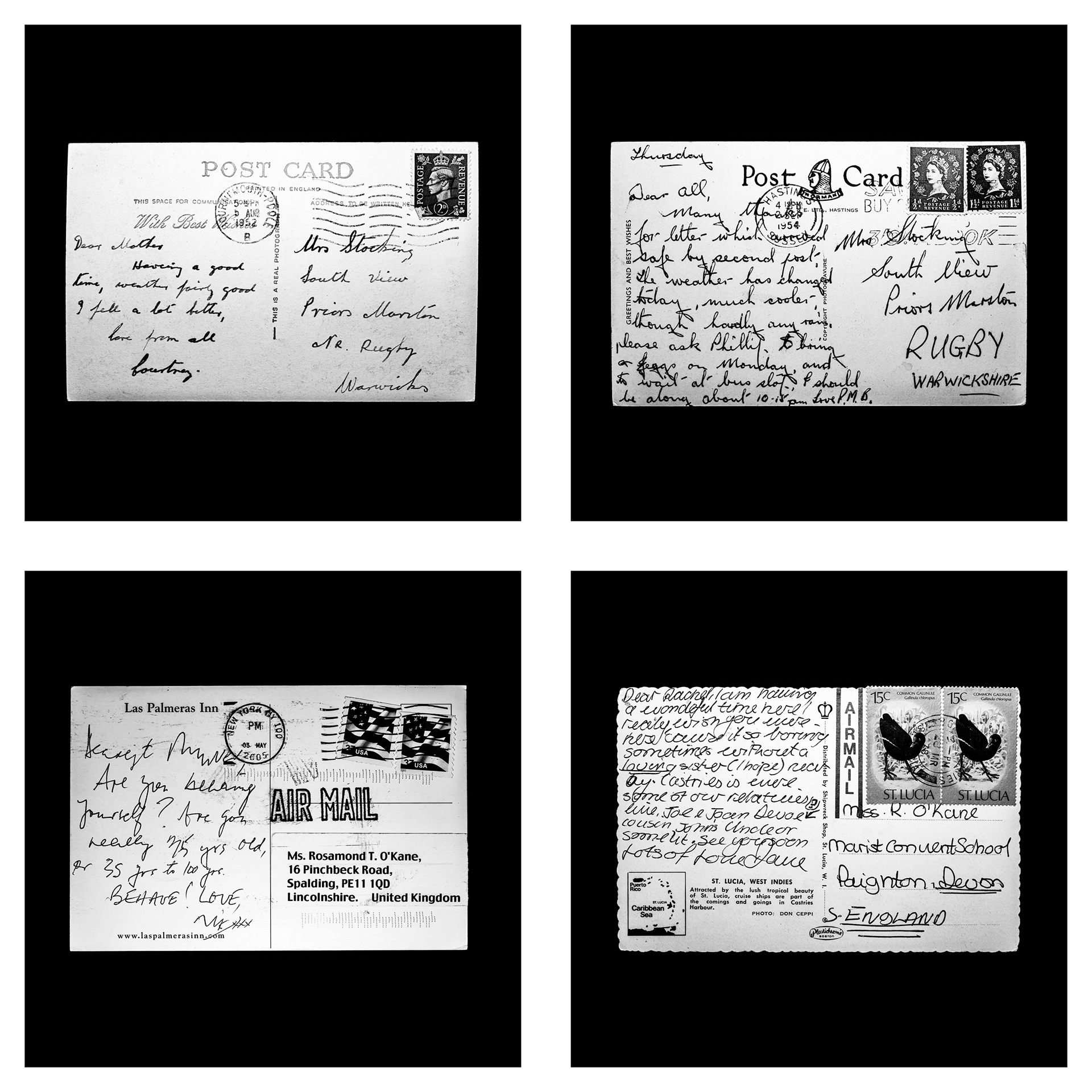 The serial nature of the presentation erases the specificity of the sender, turning handwriting and greetings into fossilized traces of an interaction bureaucratized by the postal service. Intimacy is turned into an archive, and the system of communication prevails over the content of the message.