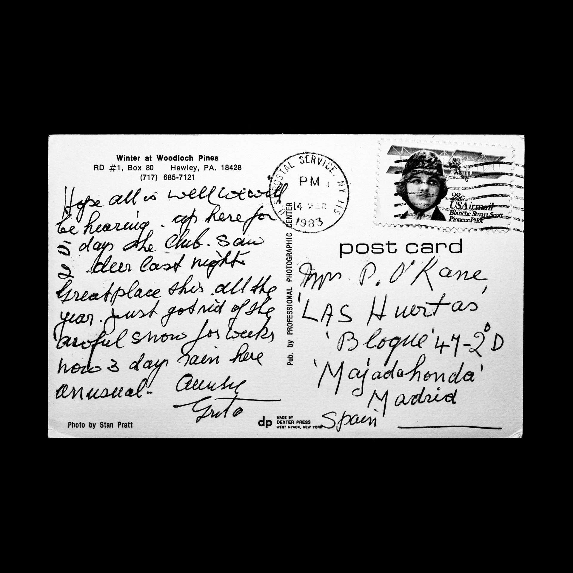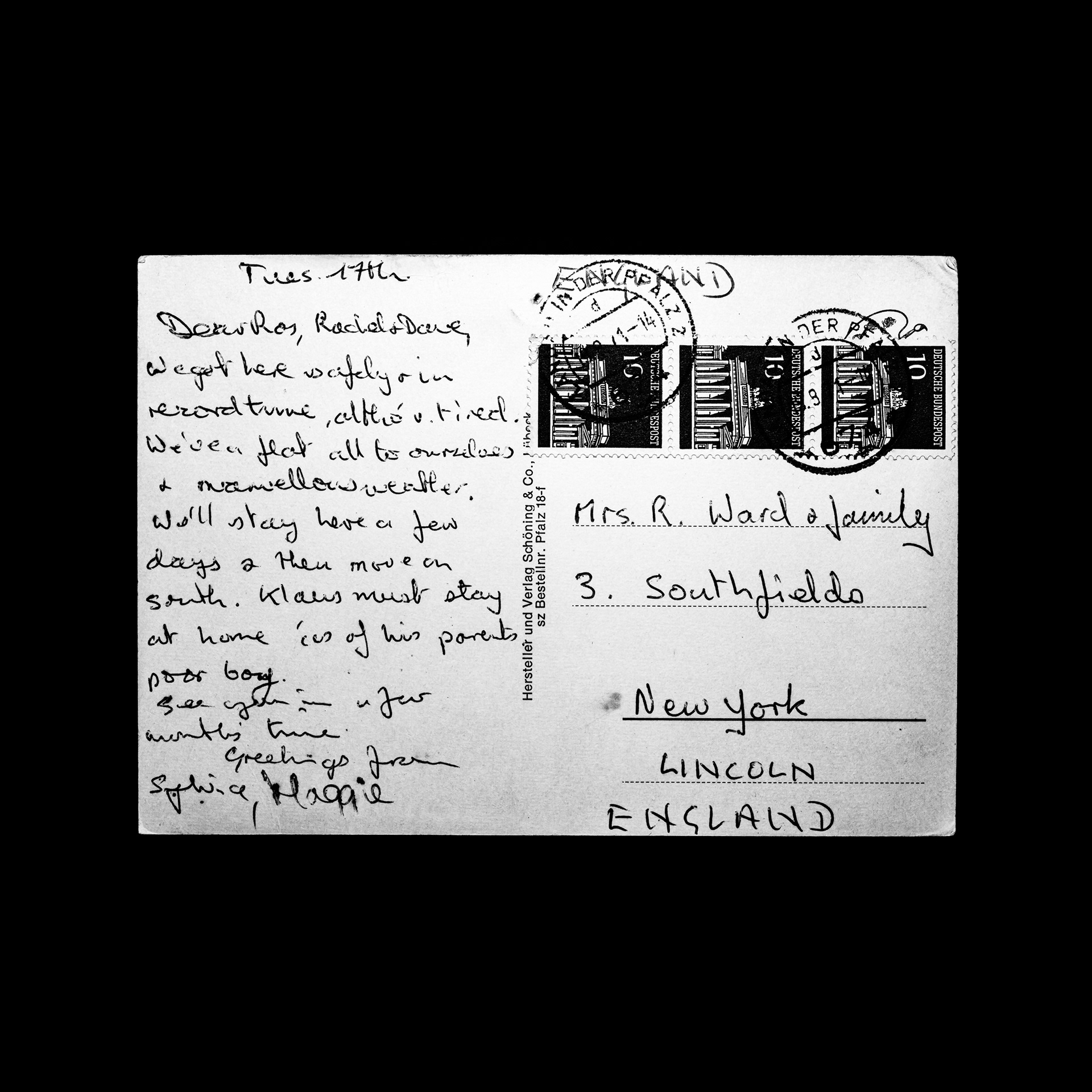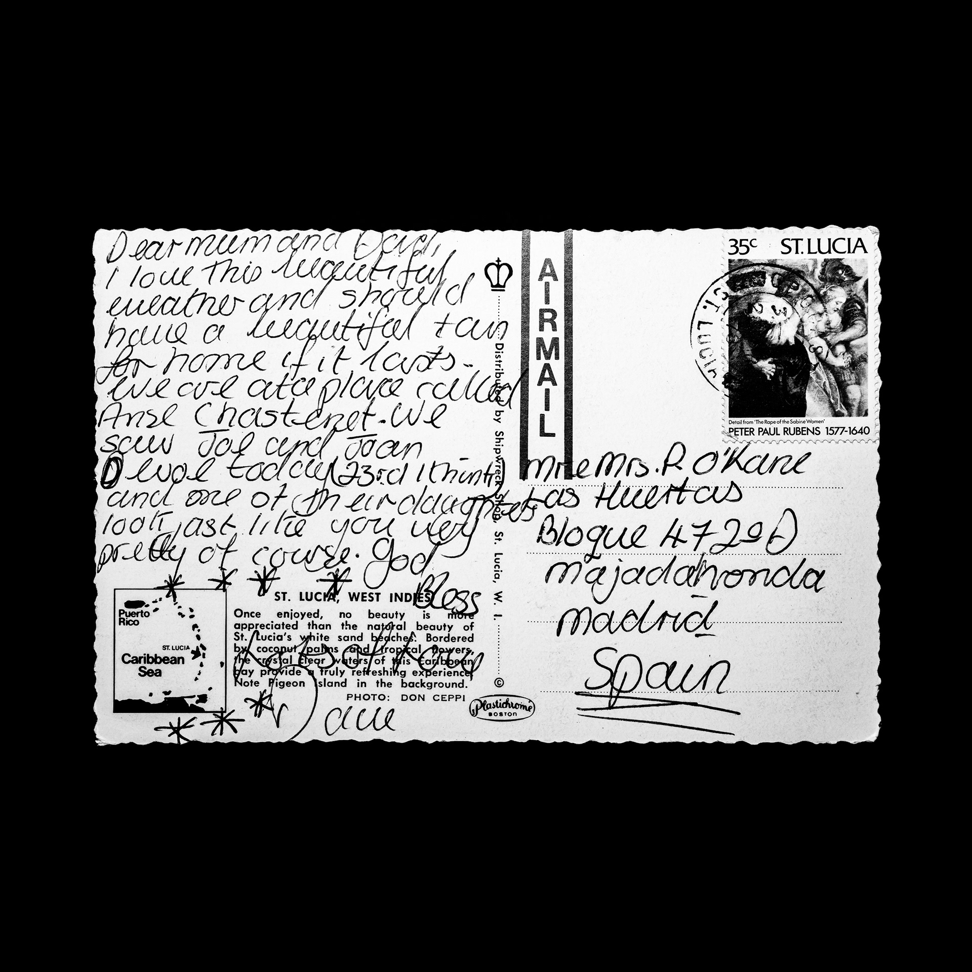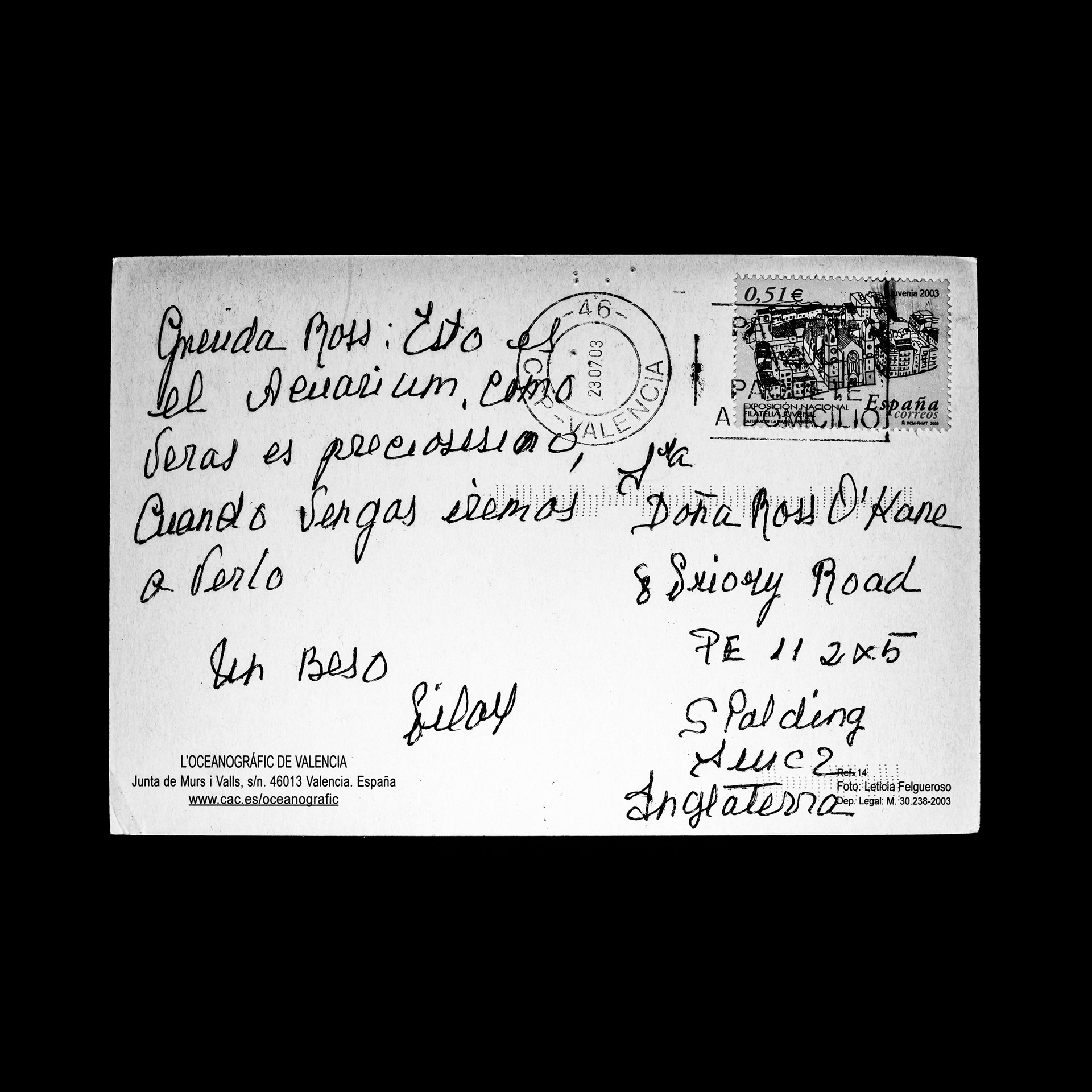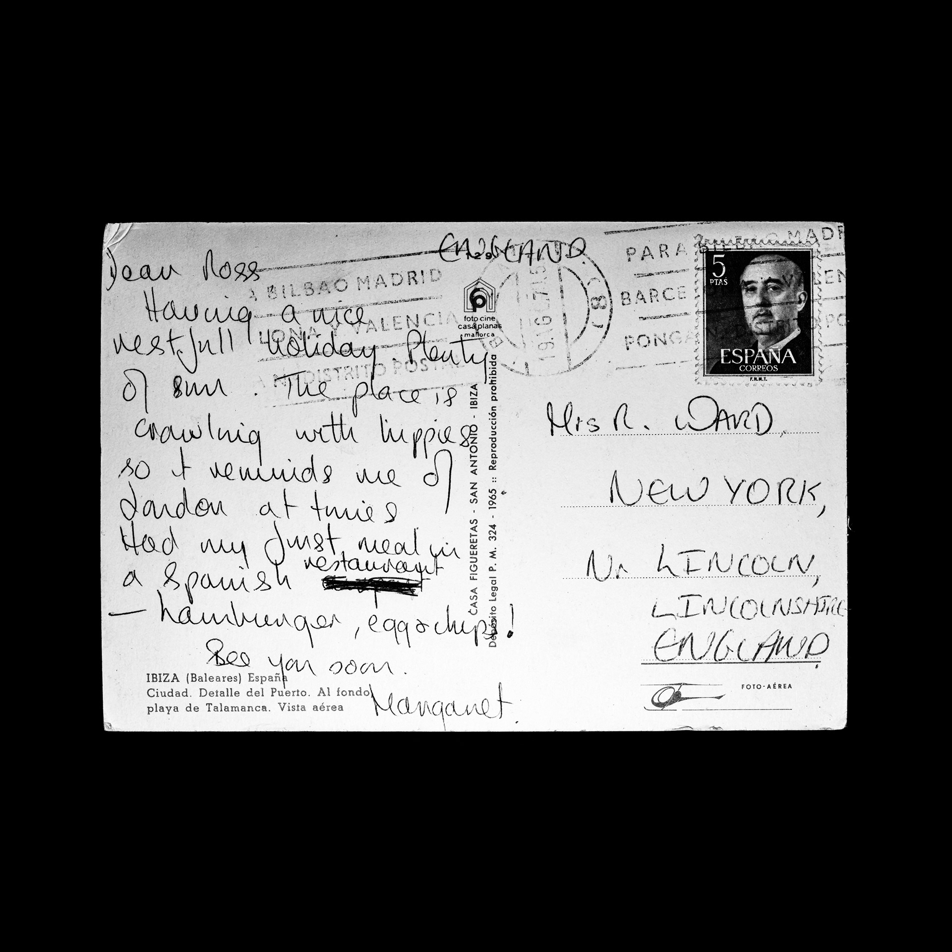 The serial nature of the presentation erases the specificity of the sender, turning handwriting and greetings into fossilized traces of an interaction bureaucratized by the postal service. Intimacy is turned into an archive, and the system of communication prevails over the content of the message.