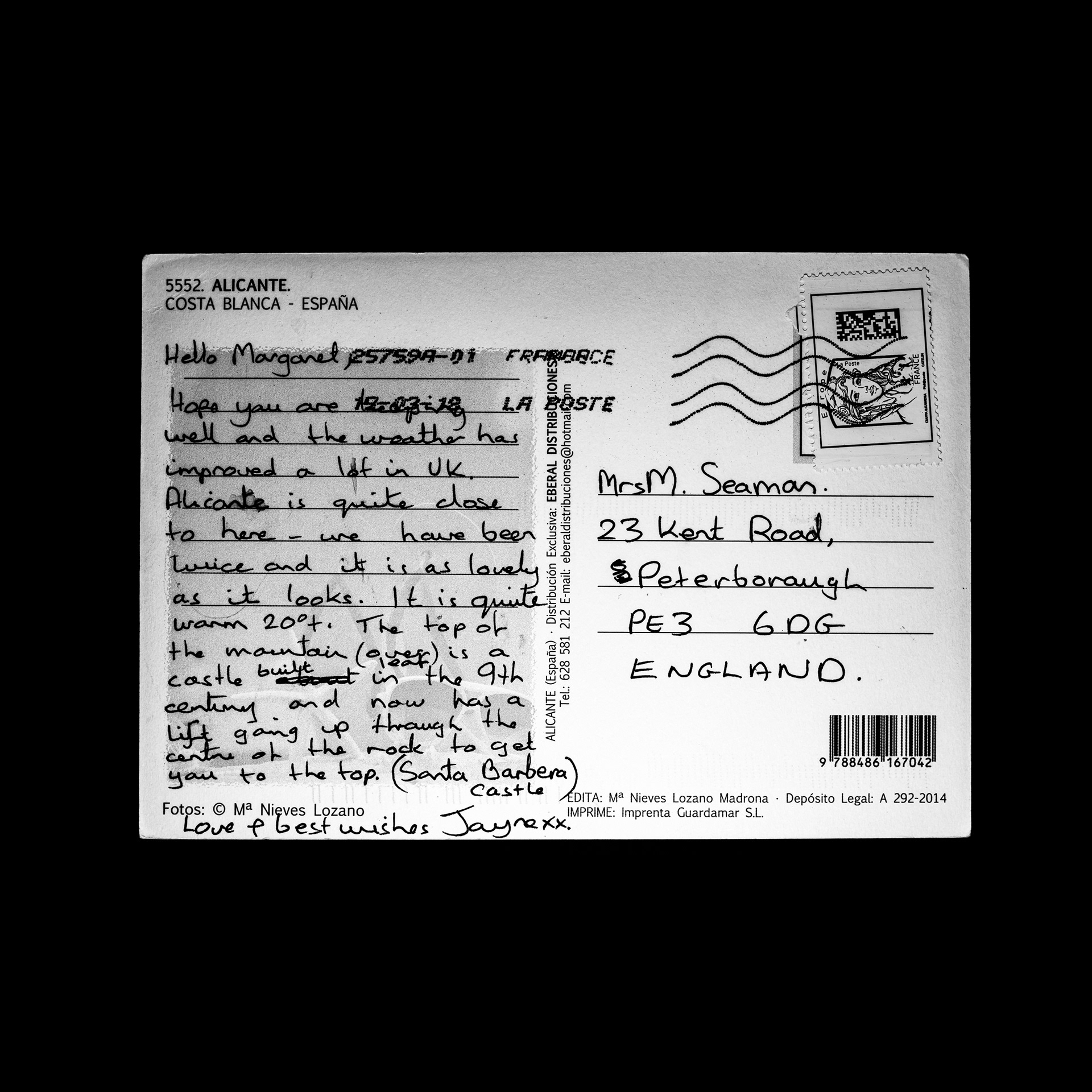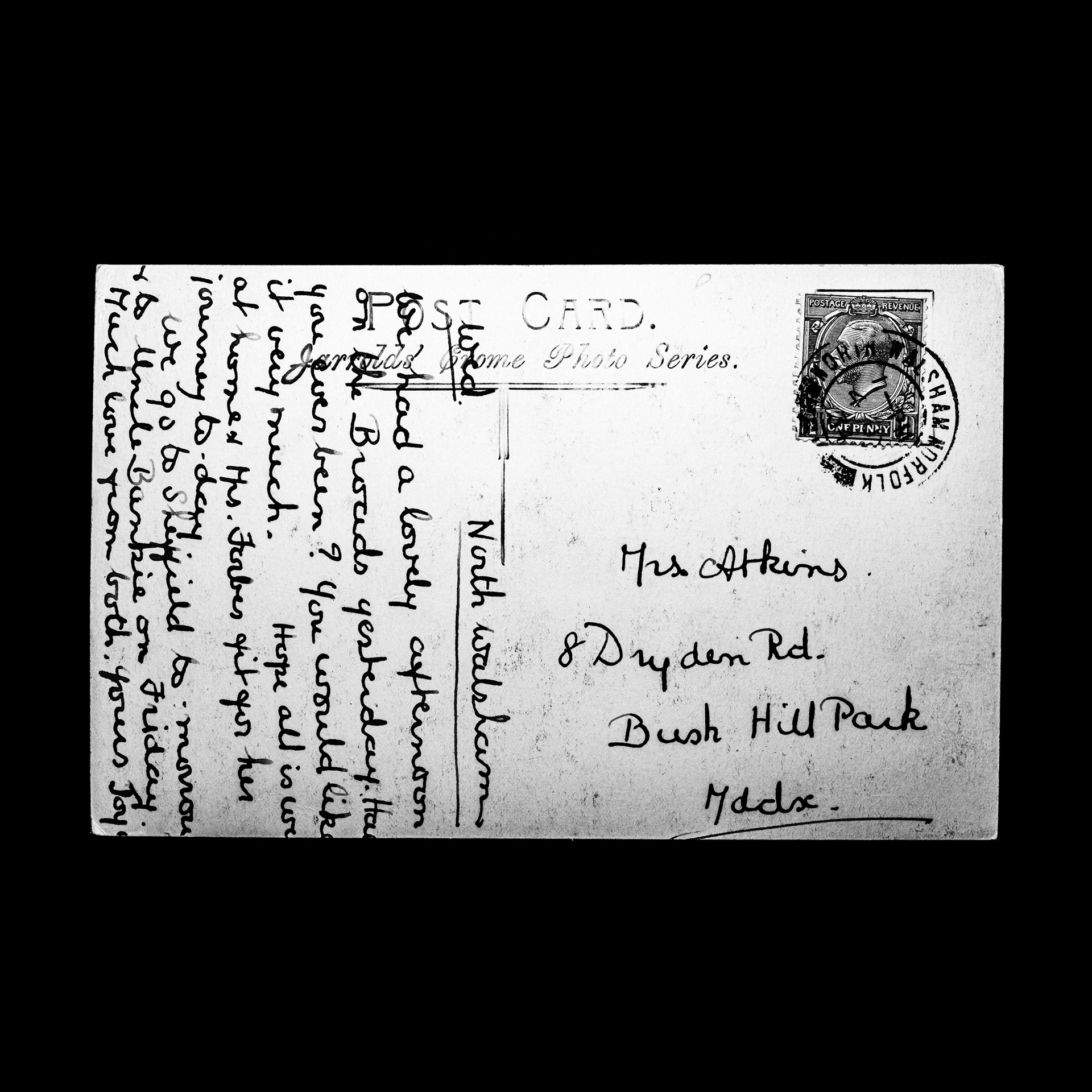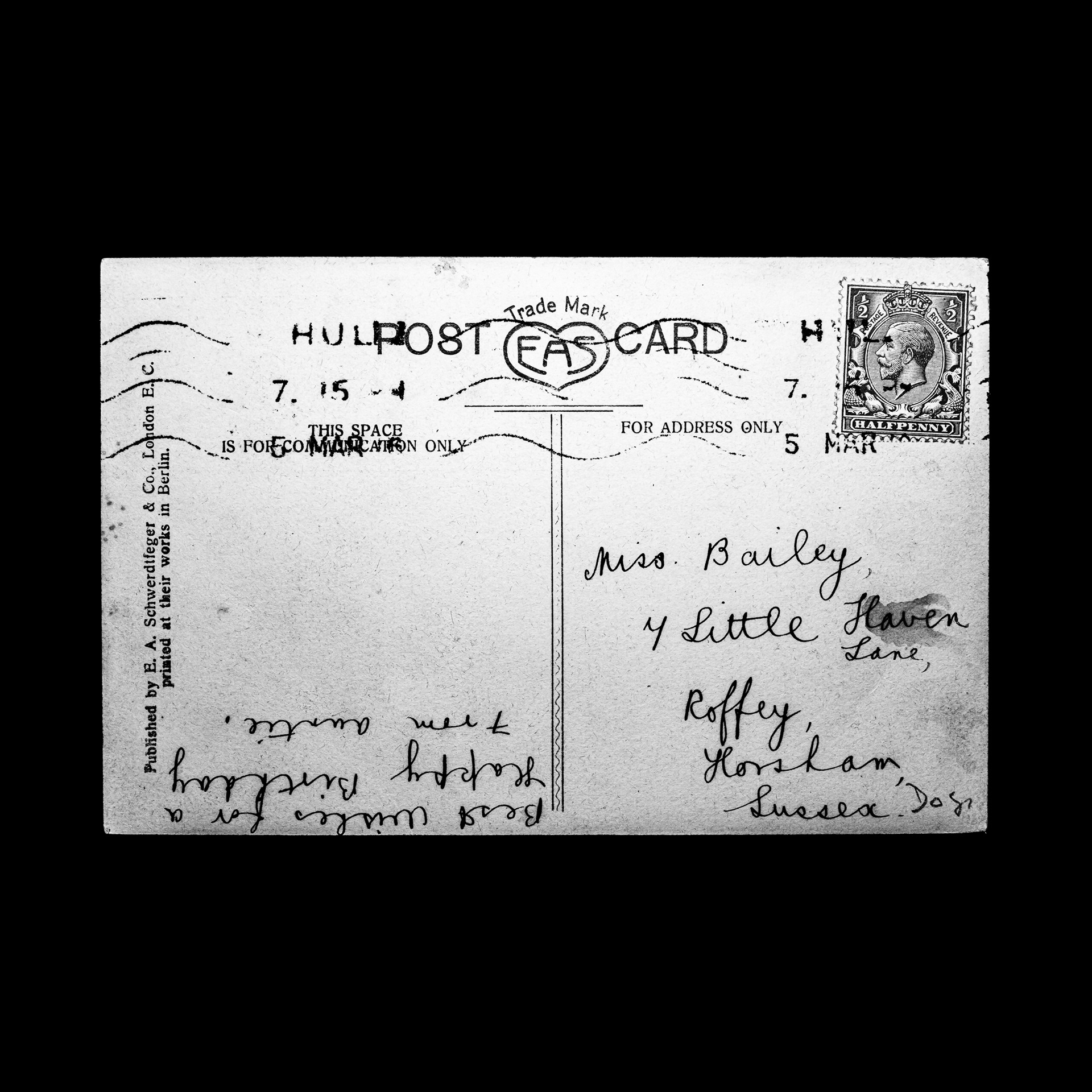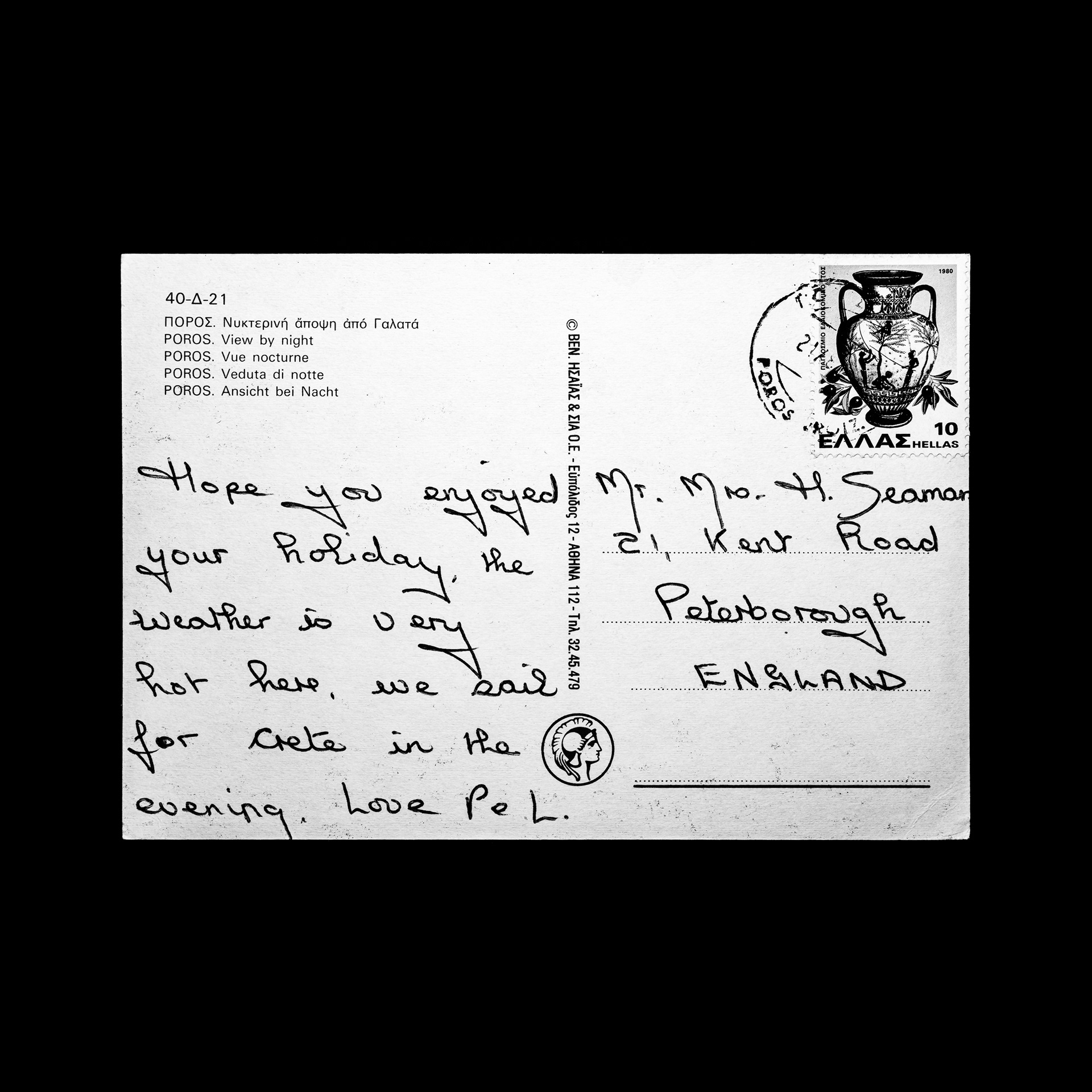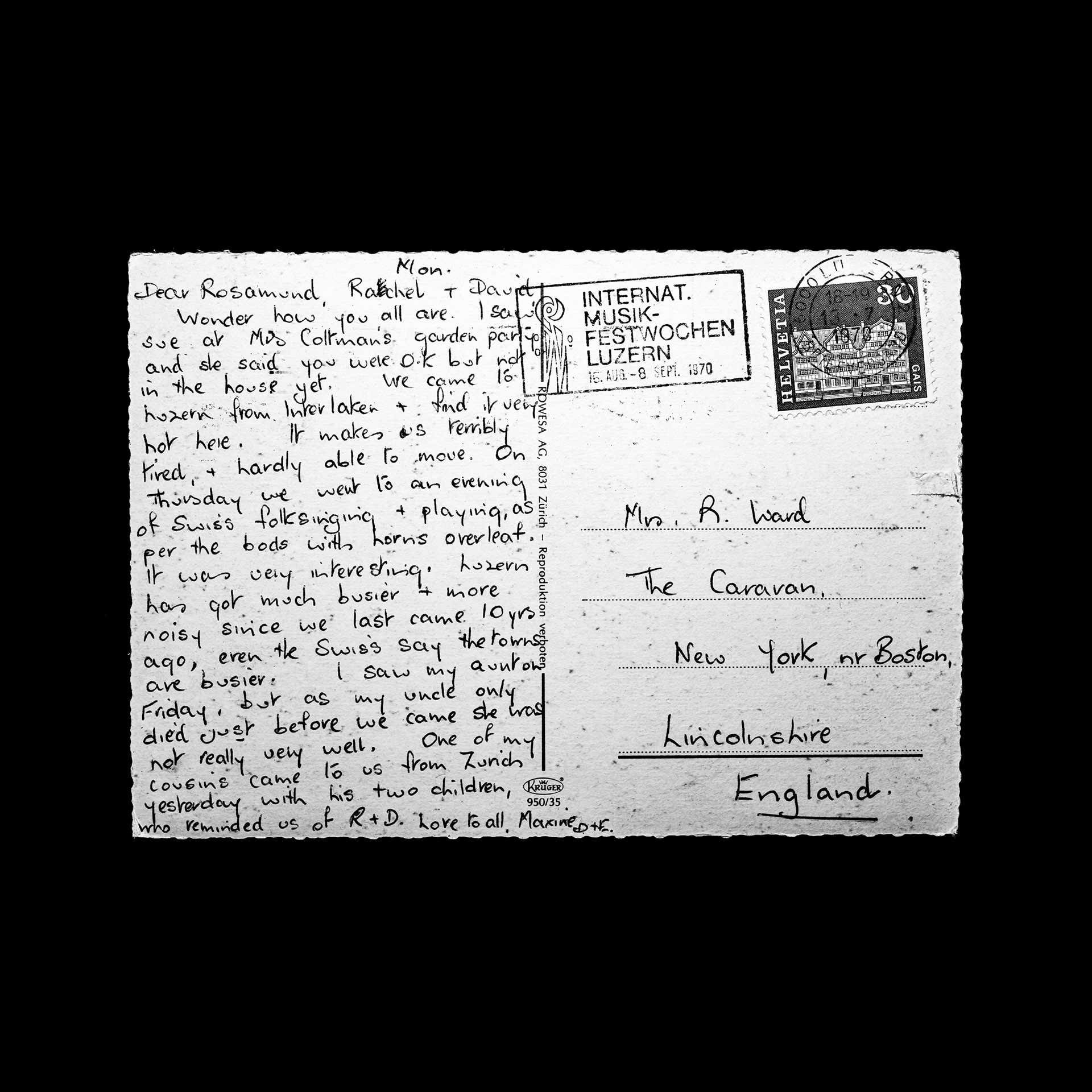 The serial nature of the presentation erases the specificity of the sender, turning handwriting and greetings into fossilized traces of an interaction bureaucratized by the postal service. Intimacy is turned into an archive, and the system of communication prevails over the content of the message.