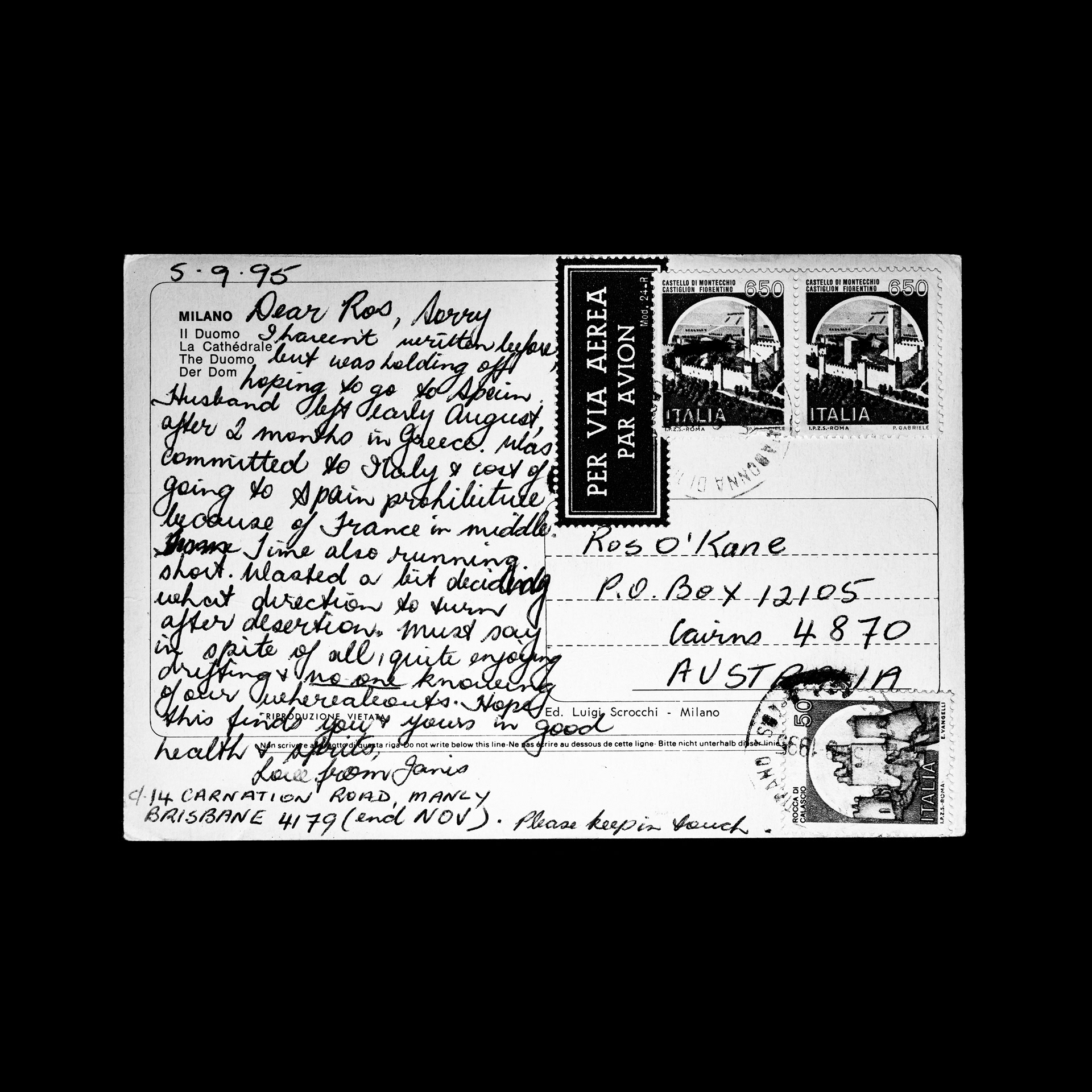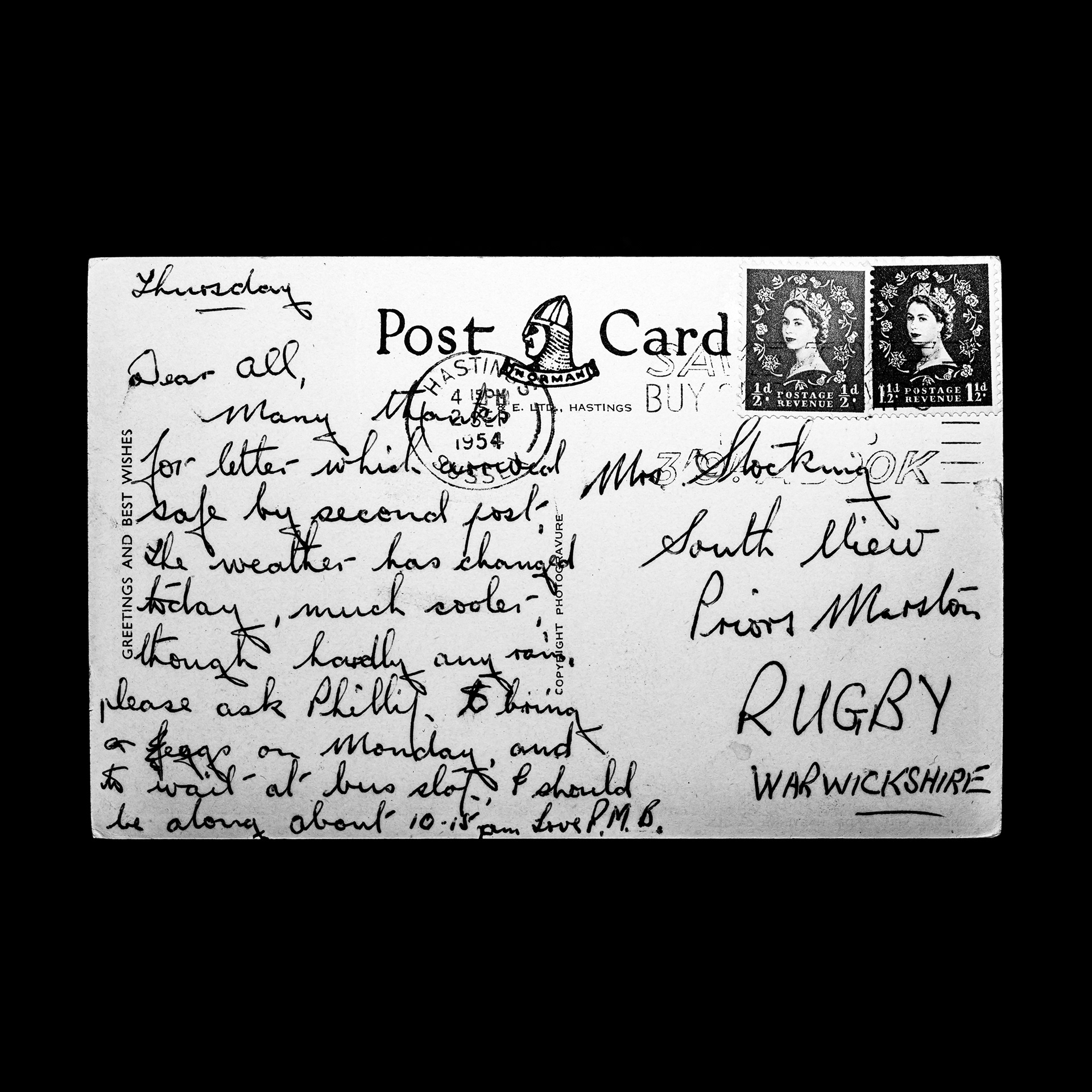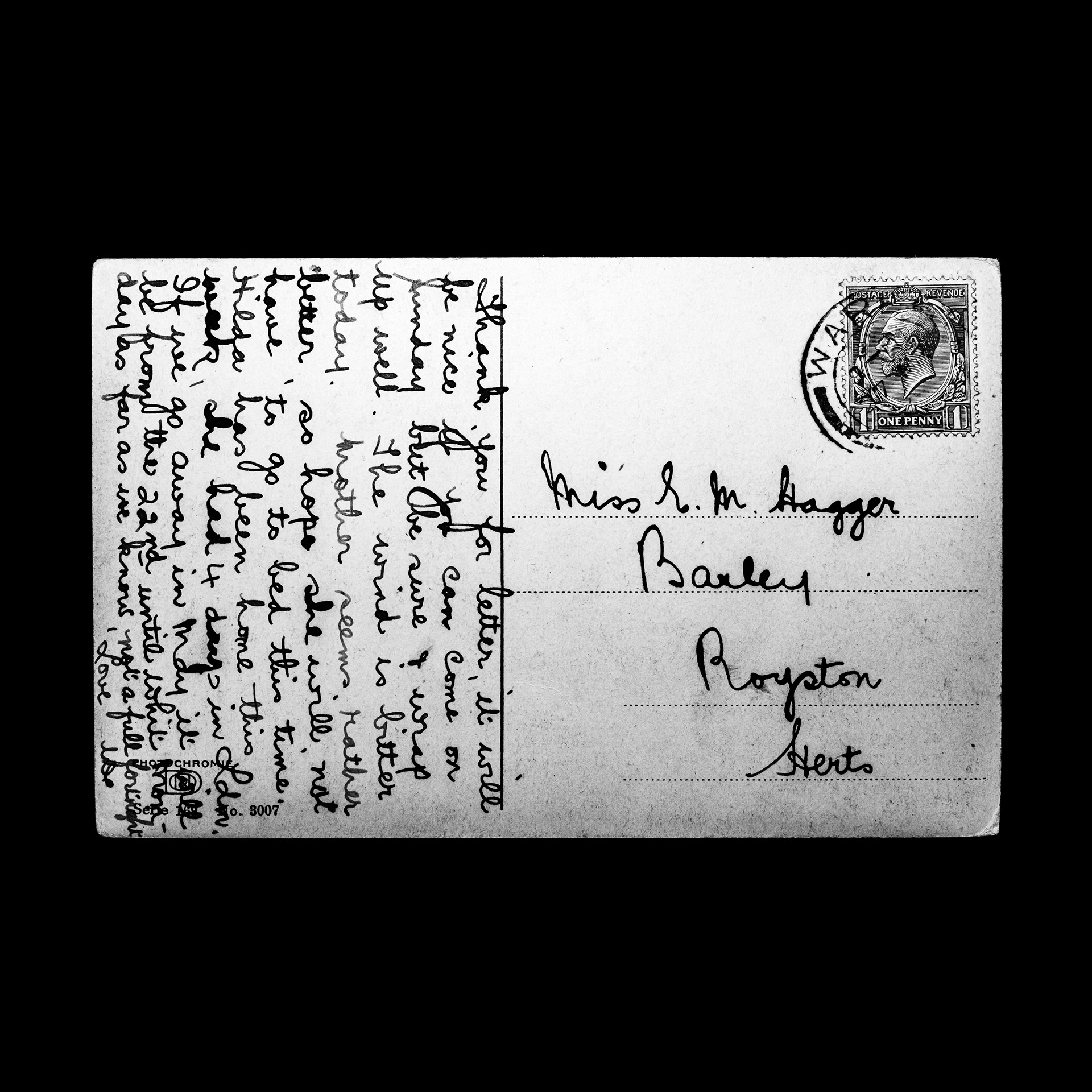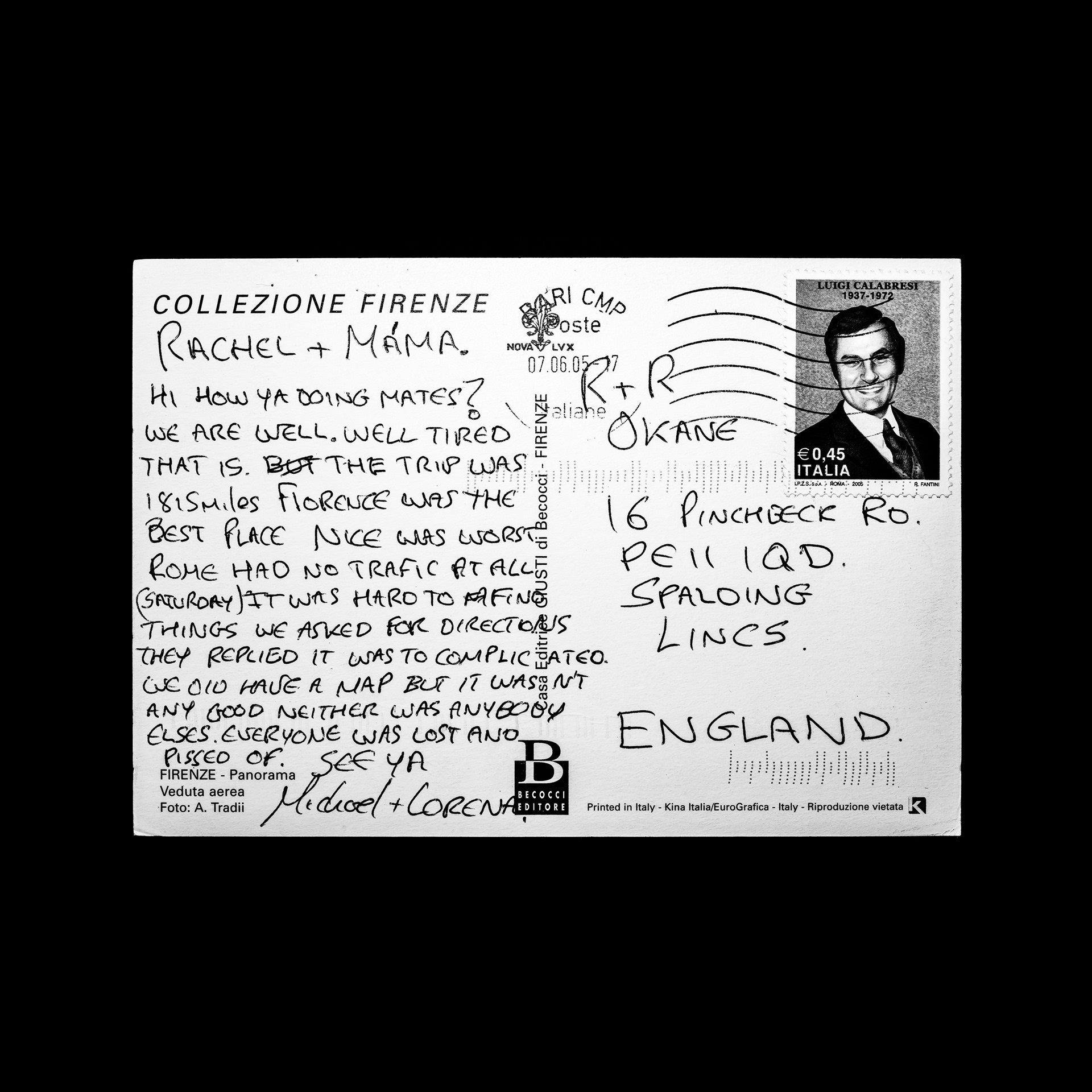 The serial nature of the presentation erases the specificity of the sender, turning handwriting and greetings into fossilized traces of an interaction bureaucratized by the postal service. Intimacy is turned into an archive, and the system of communication prevails over the content of the message.