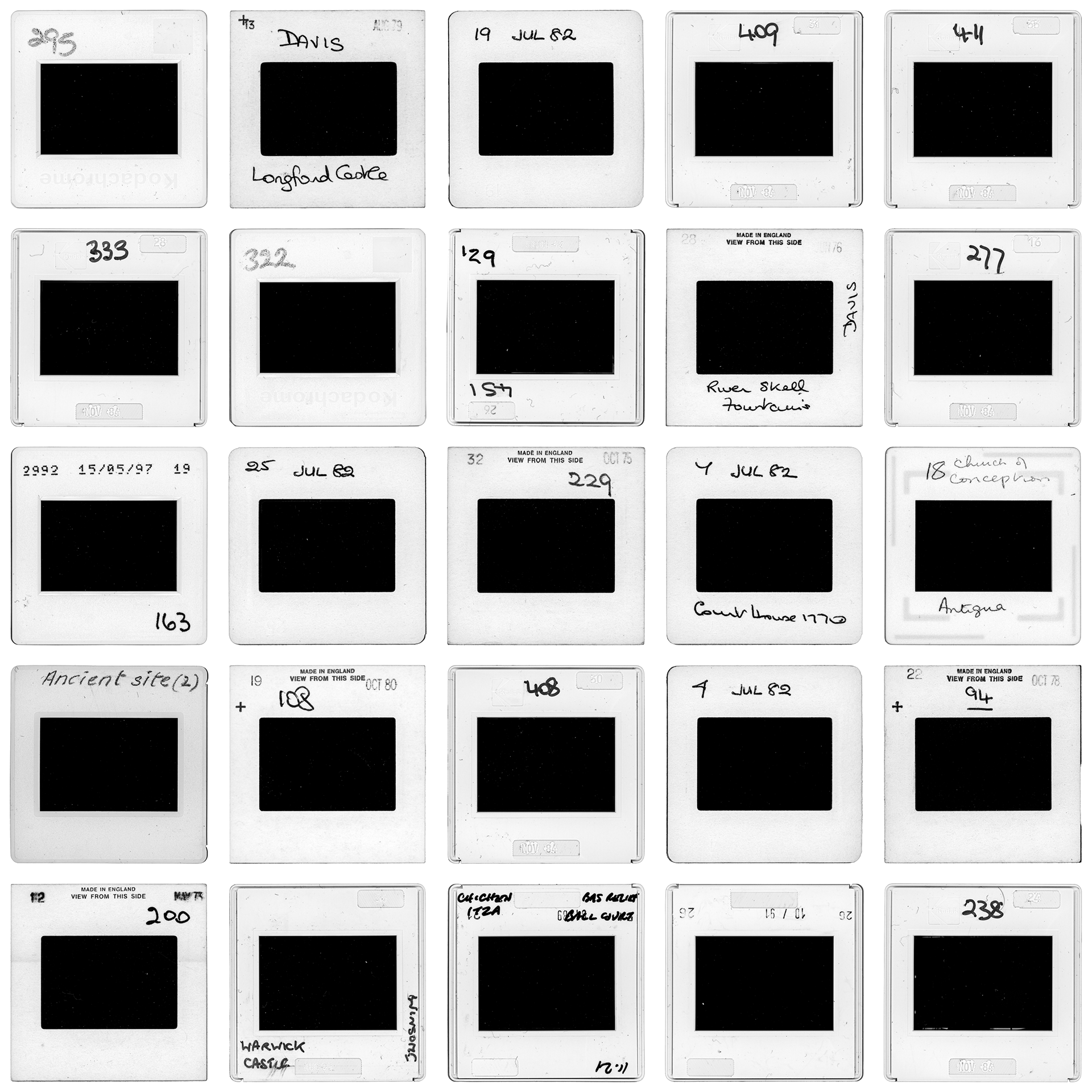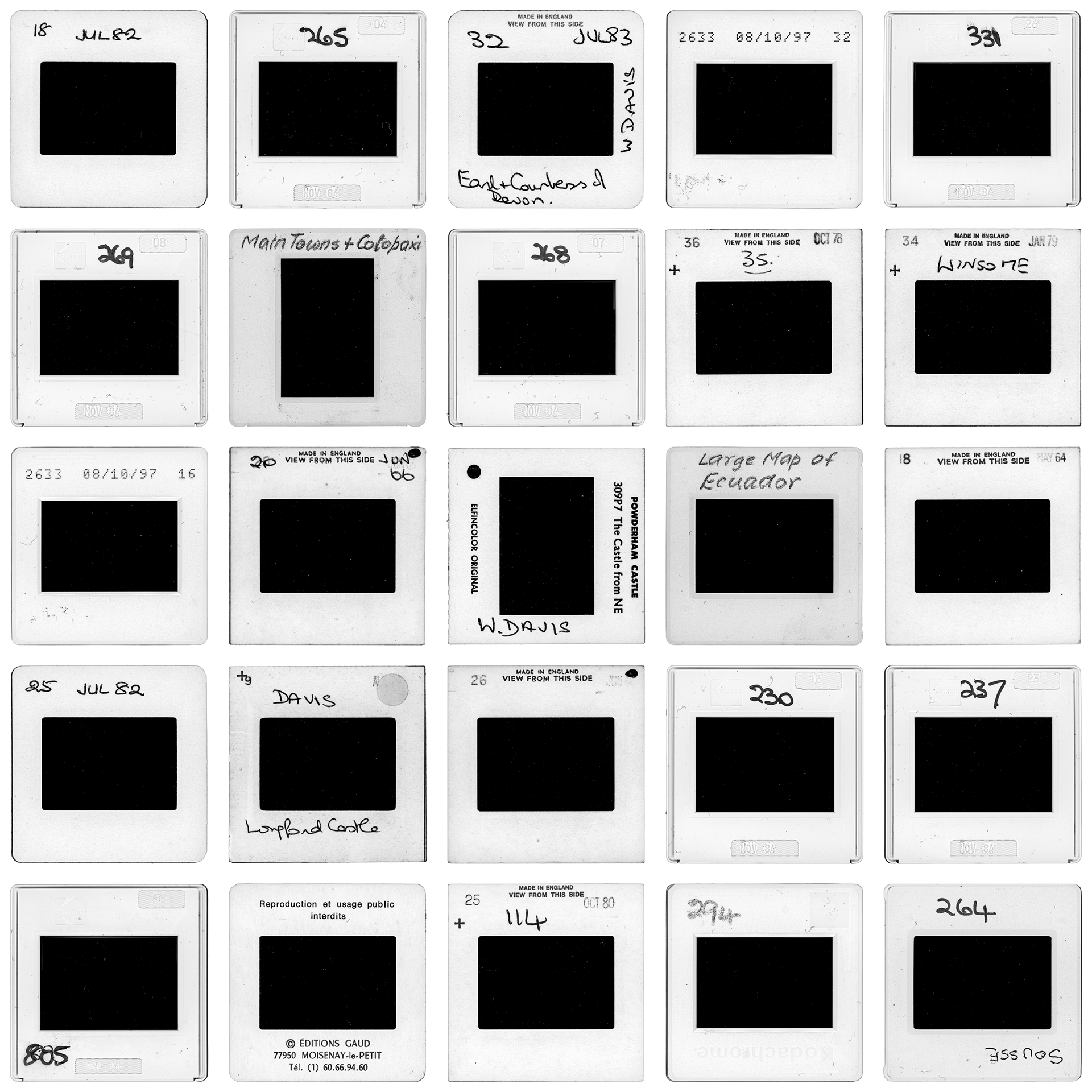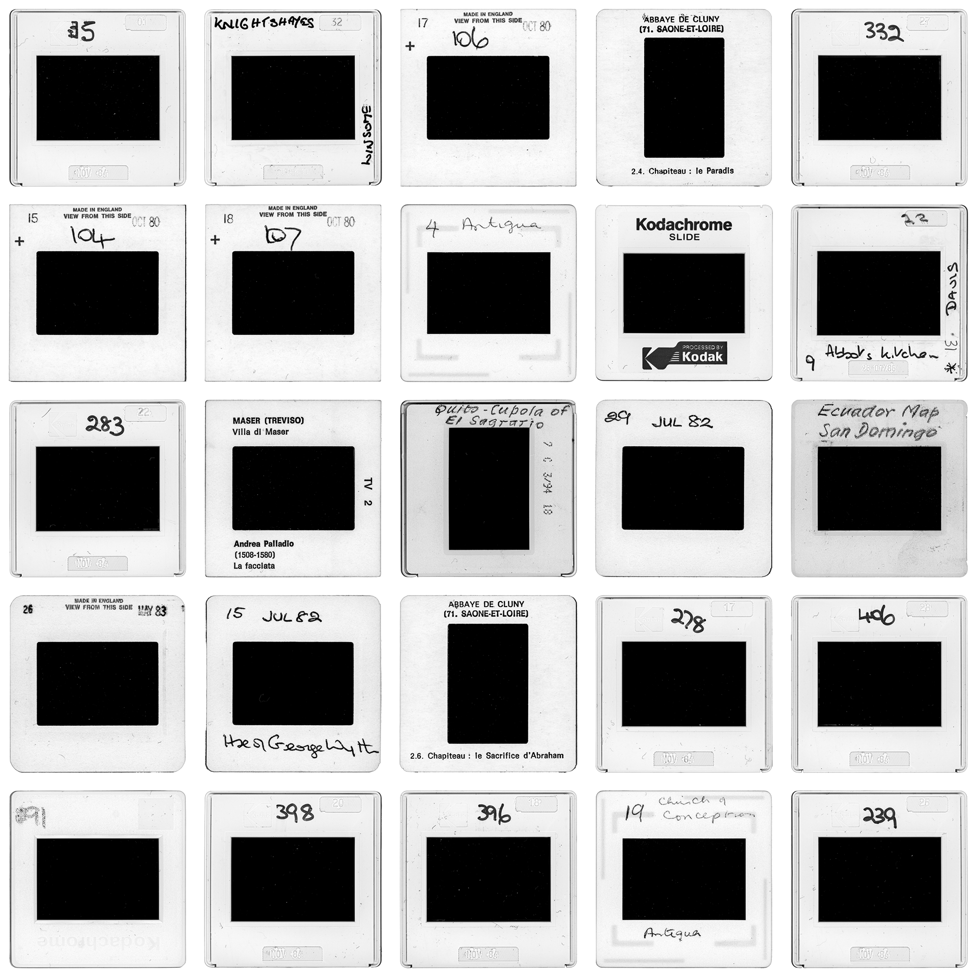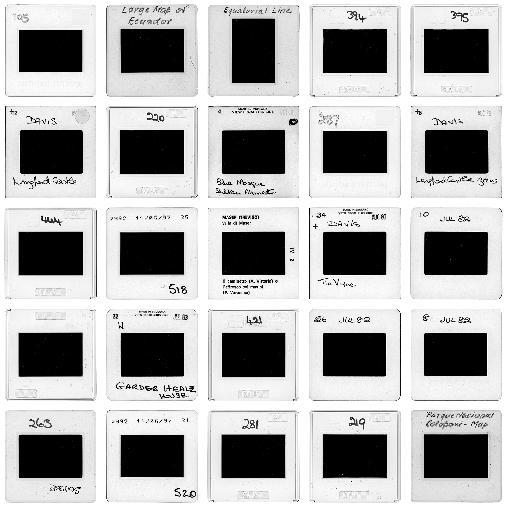 The 35mm slide is a medium designed to operate exclusively via transmitted light. The extinction of the hardware required for this decoding renders the visual data currently inaccessible. The project documents this infrastructural block: the mounts are acquired through a frontal light scan, thereby disabling the original reading protocol. The light beam halts against the inert surface of the film, yielding a black square.